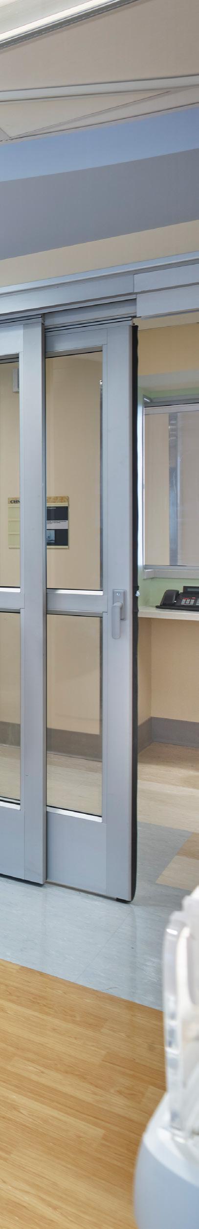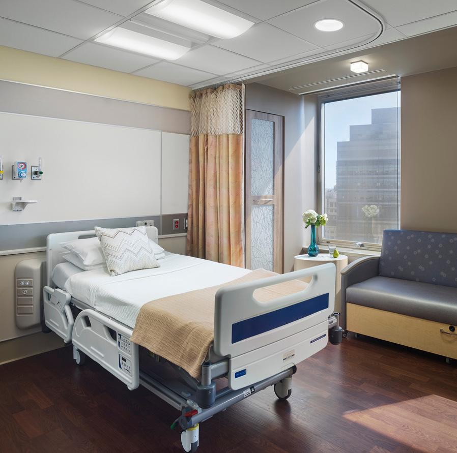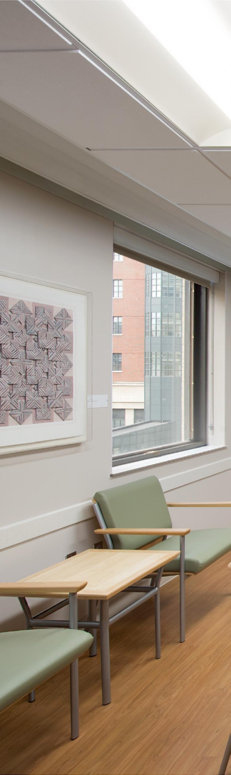 patient experience. Patient rooms incorporate inboard patient bathrooms/showers located on the headwall to improve patient safety and maximize the opportunity for expansive views. Family zones in each room provide family members their own space for respite while ensuring they are included in the patient’s healing process.