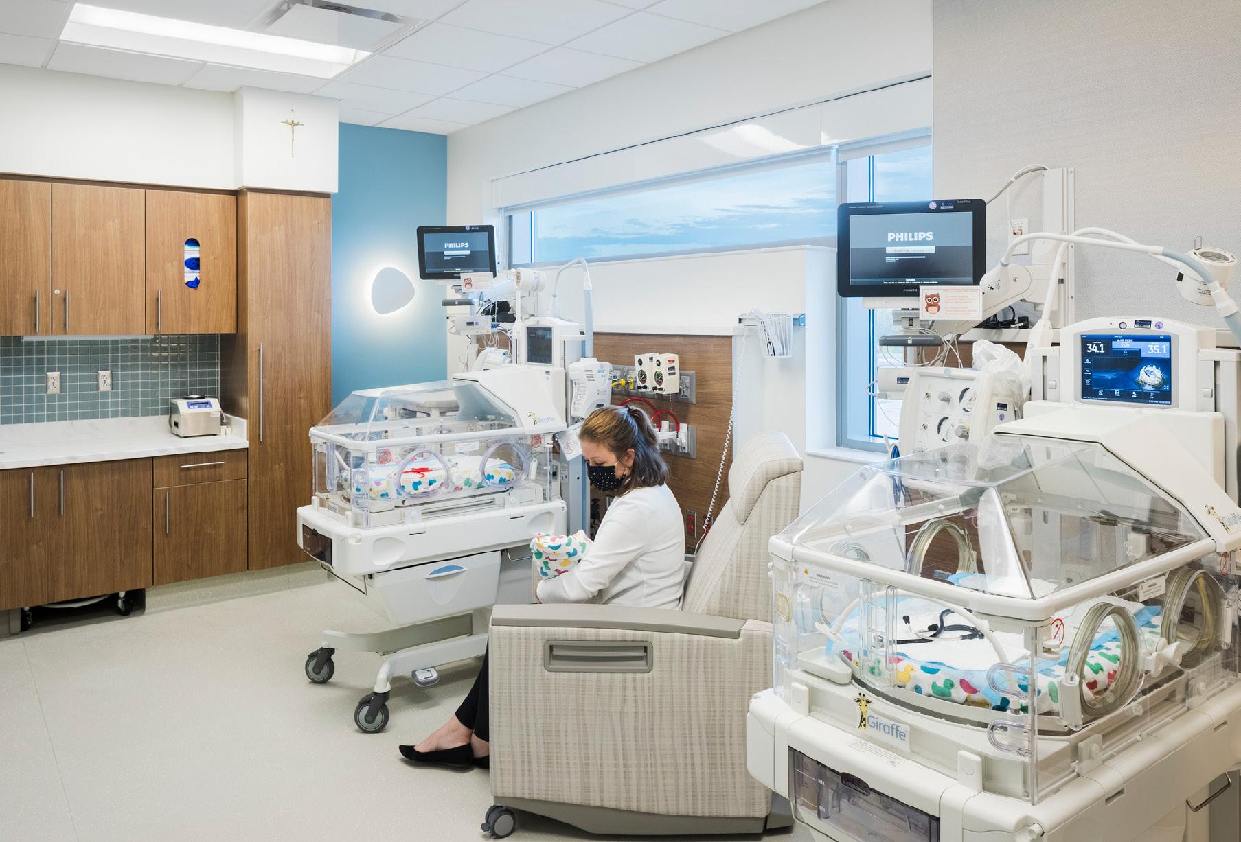 With no available space for a ground level addition, we expanded the existing NICU on top of an existing building to create room for the new CICU. The 21,000 SF renovation/ addition provides Level II and III neonatal services and features a family transition room on the unit to educate families about the special care their infant will need at home. We positioned a new hybrid OR and cath lab adjacent to the CICU so that it can be used as a prep and recovery space for cardiac patients. By phasing the expansion, the existing NICU and CICU were able to continue providing service throughout the project.