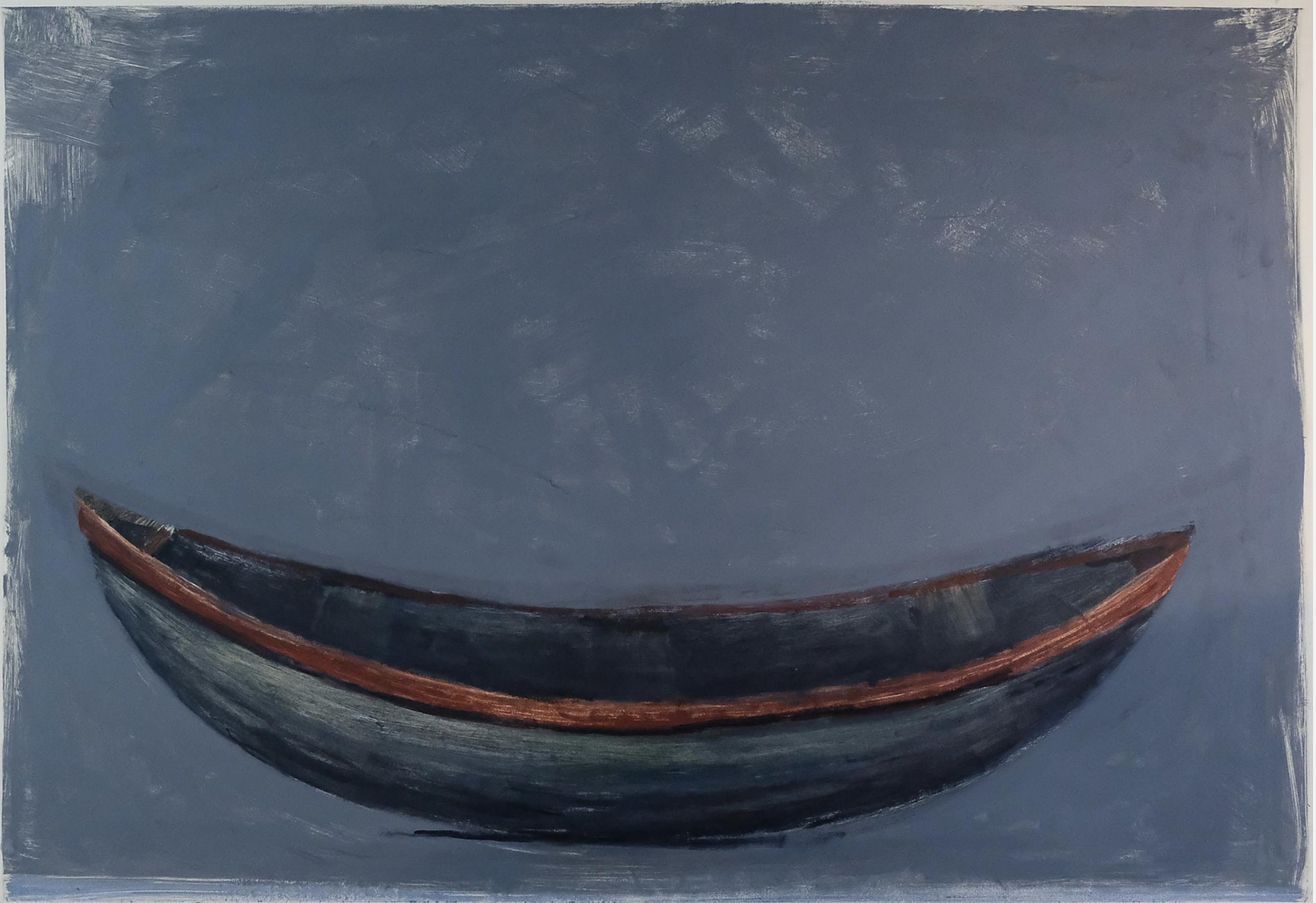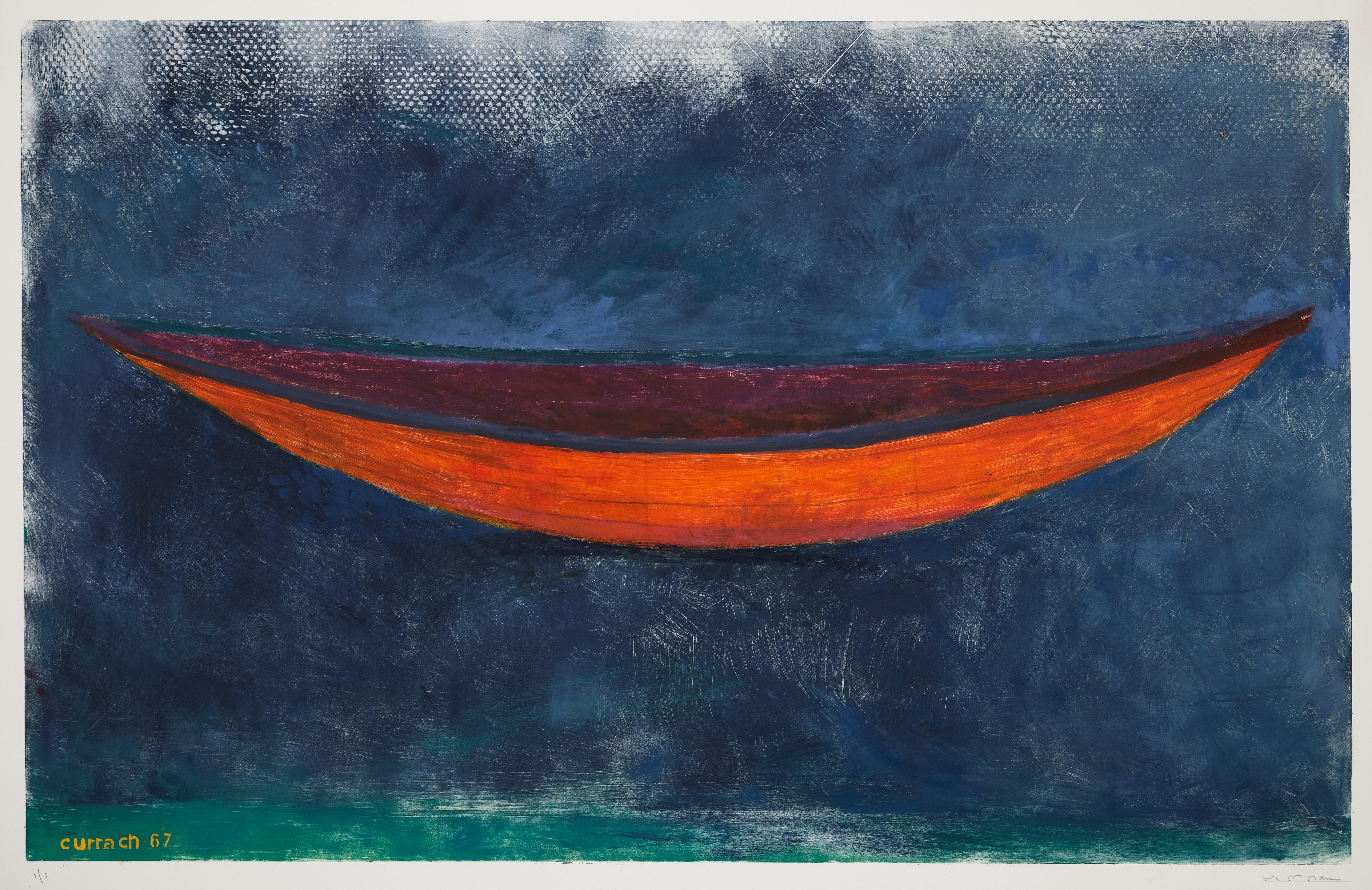 Malcolm Moran has spent the past decade painting Currachs. Moran first discovered Currachs in Ireland when he was doing an art fellowship there. He awoke one morning and looked out of his studio door over the vast expanse of the Atlantic. Between the dots of islands in his view were these tiny boats bouncing about in the sea. From that moment, the Currach became his muse. This boats represent the tenacity and fearlessness of the human spirit. Over the years, the shape has evolved but the spirit remains. Moran makes these boats in oil, monotype and collage.