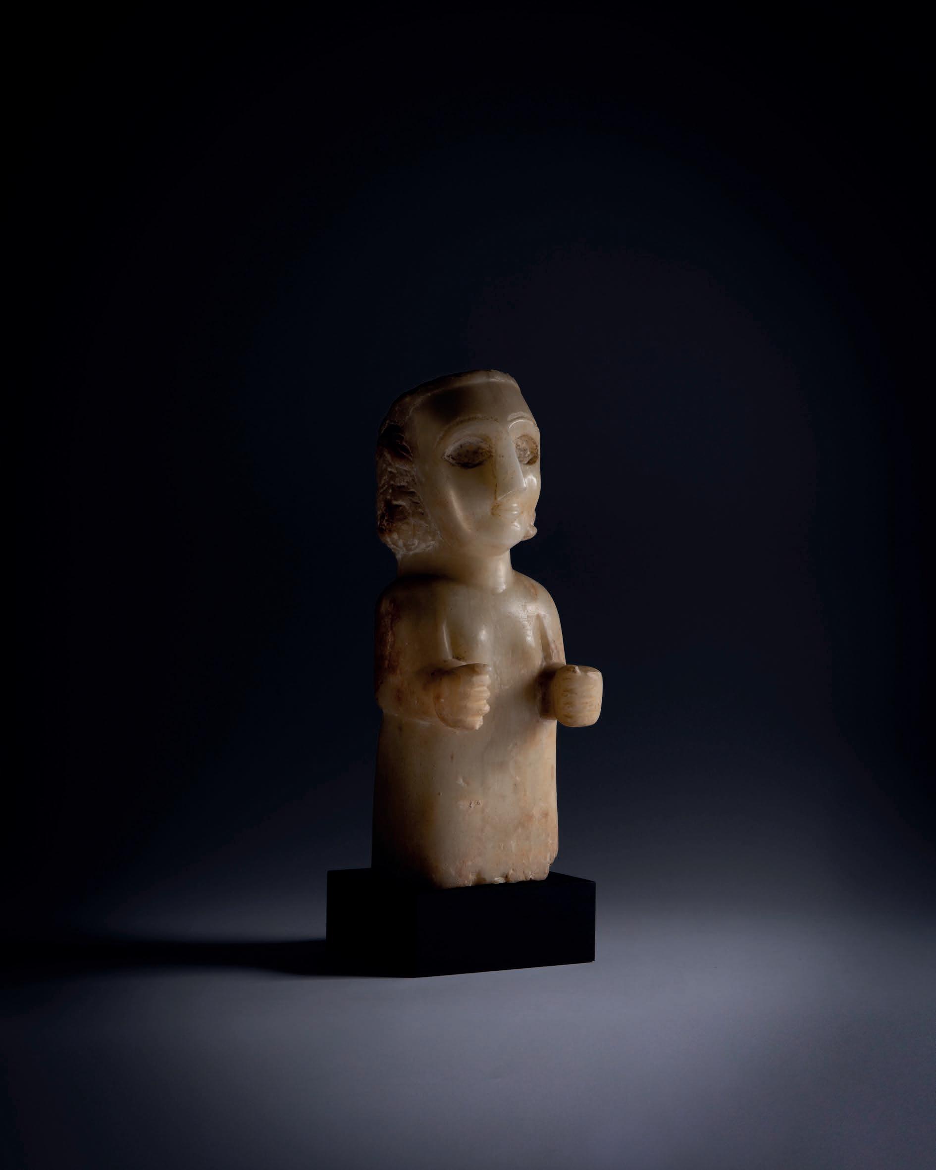 An alabaster female figure, displaying the stylised and elegant forms unique to South Arabian art. The figure is standing with extended arms and clenched fists, the sensitively carved and highly polished face exudes power and mystery, with large, almond-shaped eyes, sweeping eyebrows, straight nose, and gently smiling lips. What separates this figure from many, is its exceptional condition and provenance.
