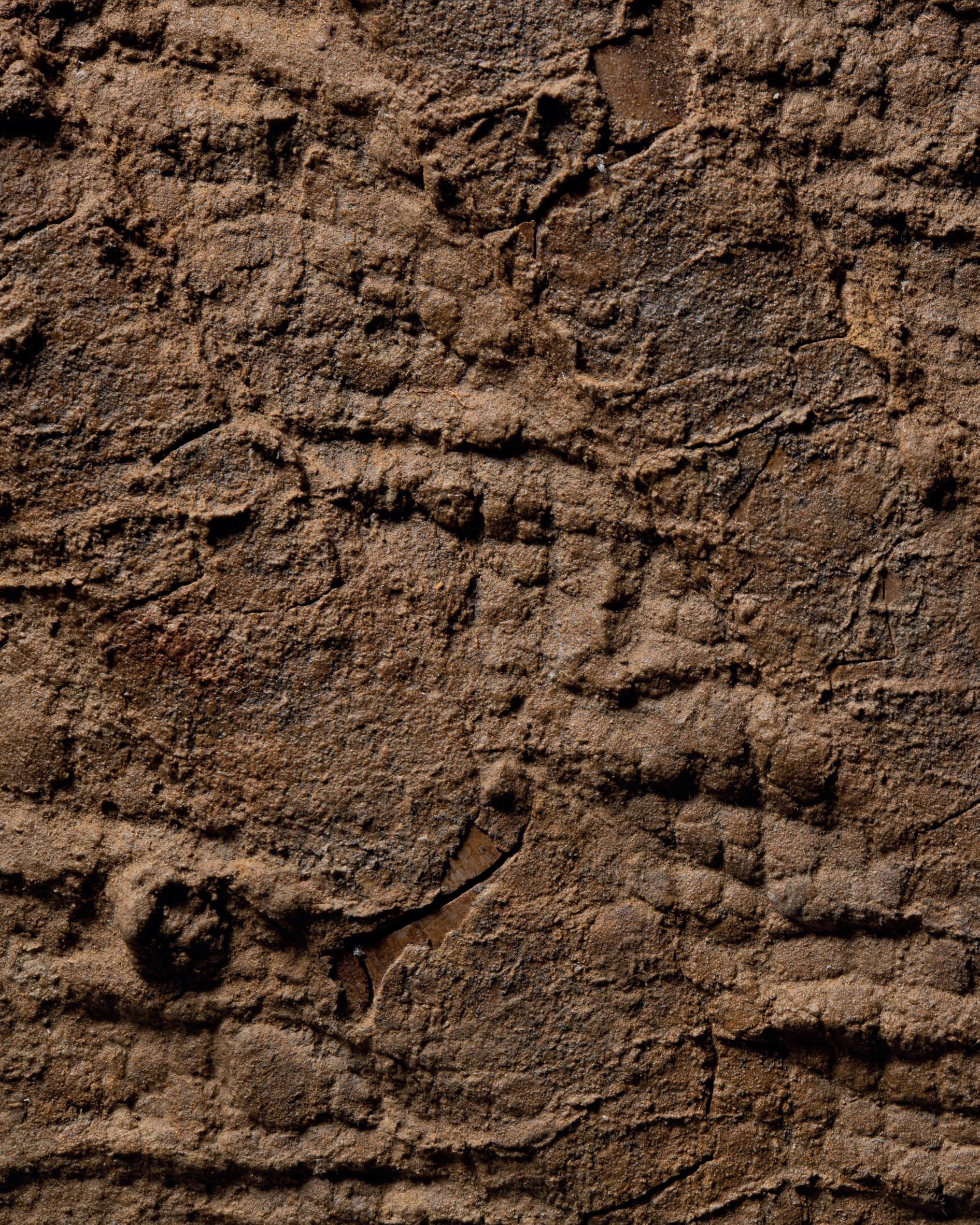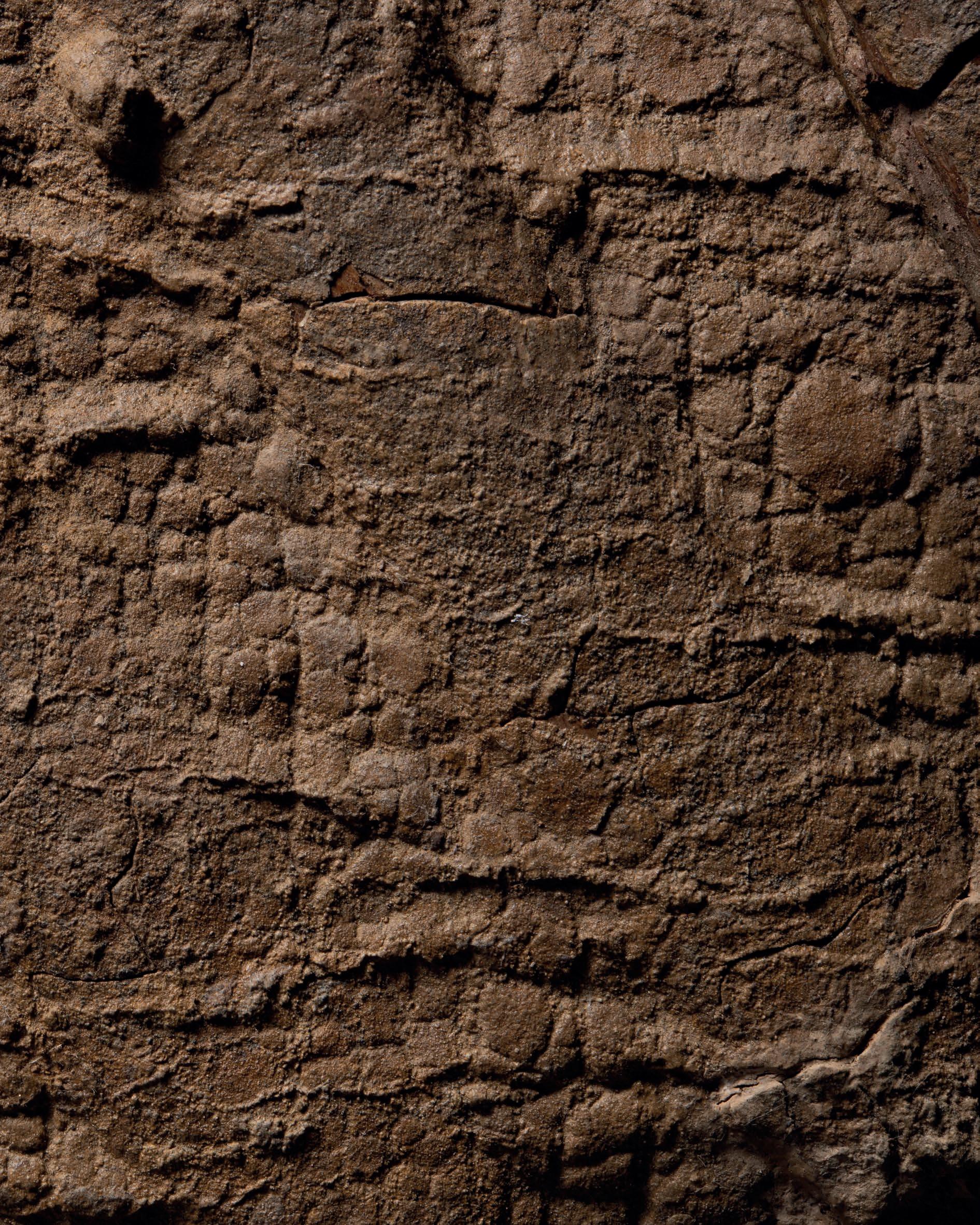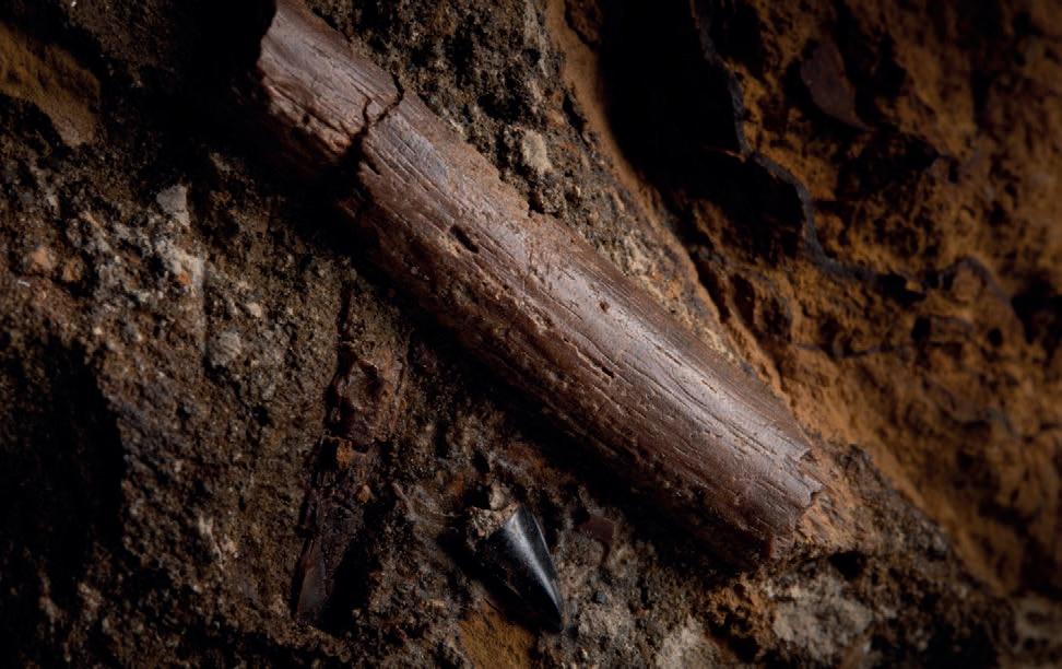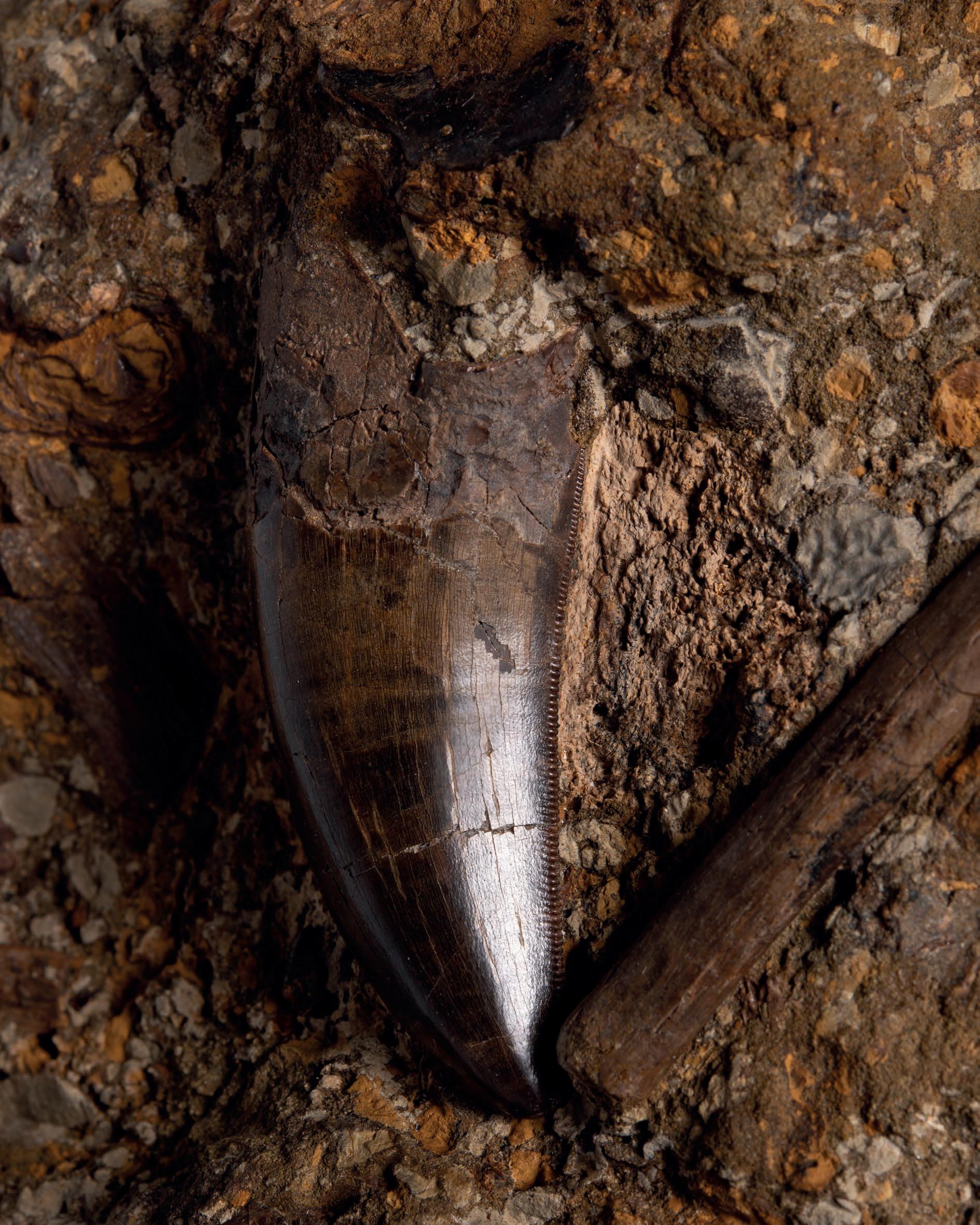 Beyond the dinosaurs, other animals are also present. In the centre of the block, there is part of the left jaw of a small mammal bearing a molar, as well as multiple fragments of terrapin plastron (the bottomside of the shell that lies beneath the abdomen). One has a stippled surface, displaying the outside texture of the plastron, whereas another is turned over so the smooth side is visible. The matrix also bears a single, small crocodile tooth, as well as several enamelcovered scales from garfish and other aquatic creatures.