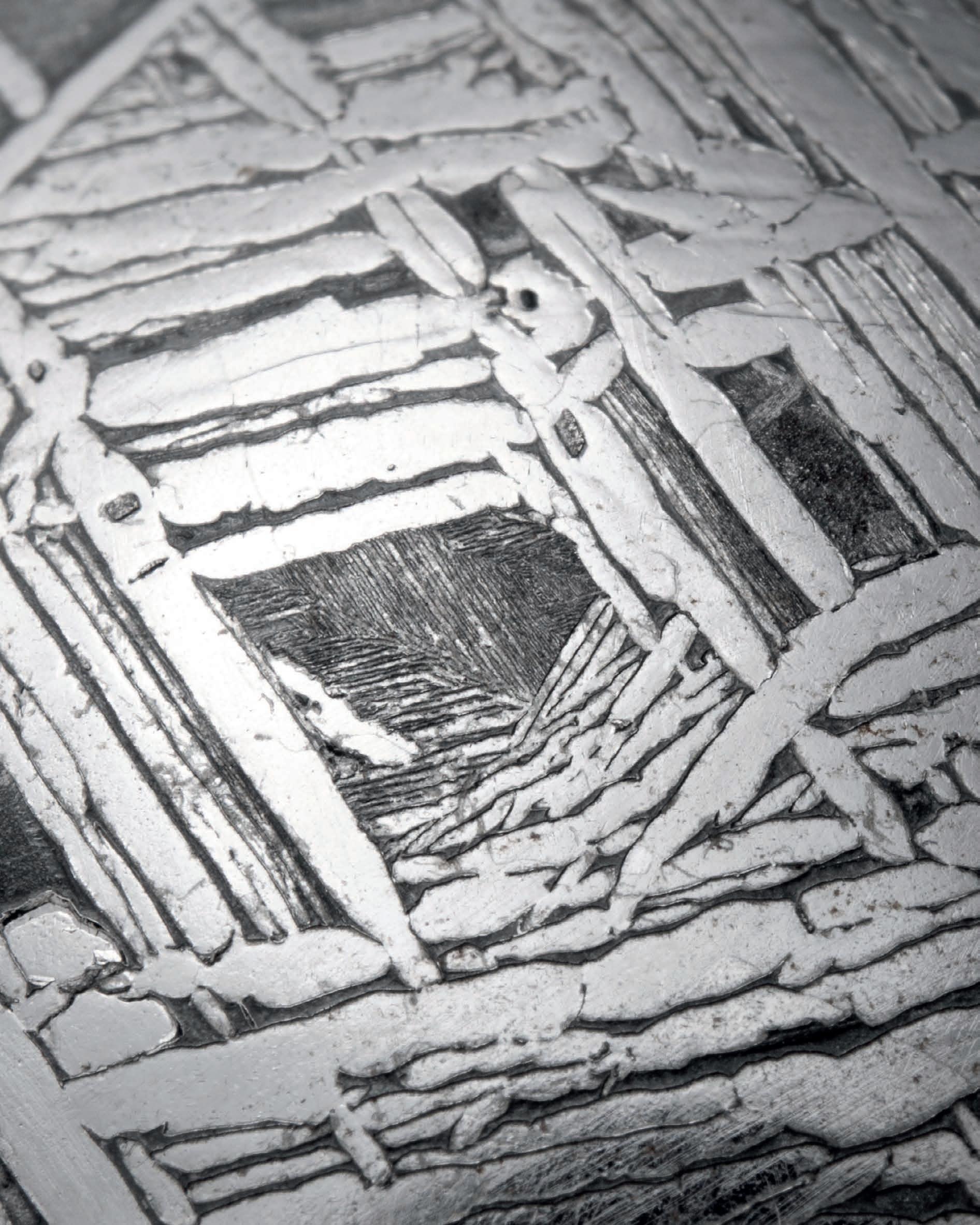 This extraterrestrial iron sphere is from the Aletai meteorite, first discovered in northern China in the 1920s. The iron here was originally shattered from the core of a large, differentiated asteroid before being hurled into an Earth-crossing orbit and experiencing a fiery descent at an unknown date in prehistory. The Aletai meteorite is renowned for displaying some of the most striking Widmanstätten patterns - intricate crystalline structures that form only in the vacuum of space, over millions of years.