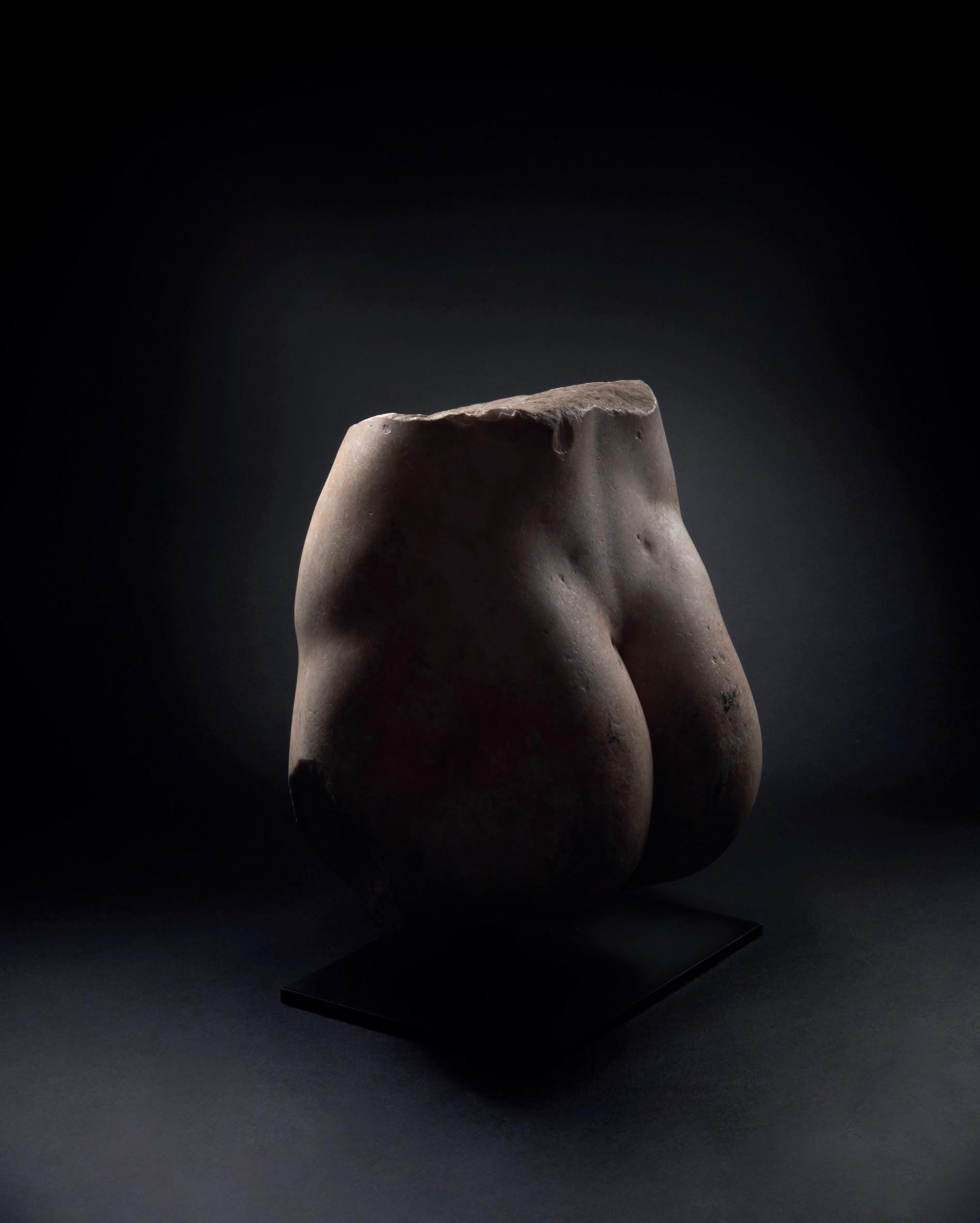 This life-sized sculpture is sensuously modelled, with remarkable attention to detail and naturalism. Preserving the nude, lower torso of the goddess of love, the softly curved stomach, rounded hips, back dimples, and full buttocks are confidently carved and enhanced by a fine polish. Venus stands with her weight on her left leg, with the right leg slightly raised in a graceful pose. A small patch of fragmented stone on the pubis suggests the placement of the now-lost right hand, likely positioned to gently cover the deity’s modesty.