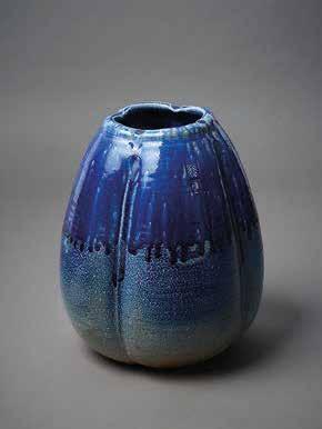Altered large tapered shape in salt glaze with poured iridescent blue glaze potter’s mark near rim