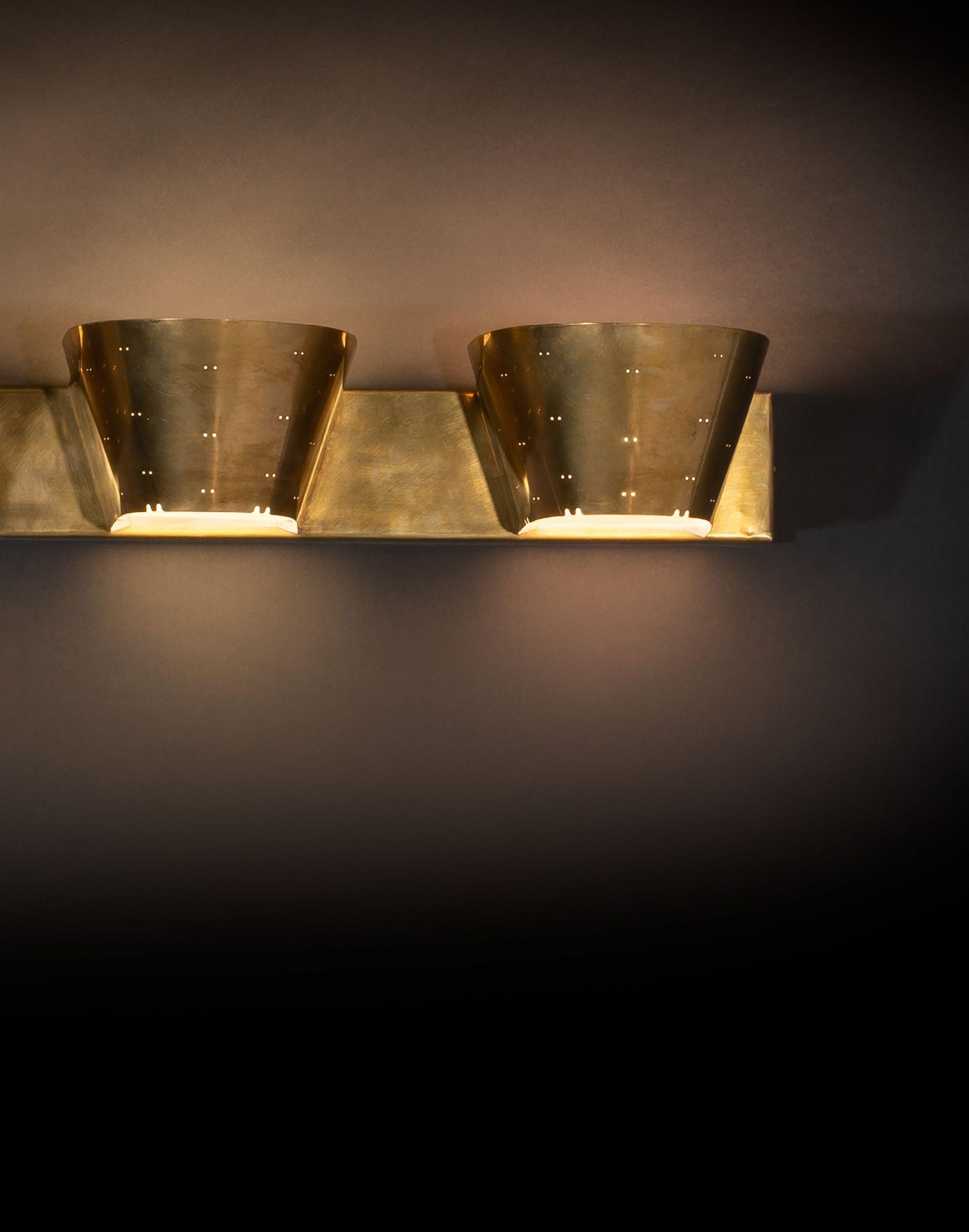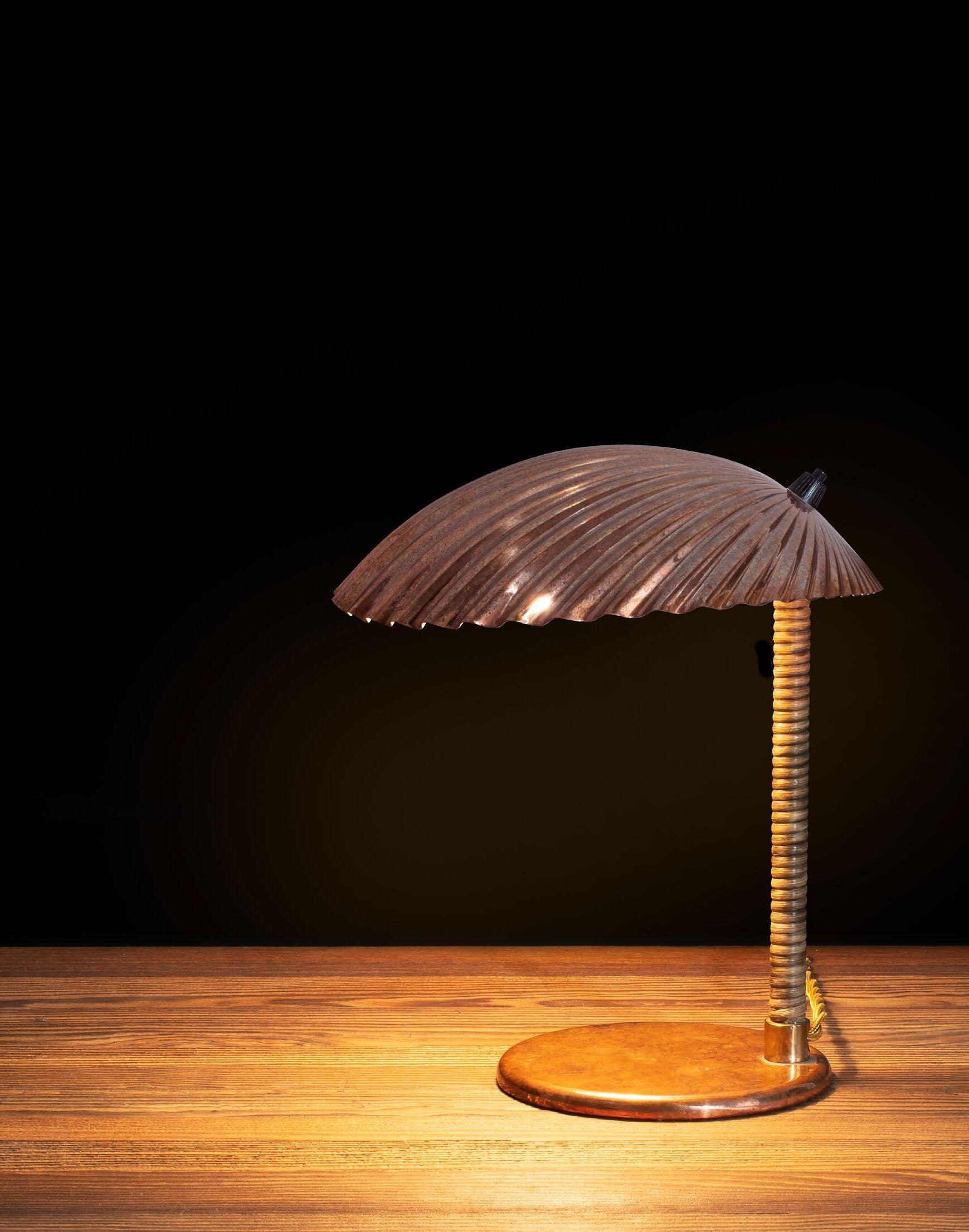 La sélection que nous proposons ici est unique et exceptionnelle. Elle illustre la permanence des formes organiques de la nature dans les créations du designer, ainsi que sa prédilection pour le laiton, donnant à la lumière un éclat chaud et doré. Conjuguant celui-ci avec le verre opalin, le cuir ou le rotin, Paavo Tynell démontre avec dextérité sa capacité à mettre en scène comme personne la lumière. C’est cette singularité qui lui vaut aujourd’hui d’être considéré comme le maître finlandais de la lumière.