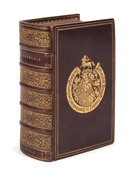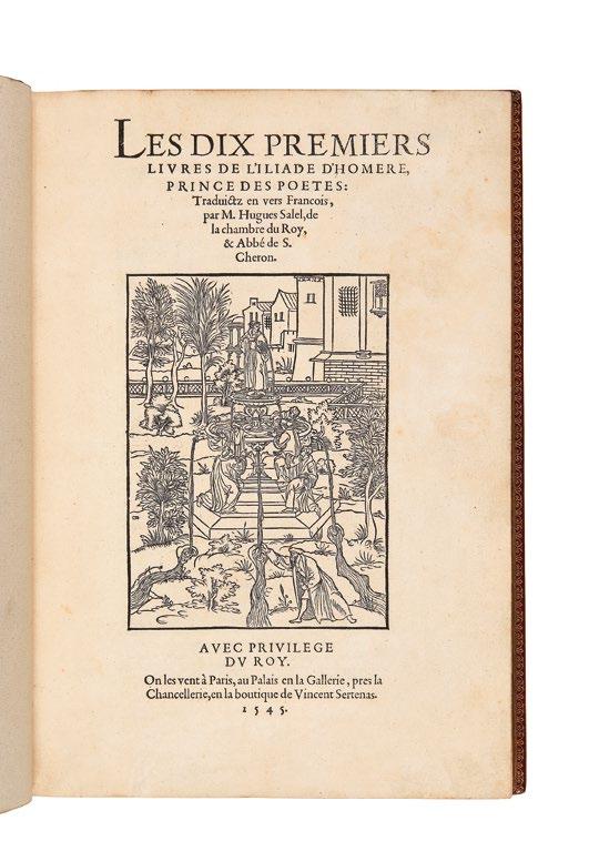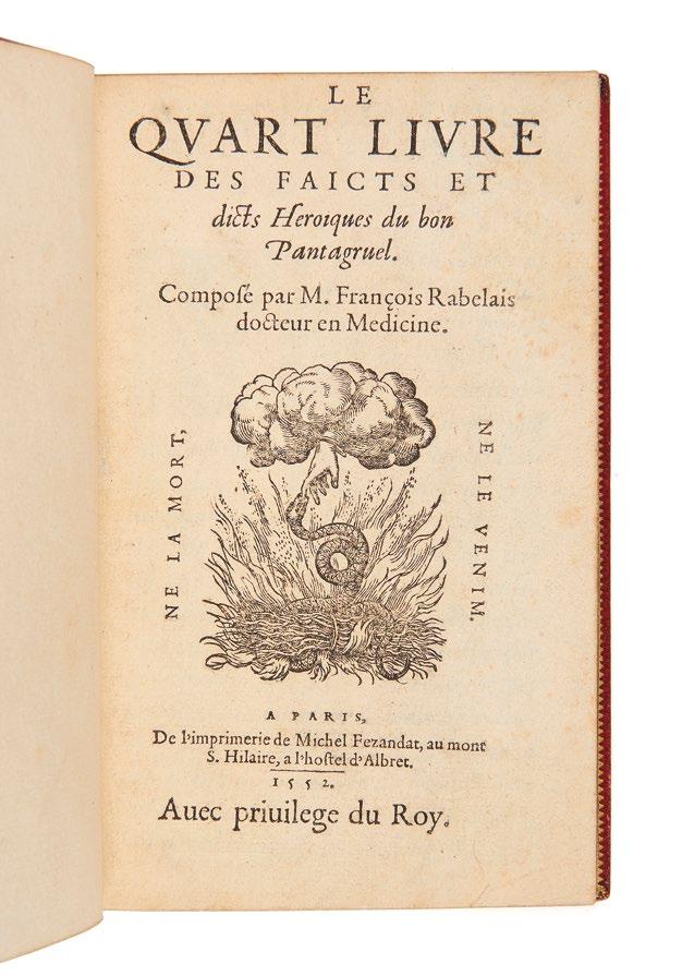 est ici placée sous la figure truculente de Rabelais dont on trouvera, entre autres, l’édition originale complète du Quart livre ainsi que les très rares éditions collectives des Œuvres , de 1553 et 1556. Elles y côtoient les grands mémorialistes du XVIe siècle, tels Commines, Goulart, La Marche et Monluc. En parallèle de la verve burlesque rabelaisienne et du sérieux des mémoires historiques, citons enfin le mythique Champfleury de Tory qui immortalise les recherches de l’époque sur la typographie, recherches également illustrées à merveille par plusieurs ouvrages imprimés en caractères de civilité. Enfin, quant aux traductions en français d’auteurs et historiens grecs et latins comme Héliodore, Homère, Platon, Plutarque, Thucydide et Xénophon, elles témoignent du goût de la Renaissance pour la culture antique.