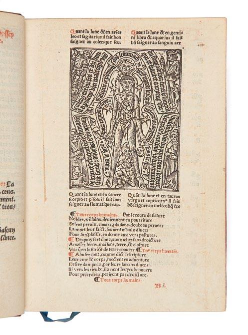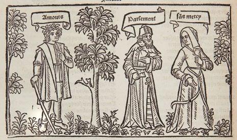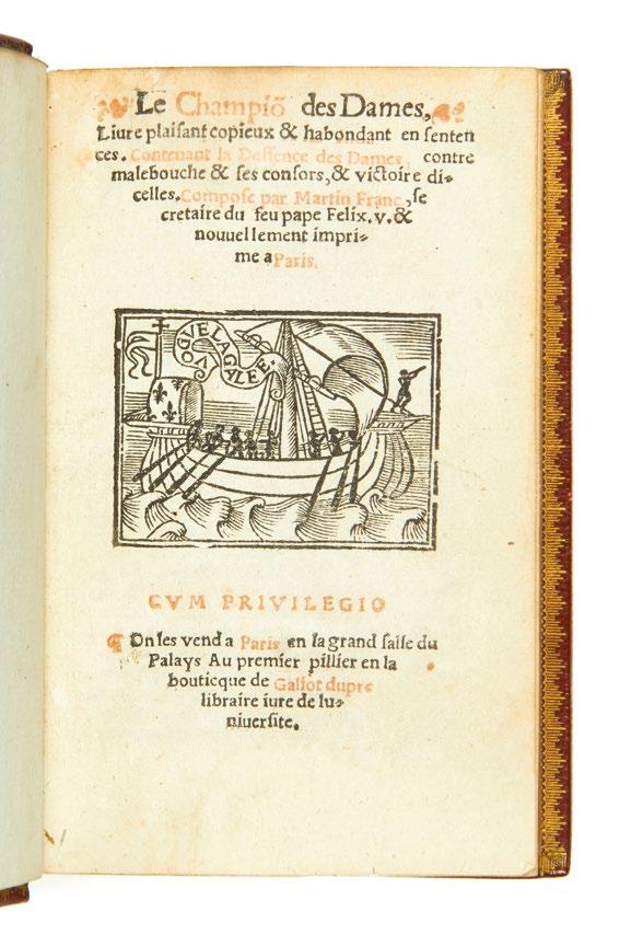 Pour les impressions gothiques en français, nous continuons à suivre rigoureusement l’ordre alphabétique suivant la logique bibliographique que nous avons adoptée, et nous présentons ici les ouvrages référencés de la lettre F à la lettre L. Outre une rare réunion de huit ouvrages différents de Pierre Gringore, figure centrale du théâtre populaire de l’époque, on y trouvera deux éditions du Roman de la Rose de Lorris et Meung, le Champion des Dames de Martin Franc ainsi que des œuvres d’une savoureuse irrévérence qui illustrent parfaitement le débat connu sous le nom de « Querelle des femmes » : les Quinze joÿes de mariage , la Grand patience des femmes contre leurs maris , la Quenolle spirituelle de Jehan de Lacu, le Grant triumphe et honneur des dames et bourgeoises de Paris ou encore deux éditions de la Louenge et beaulte des dames . Ces ouvrages voisinent aisément avec les récits merveilleux des héros légendaires et mythologiques dont est truffé l’imaginaire collectif du début du XVIe siècle. On suivra donc ici, parmi