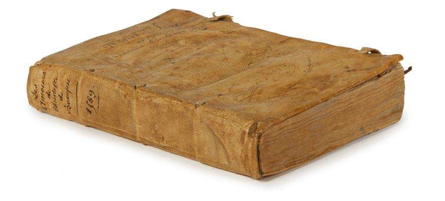 Reliure tachée avec le dos anciennement restauré et début de fente aux mors. Mouillures angulaires à plusieurs feuillets en début et fin de volume, restauration angulaire au feuillet R8, soulignements à l’encre et quelques annotations au feuillet P6 et au cahier Q.