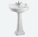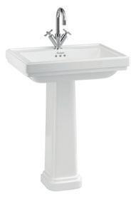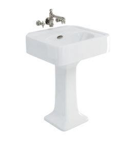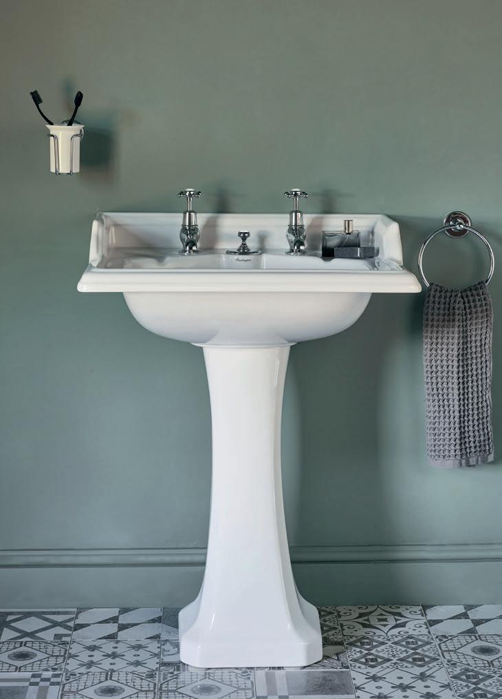 Classic 650mm rectangular basin with invisible overflow with pedestal | 5” pillar taps with Claremont handles | Tumbler holder | Towel ring | All fittings, brassware and accessories are in Chrome