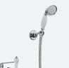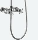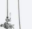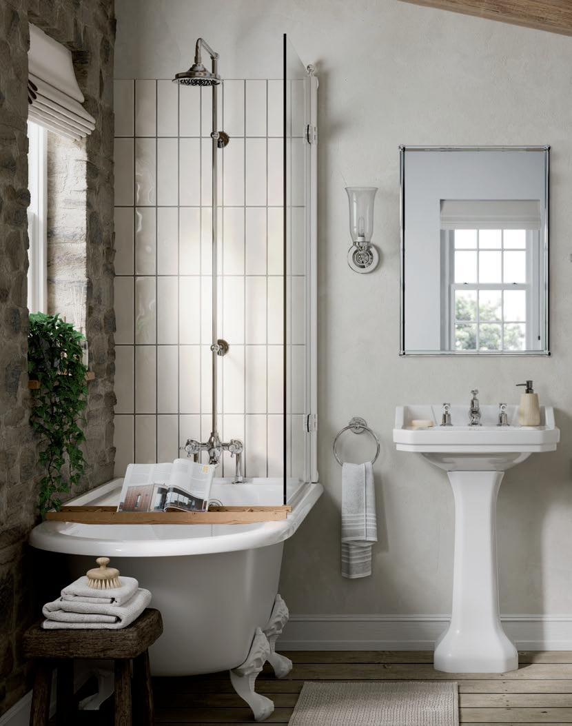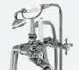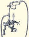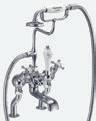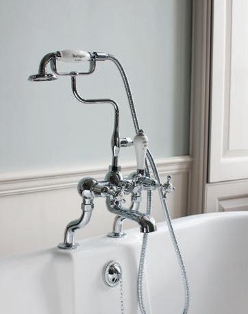 Above: London round bath | Deck mounted bath shower mixer with White Kensington handles | Stand pipes | Brass extendible bath rack | All fittings, brassware and accessories are in Chrome