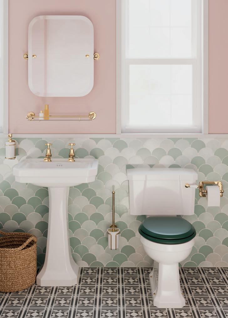 Victorian 610mm basin with full pedestal | 5” pillar taps with Claremont handles | Rectangular mirror with rounded corners | Soap dispenser | Glas shelf | Toilet brush | Toilet roll holder | Standard 520 close coupled WC with lever and cover caps | Soft close seat, Green | All fittings, brassware and accessories are in Gold