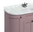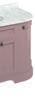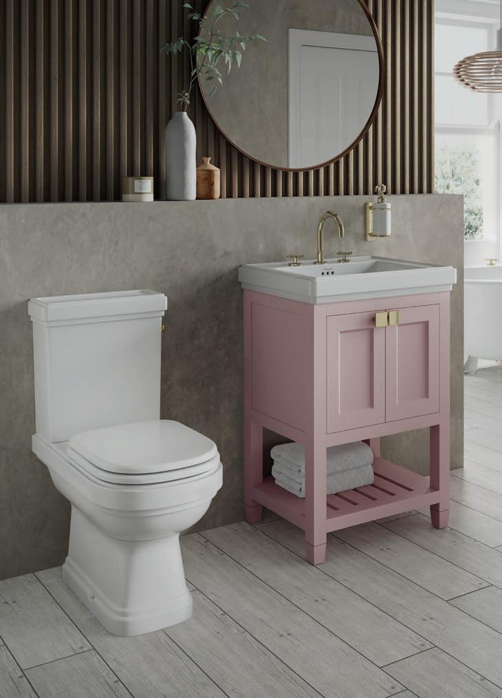 Riviera close coupled open-backed WC | Riviera soft close seat | Riviera 580mm vanity unit Pink with handles and Riviera square basin | Riviera three tap hole mixer | Single soap dispenser | All fittings, brassware and accessories are in Gold