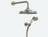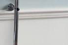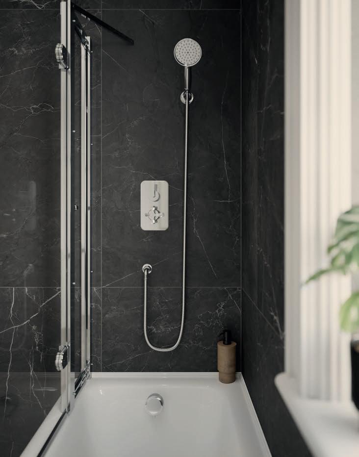 Victorian 610mm basin with full pedestal | 5” pillar taps with Claremont handles | Standard 520 close coupled WC with lever | Soft close seat, White | Avon exposed shower with 9” shower head | Sliding door enclosure and tray | Trafalgar radiator | All fittings, brassware and accessories are in Chrome