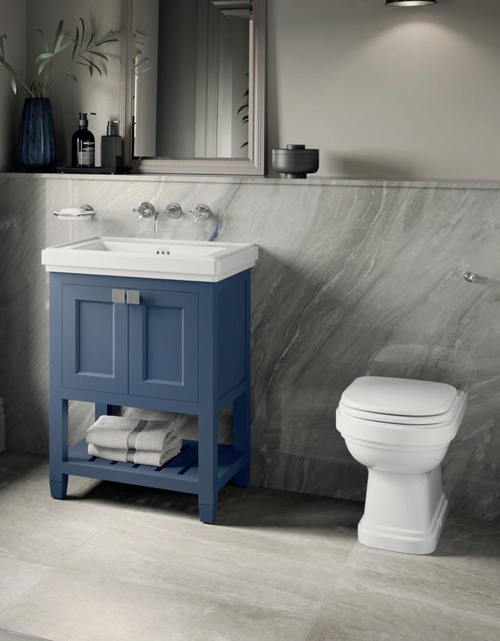 Riviera back to wall WC | Riviera soft close seat | Riviera cistern flush lever | Riviera 650mm vanity unit in Blue with handles and Riviera square basin | Riviera wall mounted basin mixer | Soap dish | All fittings, brassware and accessories are in Chrome