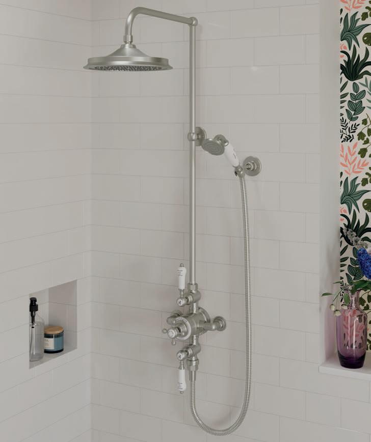 Contemporary Upstand 560mm basin with stand and towel rack | Mono basin mixer with Claremont handles | Soap dish | Towel ring | Standard 520 close coupled WC with lever and cover caps | Soft close seat, White | Walk in, recess with hinged deflector | Avon thermostatic shower with wall bracket, handset and 9” head | Trafalgar radiator | All fittings, brassware and accessories are in Brushed Nickel