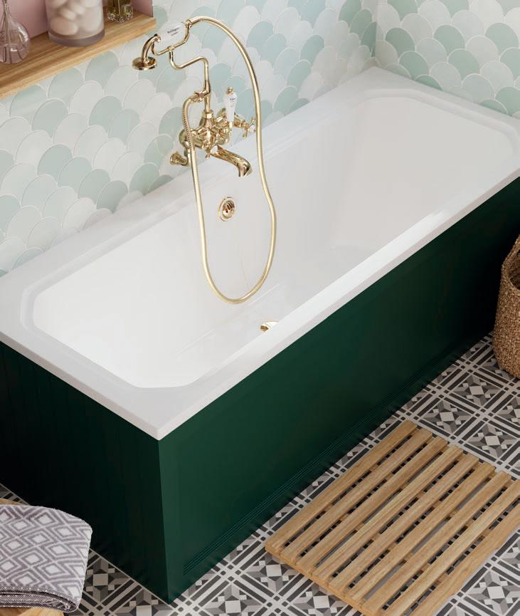 Victorian 610mm basin with full pedestal | 5” pillar taps with Claremont handles | Rectangular mirror with rounded corners | Soap dispenser | Glass shelf | Toilet brush | Toilet roll holder | Arundel Double Ended 1700x700 with side panels, Green | Bath shower mixer wall mounted with Claremont handles | All fittings, brassware and accessories are in Gold