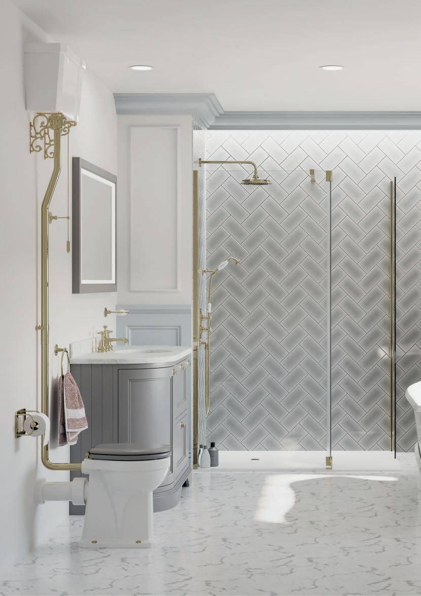 Regal high level WC with flush pipe, dual flush ceramic cistern and cover caps | Soft close seat, Grey | WC roll holder | Towel ring | Soap dish | Regent three tap hole mixer with Claremont handles | 1340mm freestanding curved vanity unit with drawers, Grey with Minerva Carrara worktop | Framed mirror with LED illumination, Grey | Walk In, corner with hinged deflector | Trent thermostatic shower with wall bracket, handset and 9” head | All fittings and accessories are in Gold