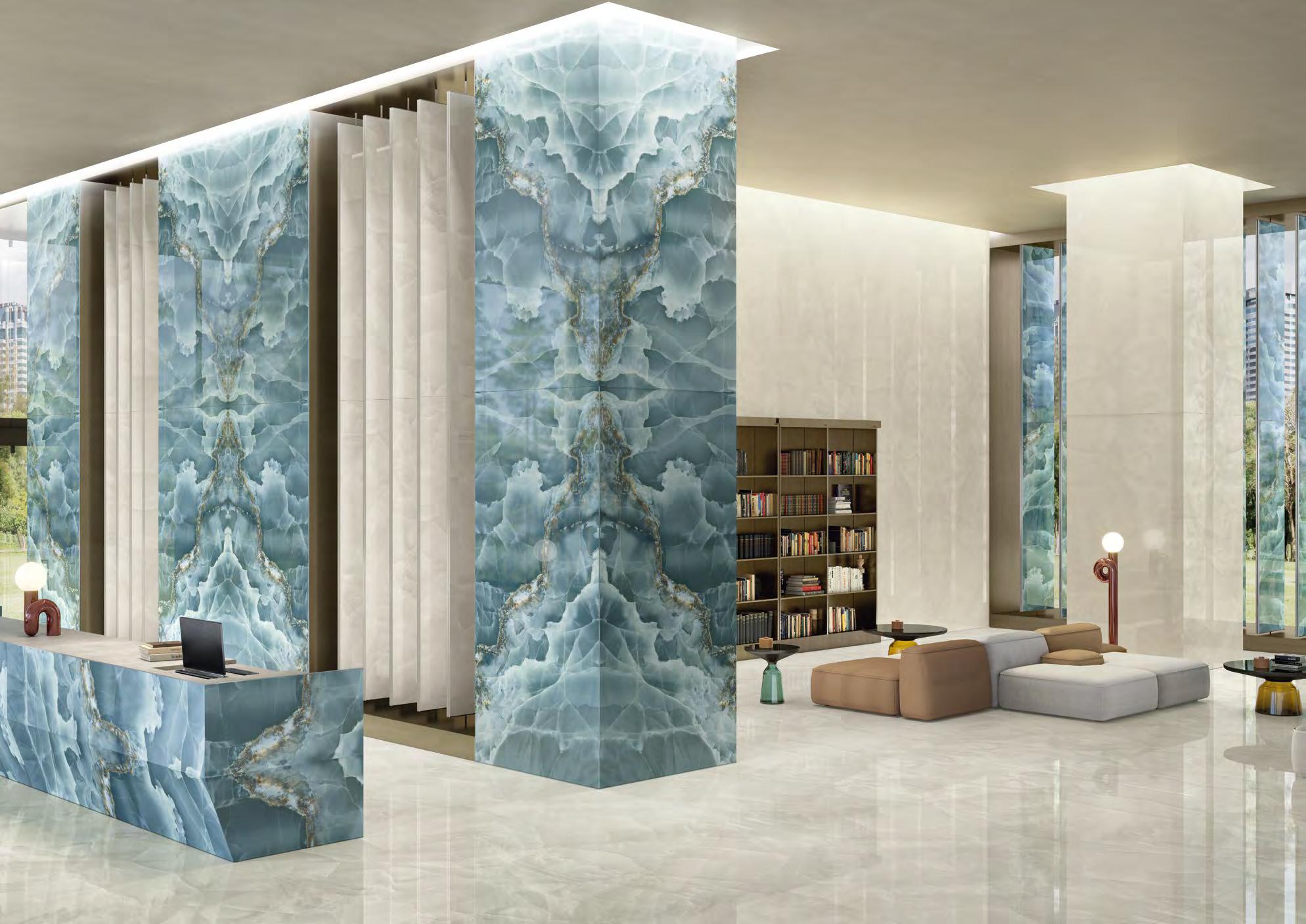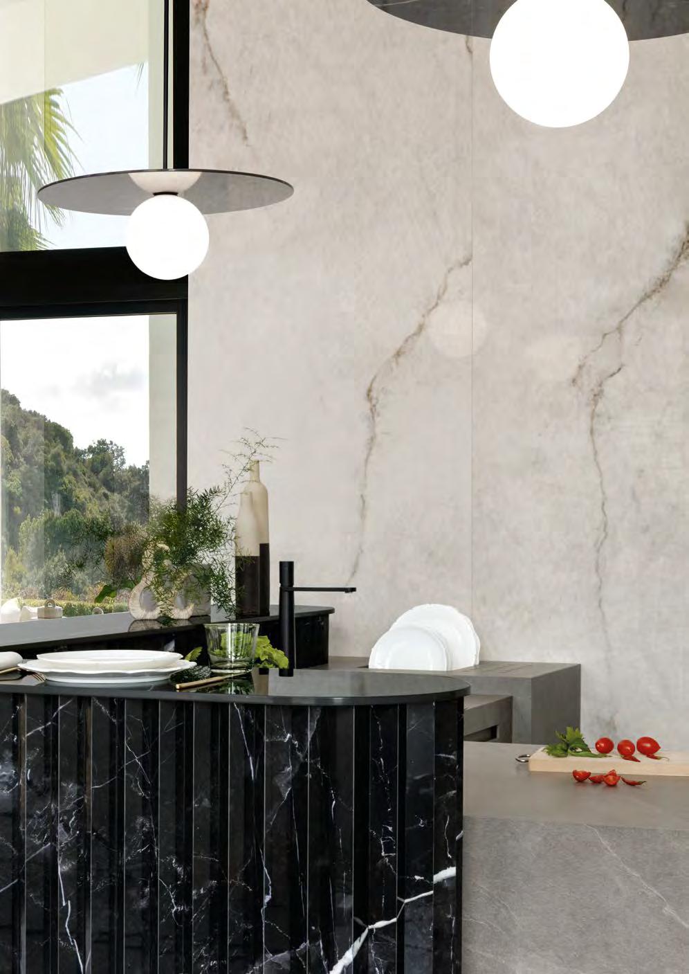 Pour que la vie soit une œuvre d’art. Dalles céramiques en format 160x320 rectifié, en épaisseur 6,5mm, et en format 162x324 non rectifié, en épaisseur 12mm et 20mm, pour réaliser des objets comme des plans de travail/toilette et des dosserets dans la cuisine et la salle de bains, des tables, des portes.