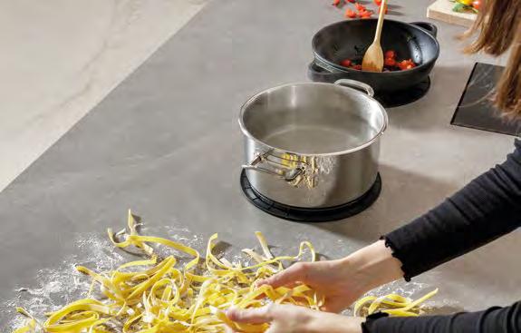 Une façon nouvelle de vivre la cuisine une surface unique où cuisiner, travailler et cuire les aliments en totale sécurité. Pour ne profiter que du meilleur de la journée, sans préoccupations. La zone de cuisson à induction est dissimulée, mais parfaitement intégrable sous la dalle en grès, sans besoin de découper : la surface céramique est ainsi beaucoup plus facile à nettoyer.