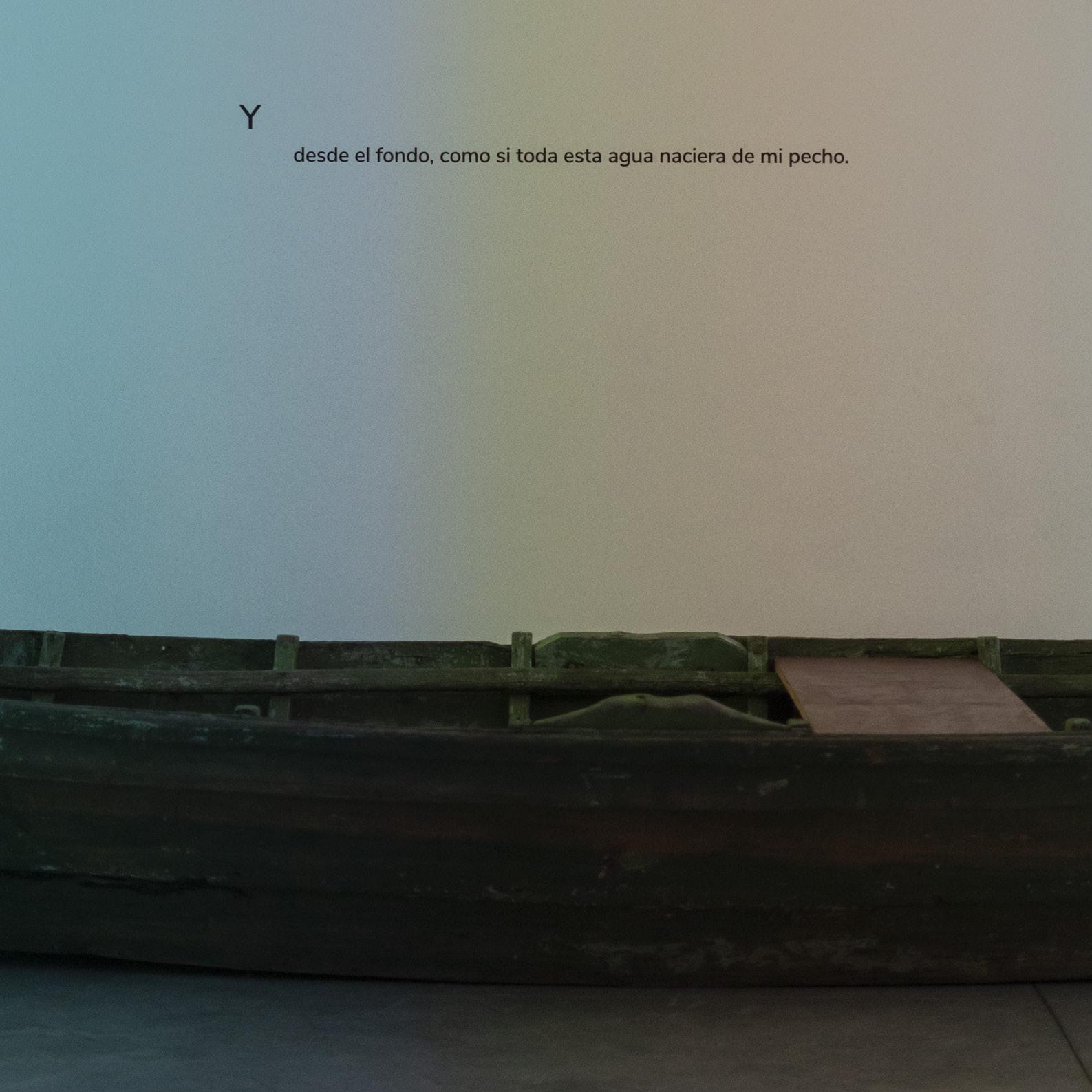 La obra es resultado del Premio Argentino a las Artes Visuales de la Fundación OSDE, que gané en el año 2021 con otra instalación audiovisual titulada Oración a San Juan. Como parte del premio, me propusieron realizar una obra en la sala II del Espacio de Arte de la Fundación OSDE, situado en la calle Arroyo, en pleno centro de la capital del país. Intervine la sala rectangular posicionando una canoa en el centro y un poema de Federico Torres, poeta de Alberdi que escribe