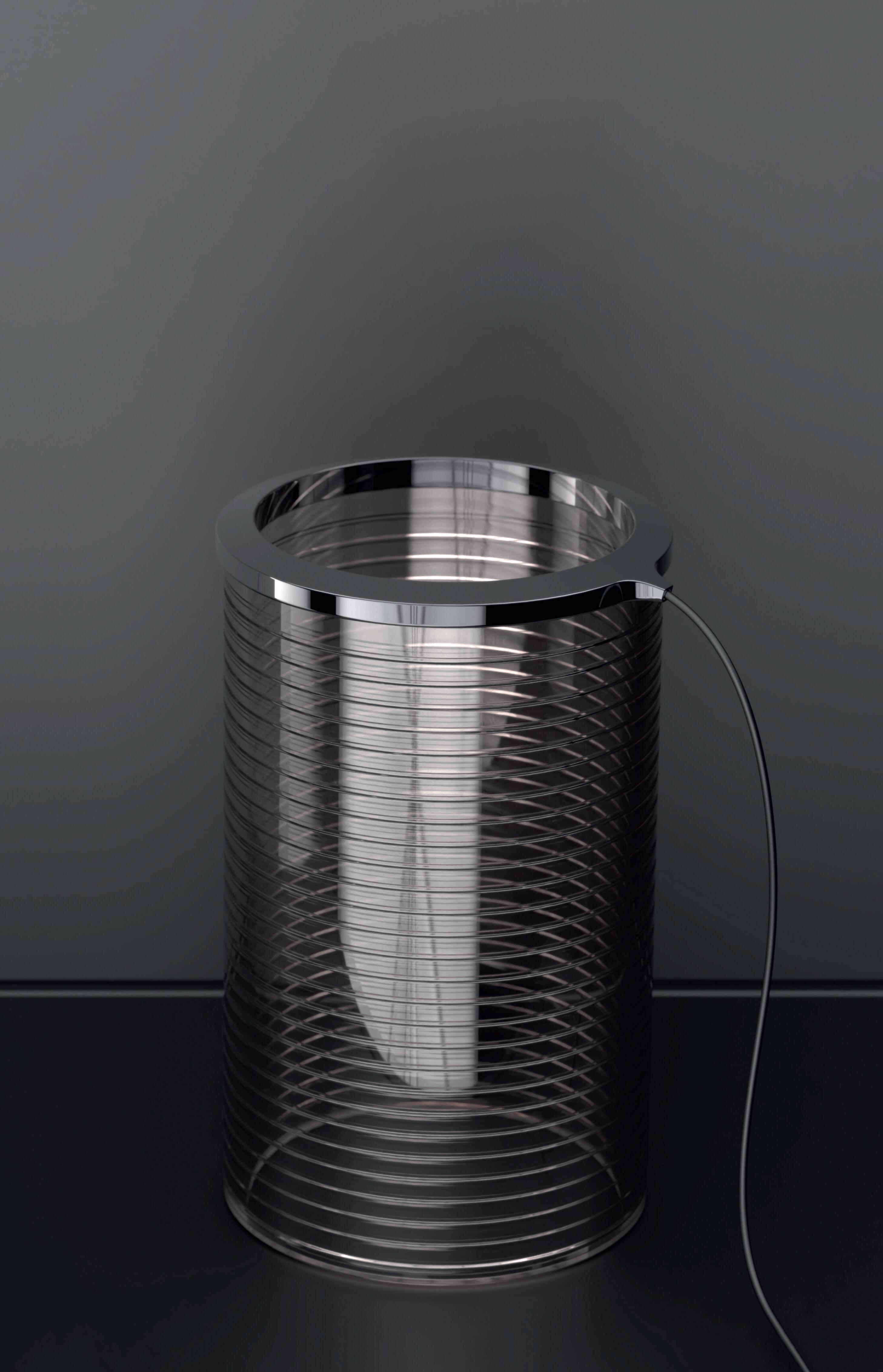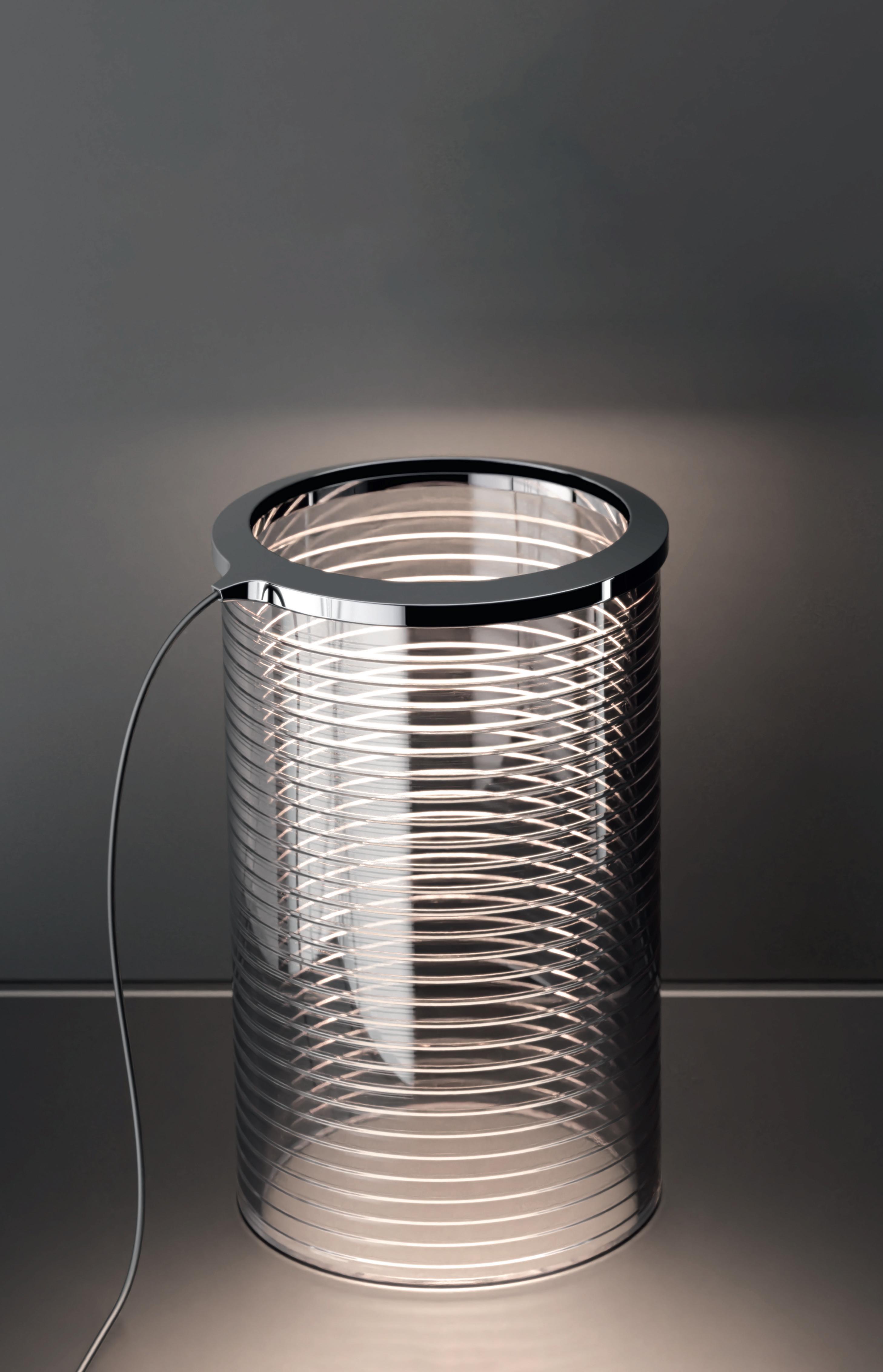 The diffuser is transparent glass hand-blown in a mould with a wavy edge shape whose vertexes are then ground to create a horizontal texture that alternates transparent and opaline diffusing stripes. This workmanship elegantly enriches the diffuser but above all creates a glare-free diffusion of light along the cylindrical body.