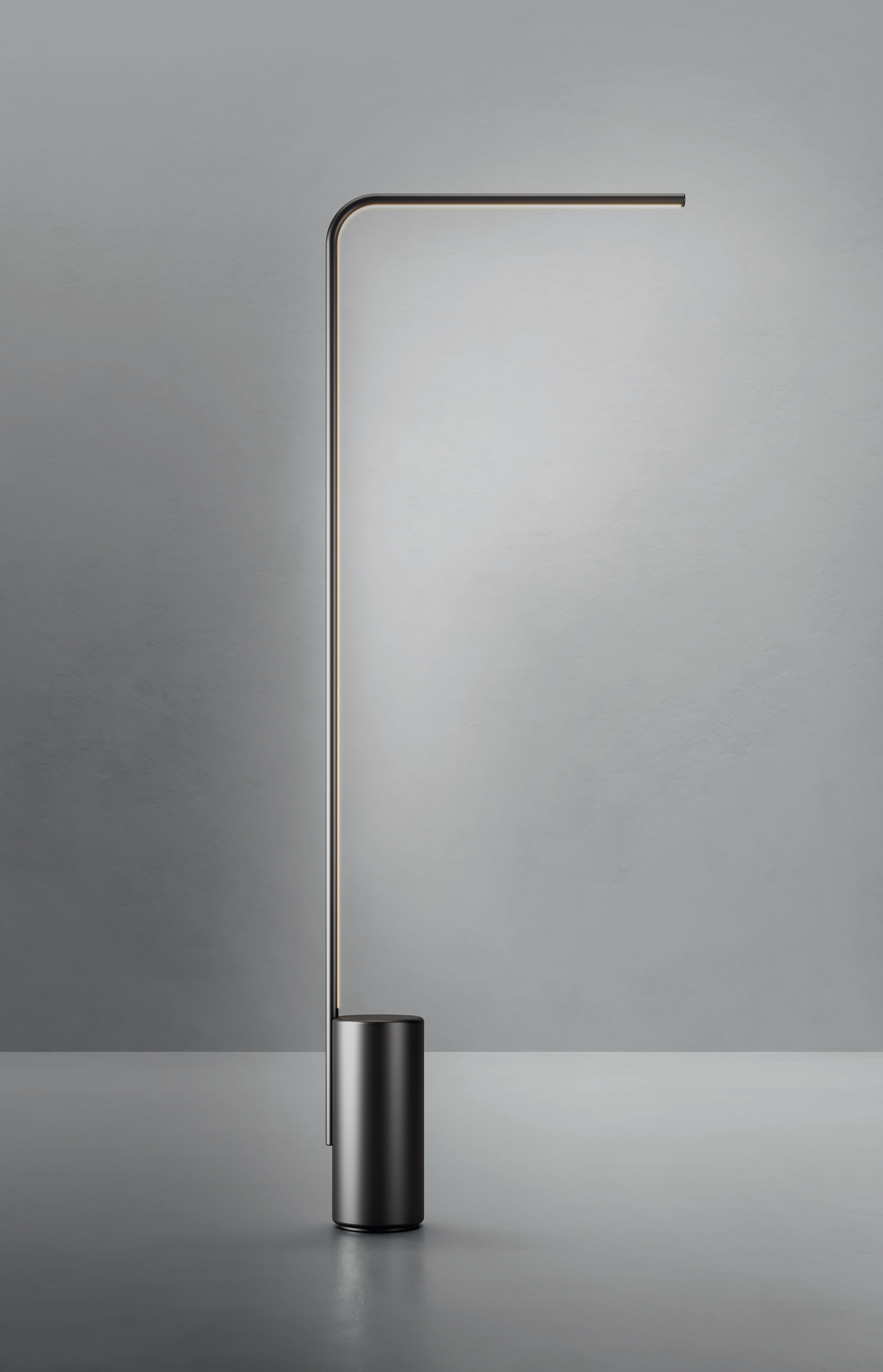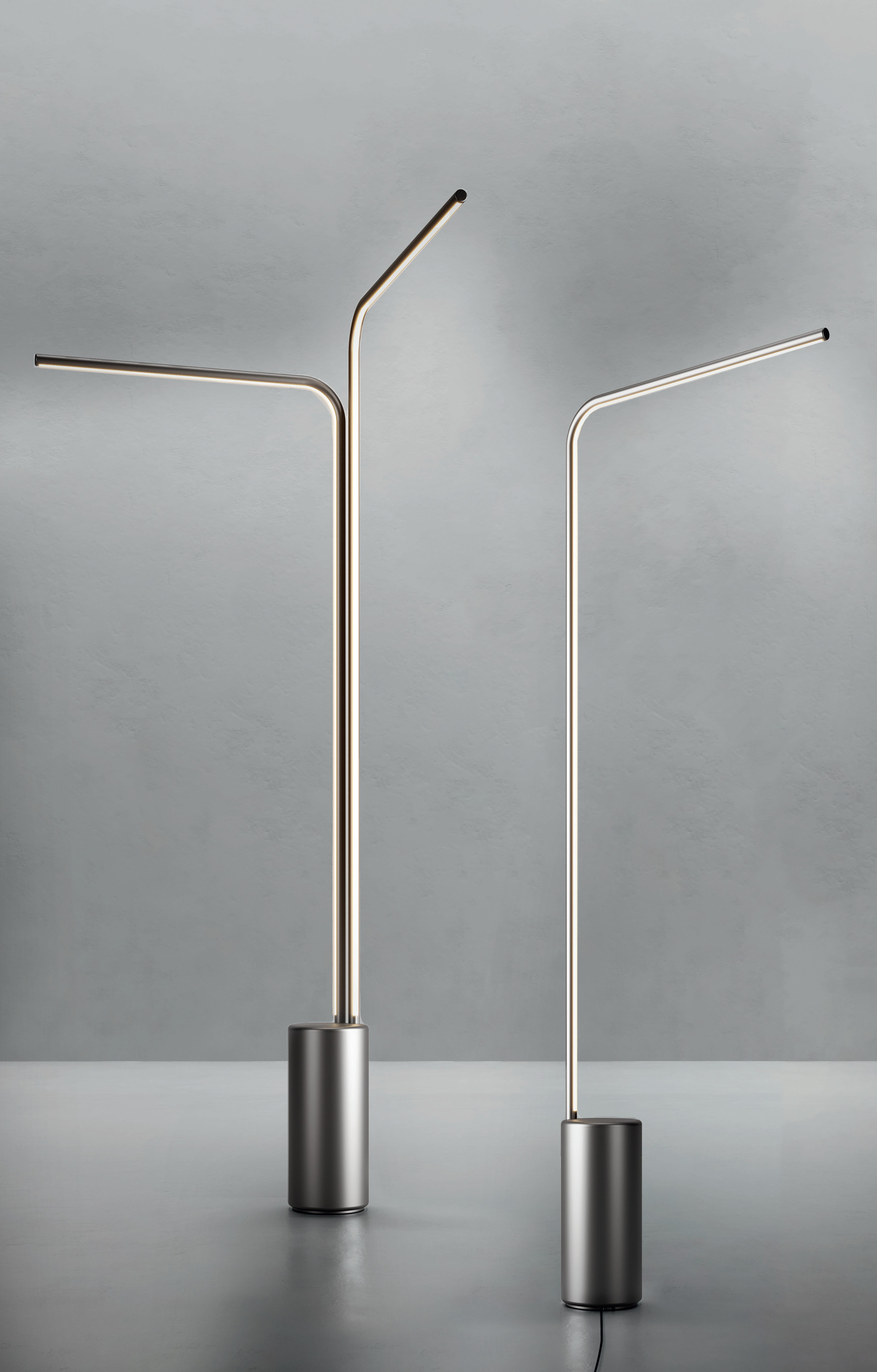 The same principle is echoed in the floor versions. The cylindrical base supports one or two arms, the light forming a continuous and constant sign in both, starting from the base and lighting up the entire length of the structure. This creates a diffused and enveloping light which is perfect from a perceptive point of view, favouring a relationship with the surrounding space.