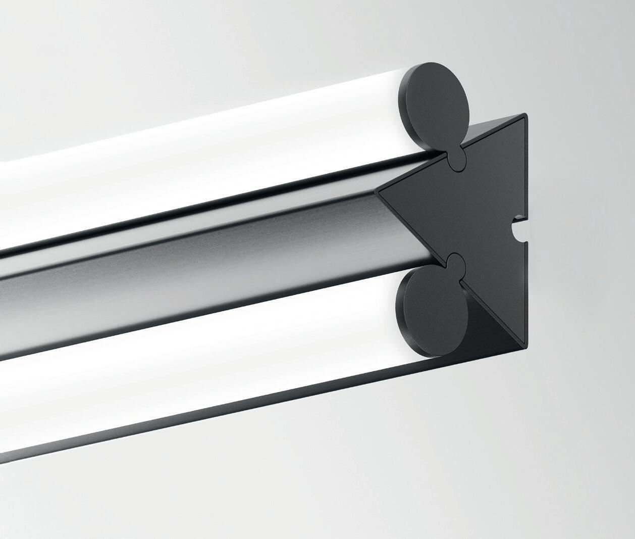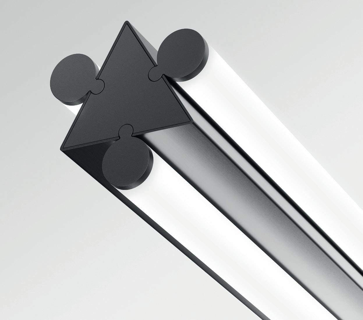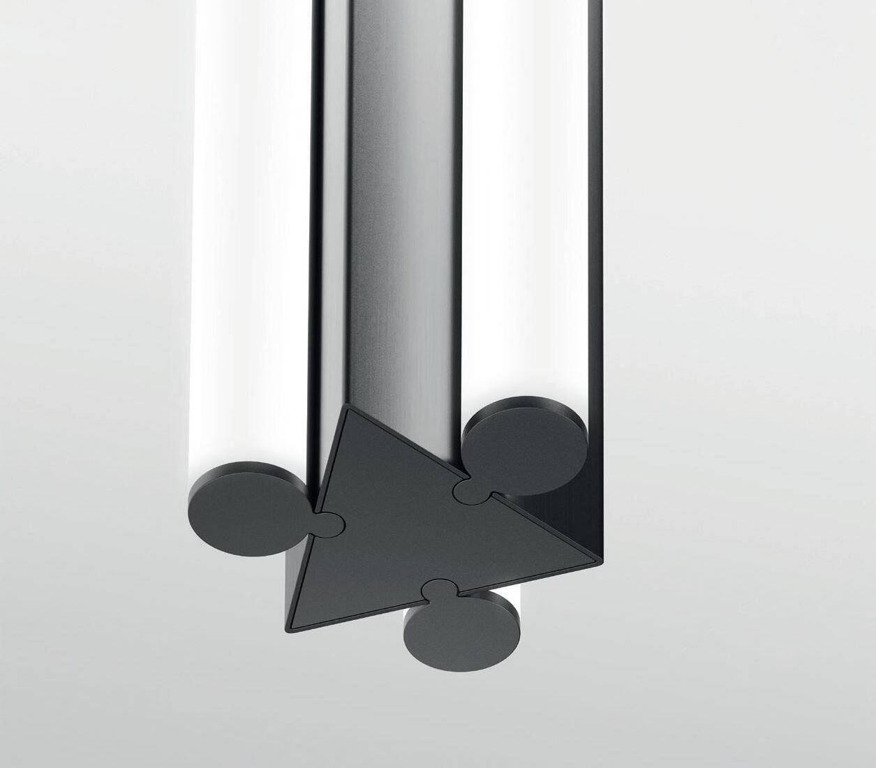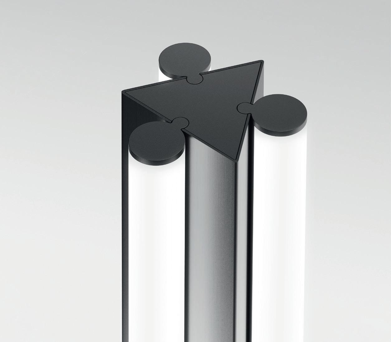 A triangular central core houses the electronic components and can also accommodate management intelligence. On all three sides it supports light diffuser tubes that distribute the light emission softly and evenly in the space.