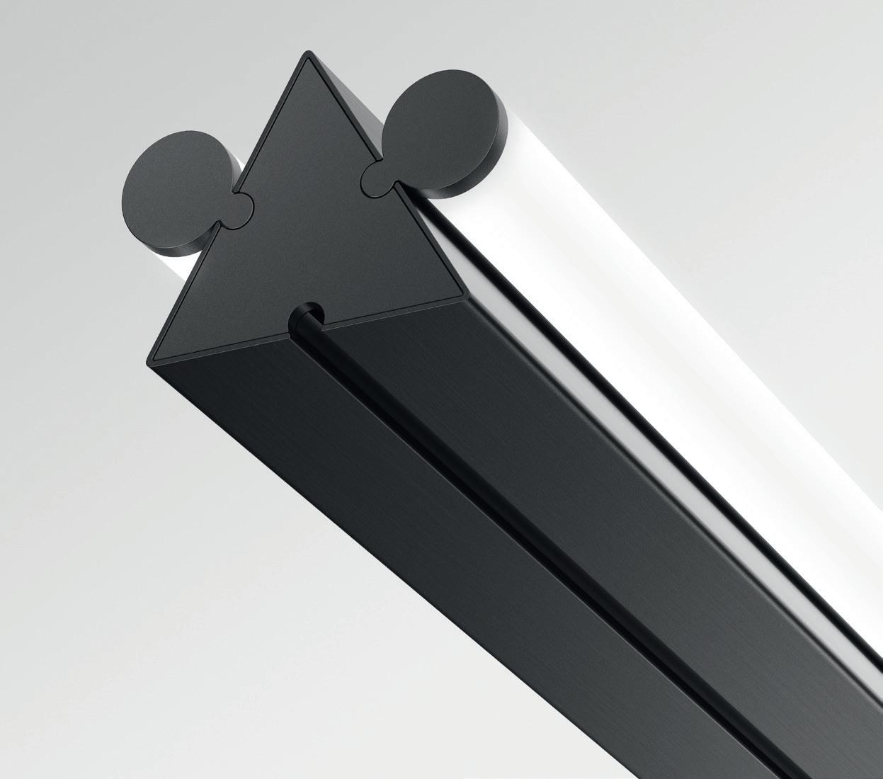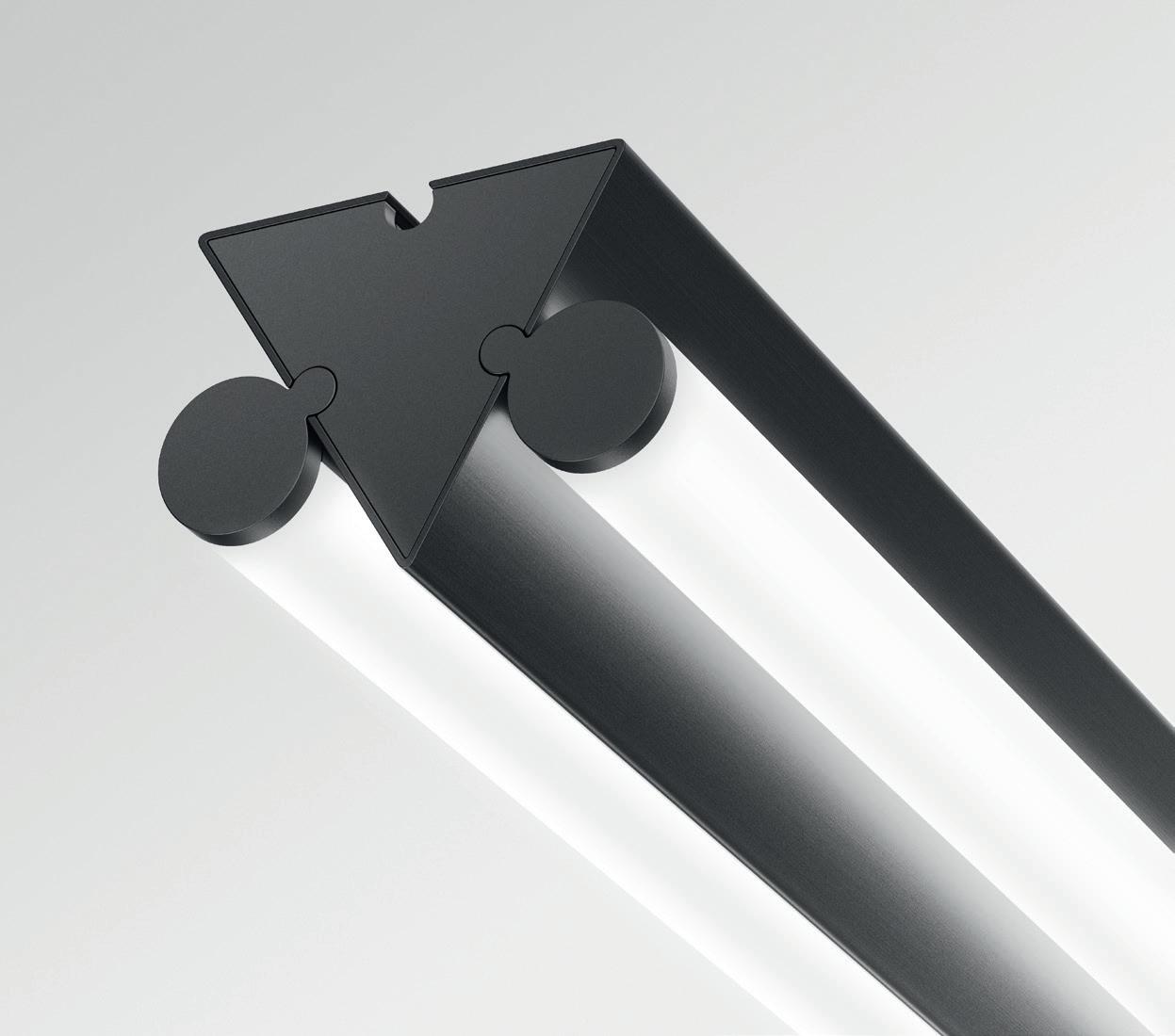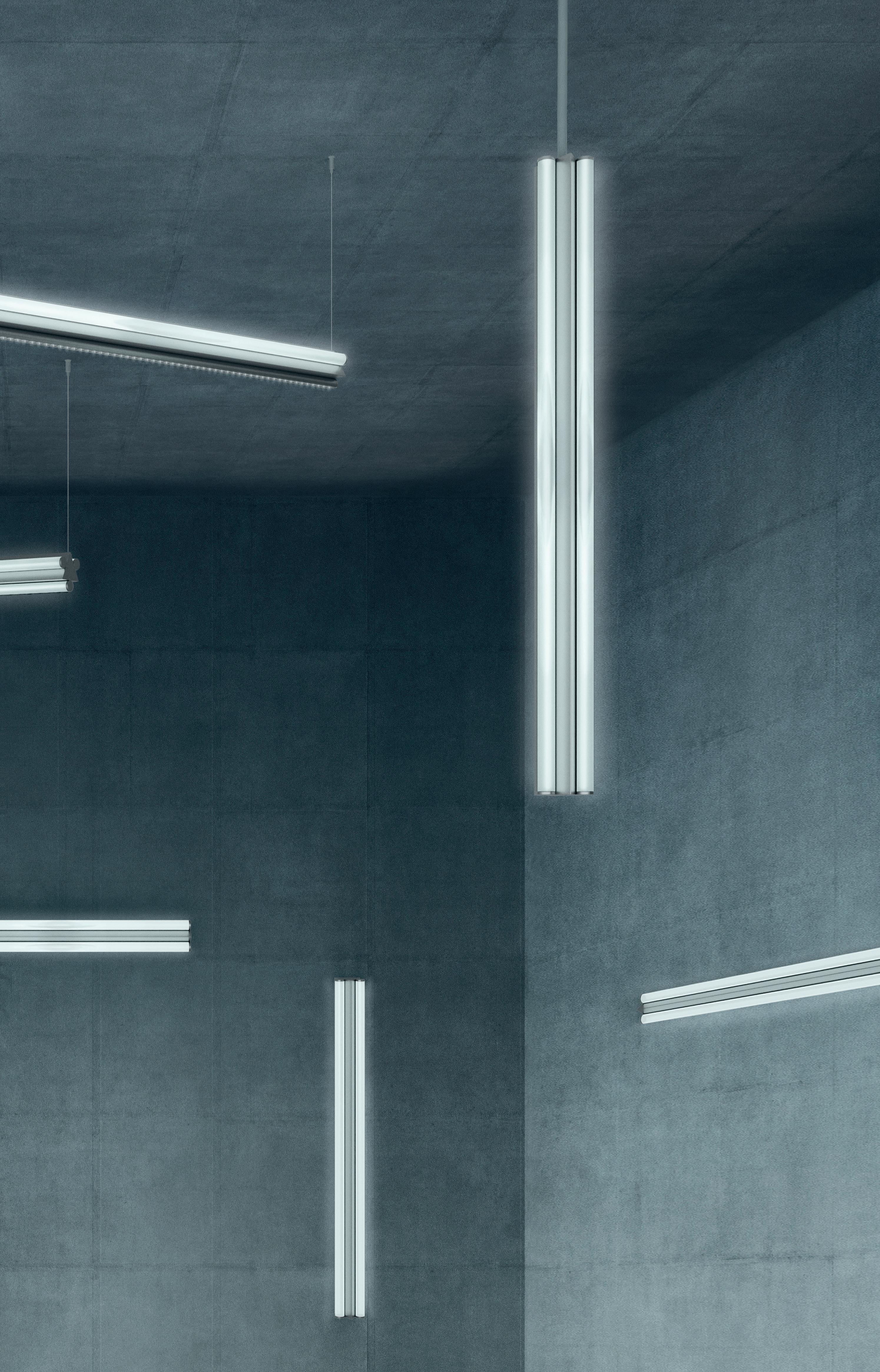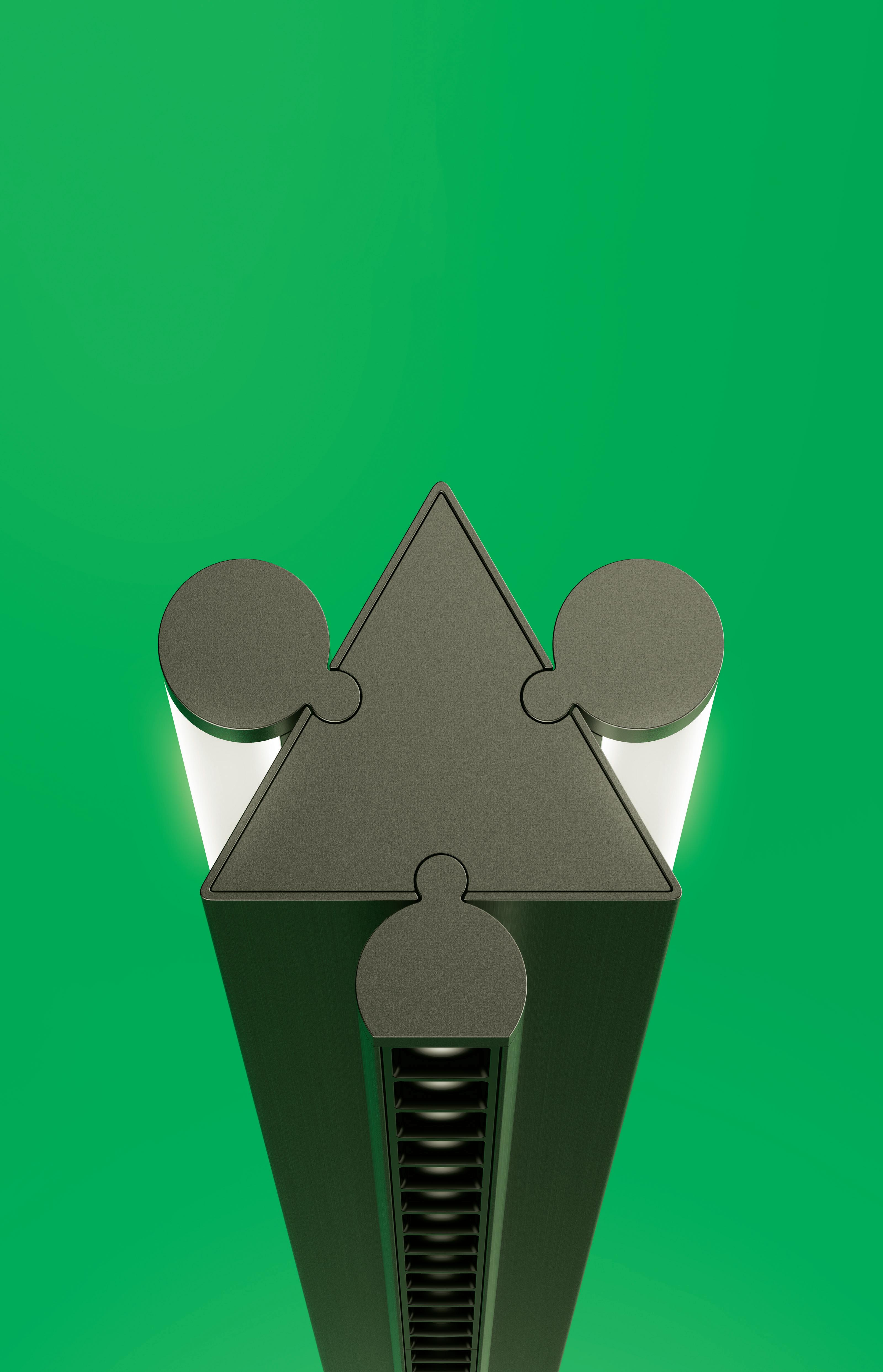 A triangular central core houses the electronic components and can also accommodate management intelligence. On all three sides it supports light diffuser tubes that distribute the light emission softly and evenly in the space.