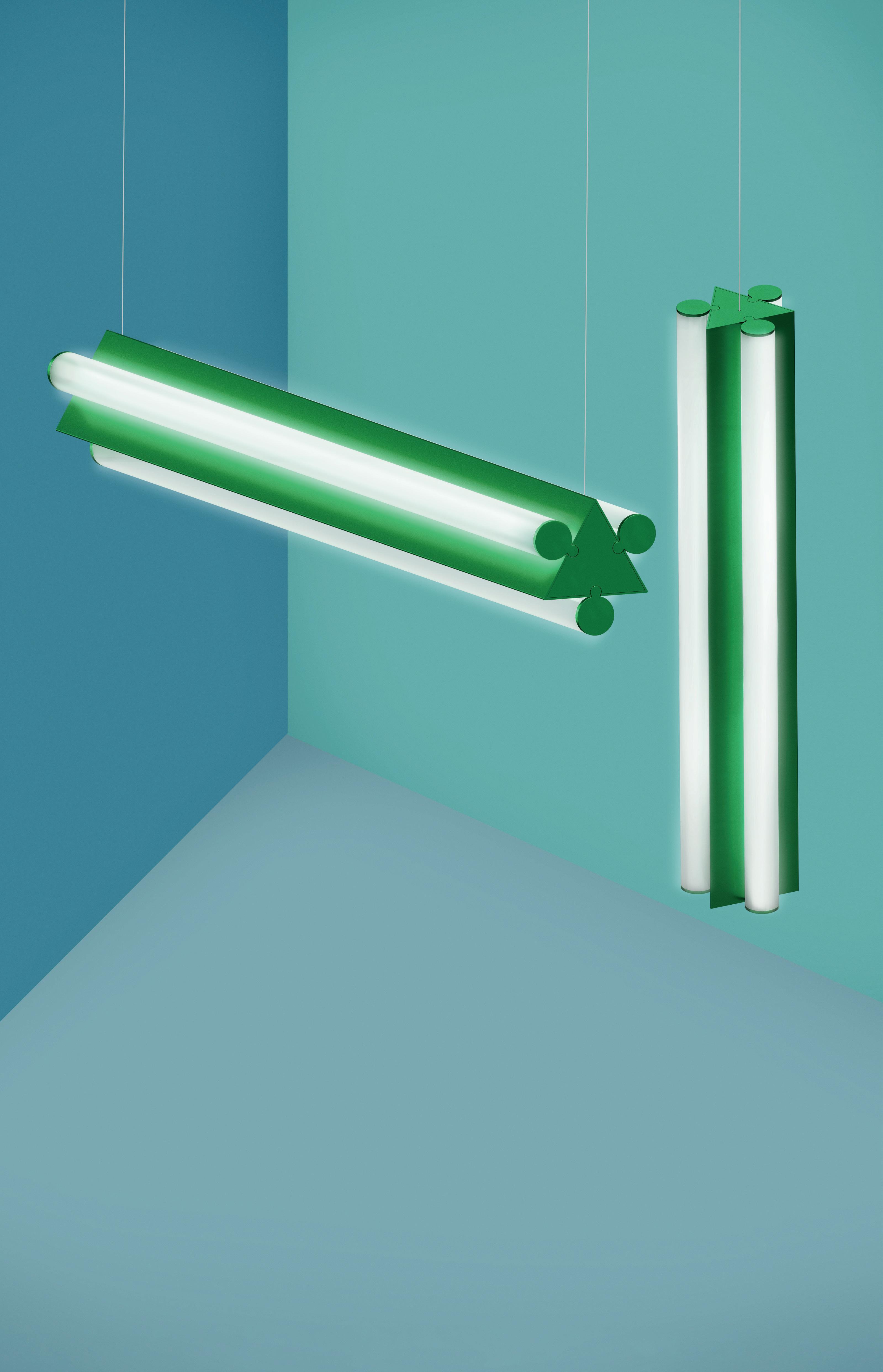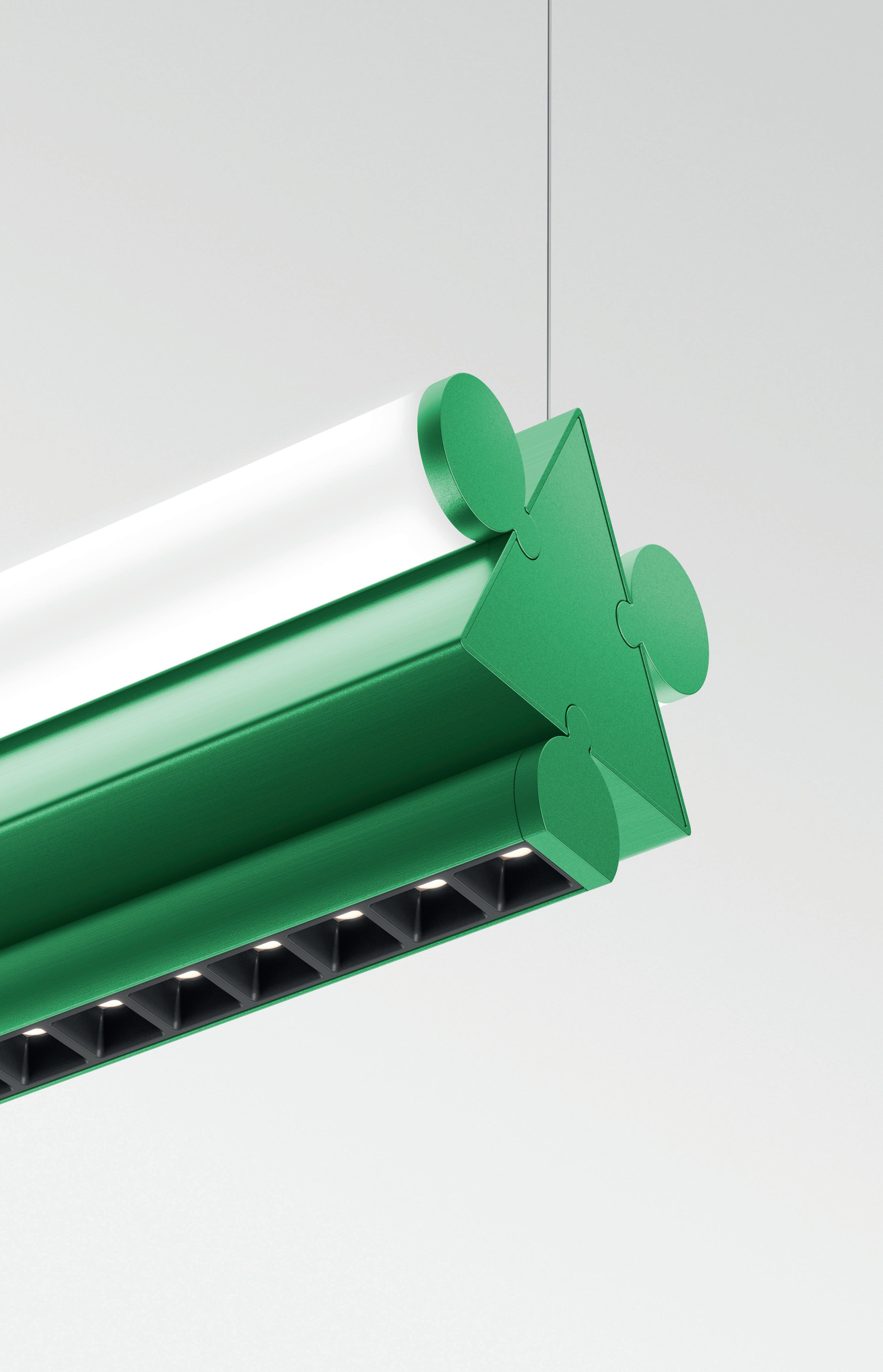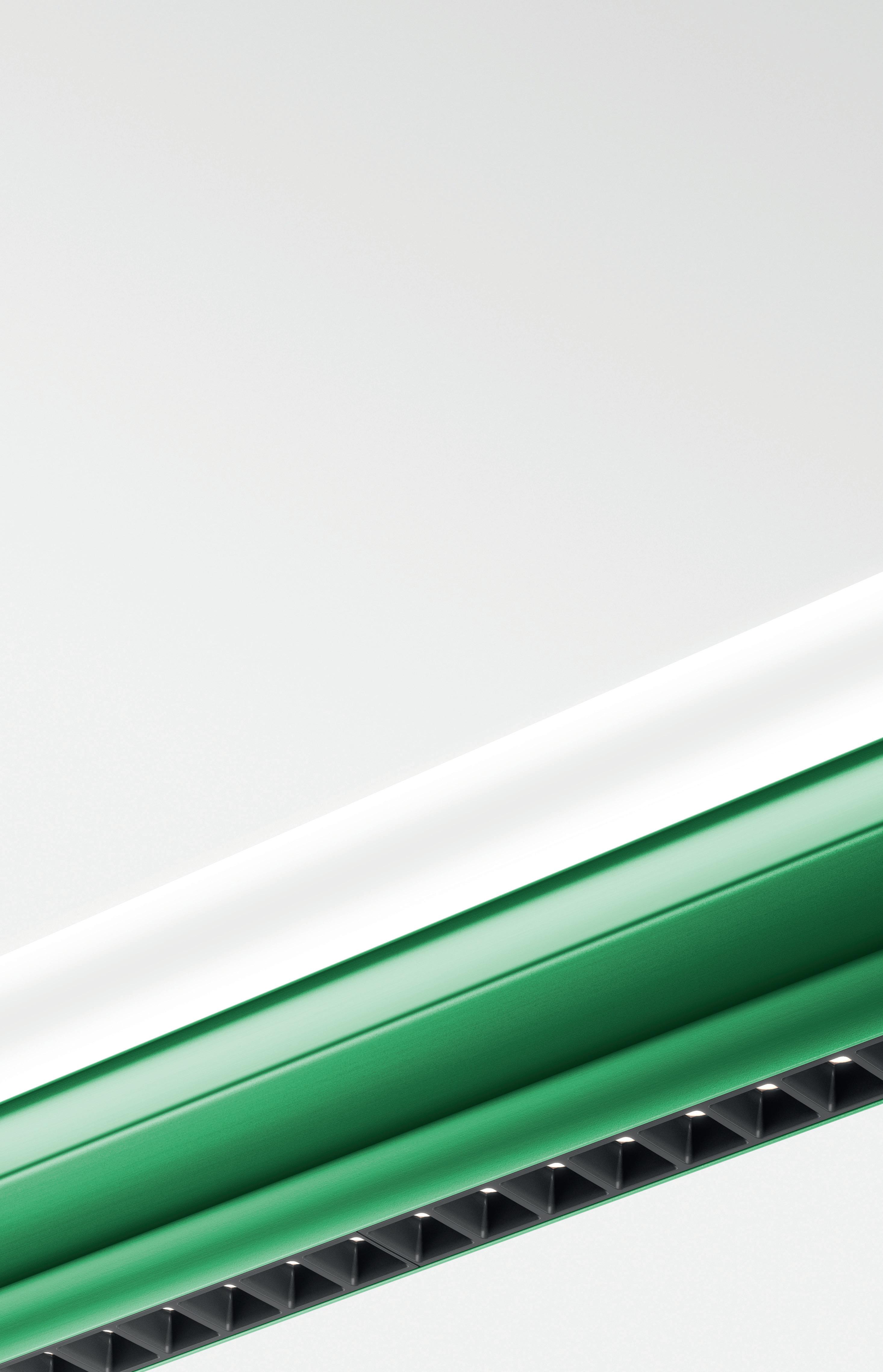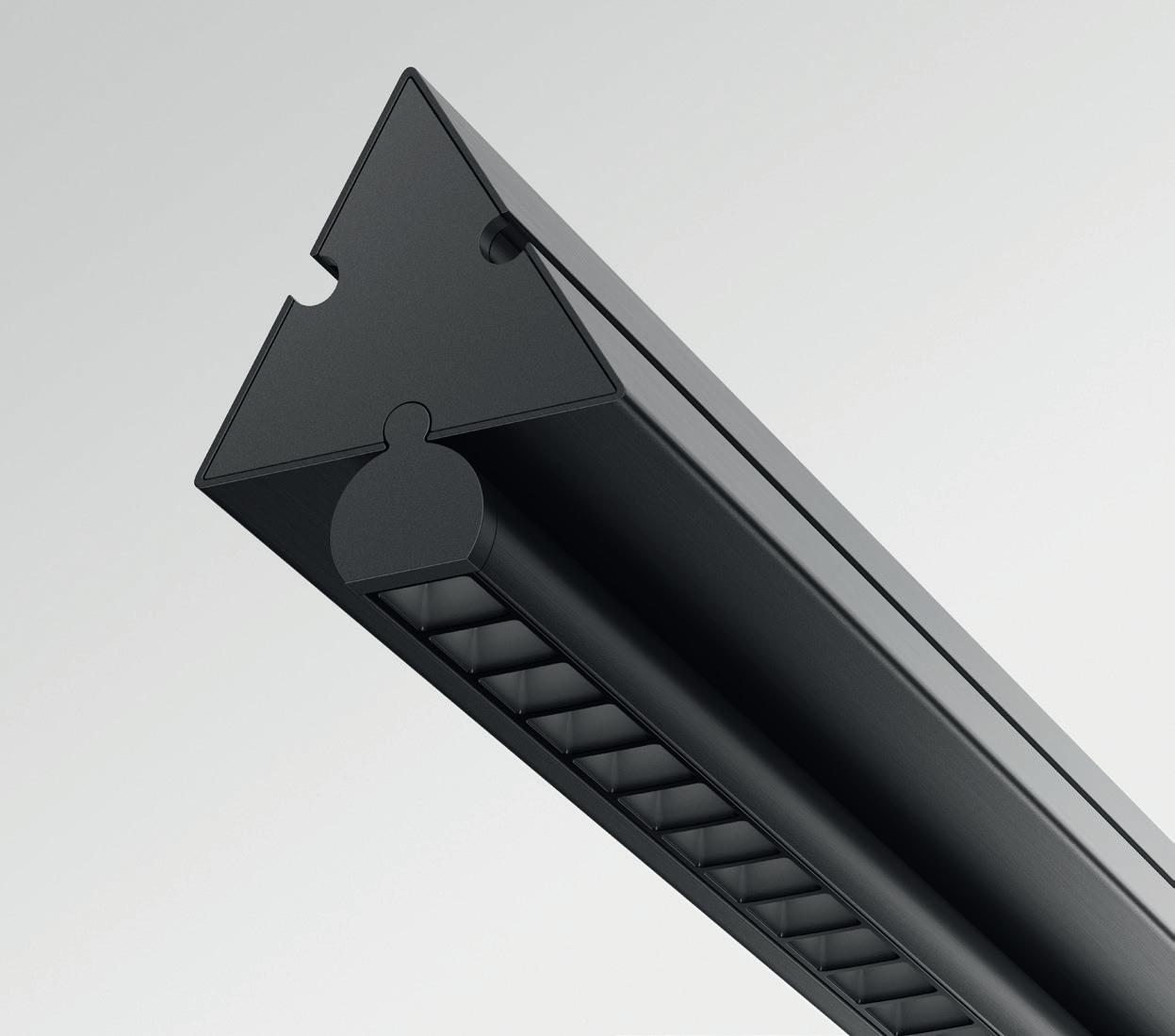 A triangular central core houses the electronic components and can also accommodate management intelligence. On all three sides it supports light diffuser tubes that distribute the light emission softly and evenly in the space.