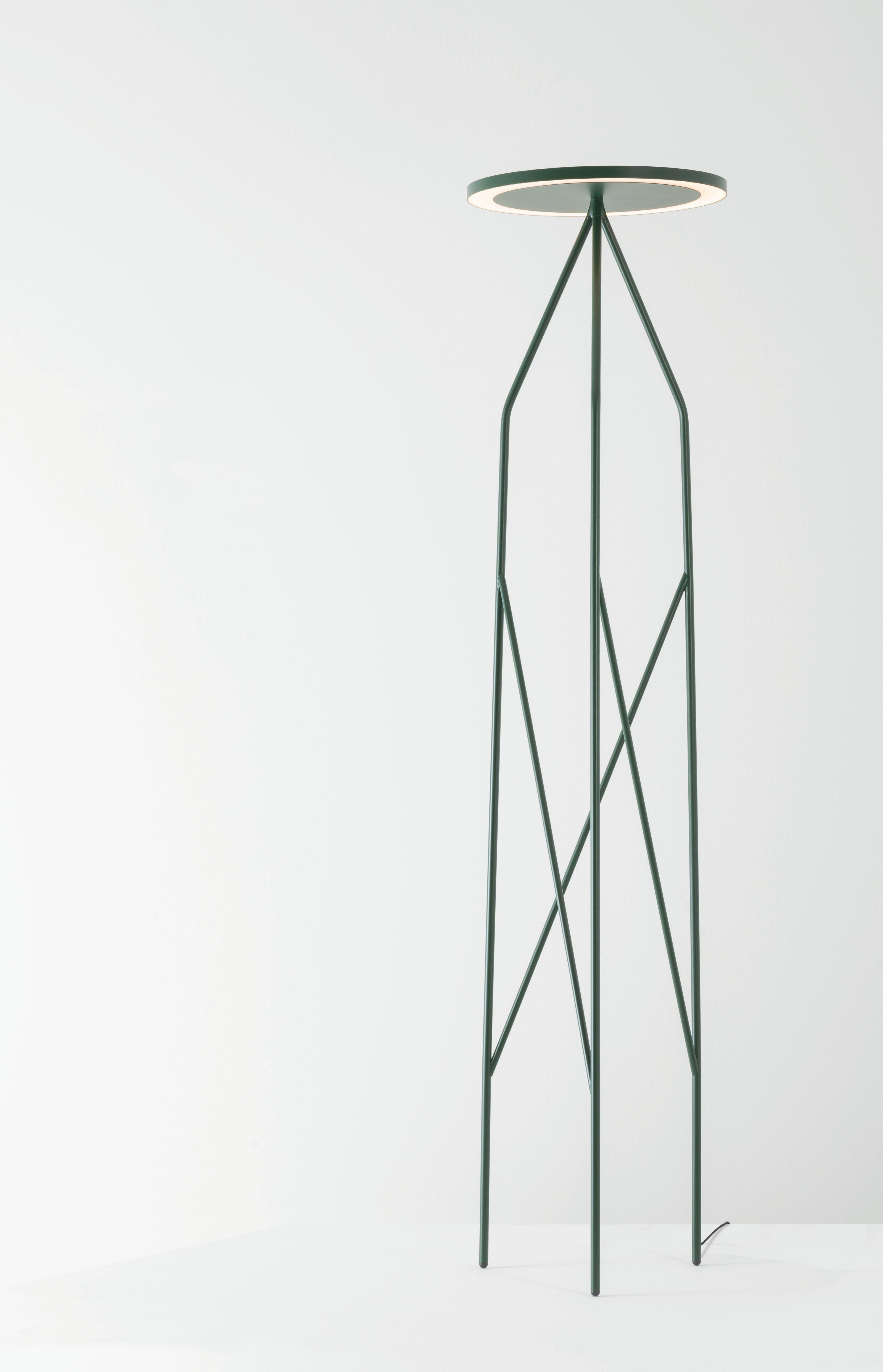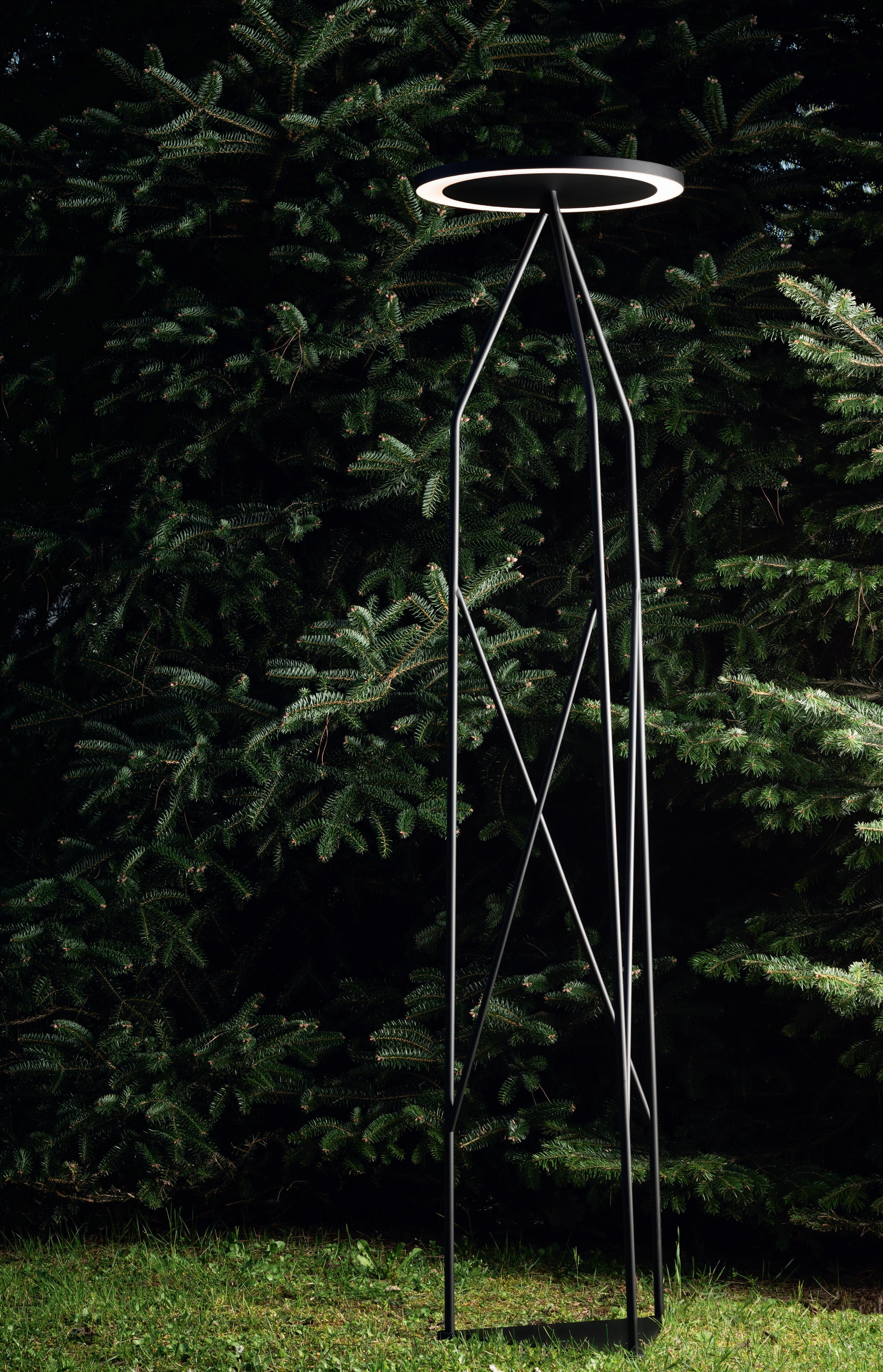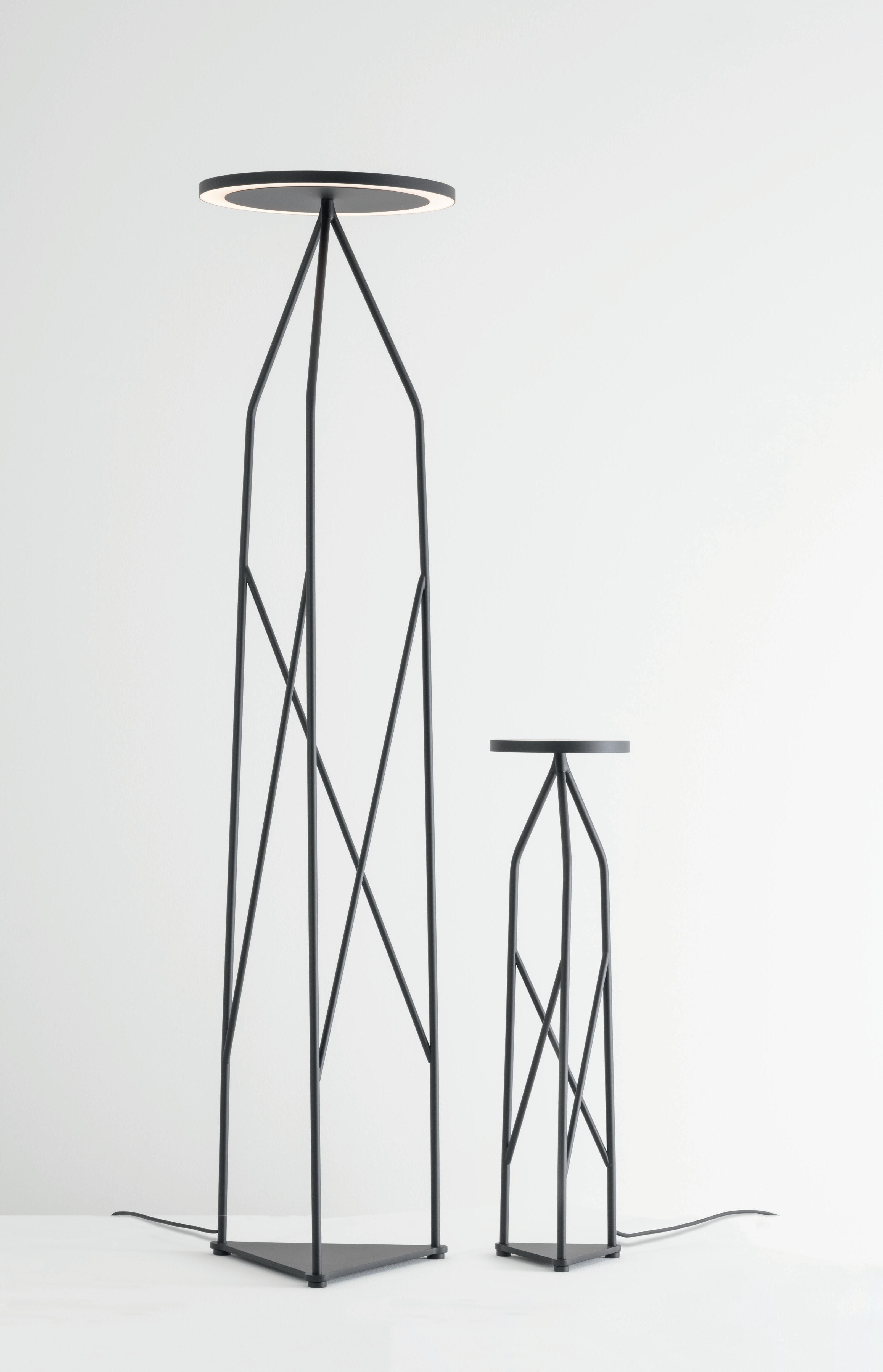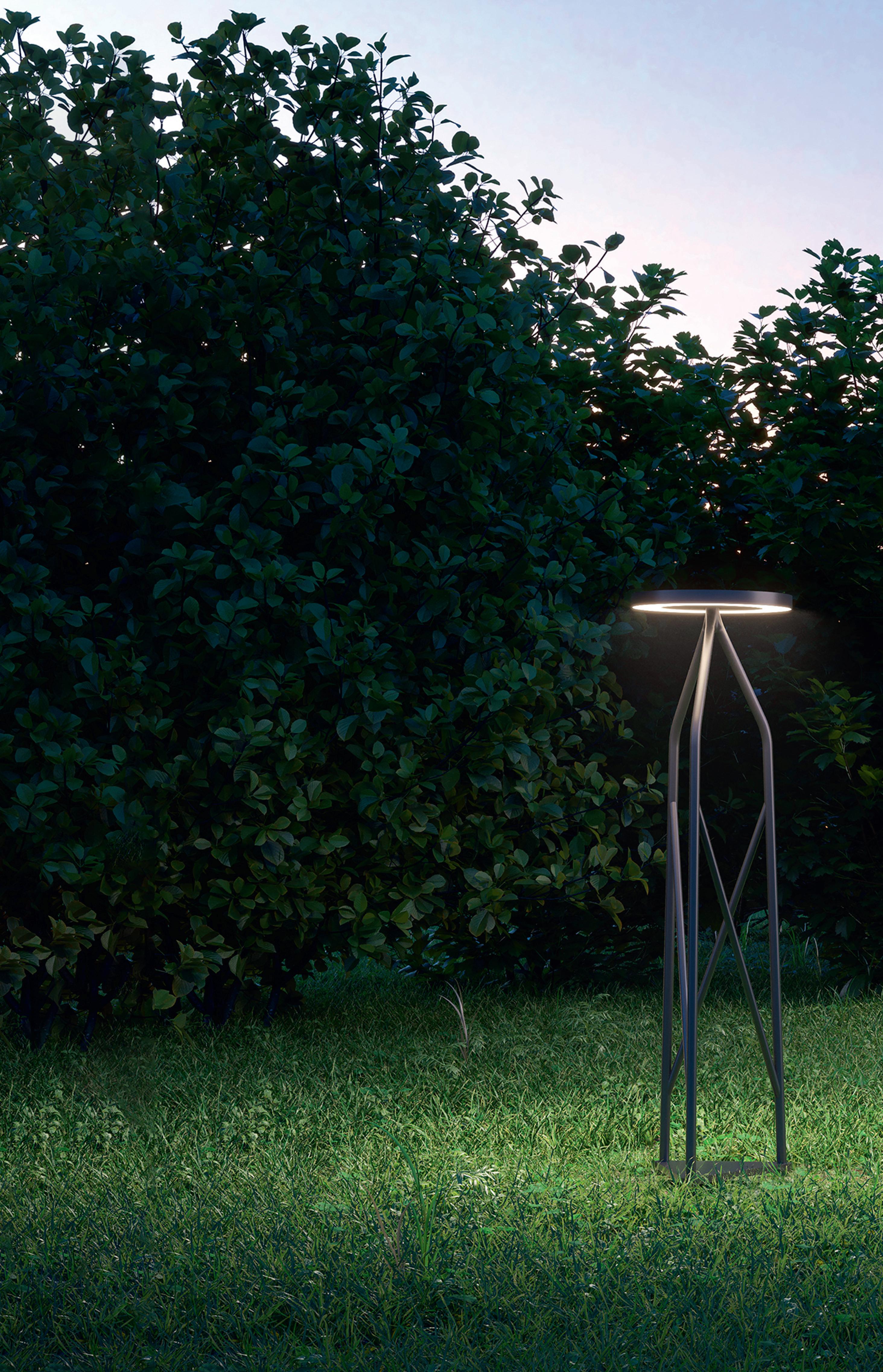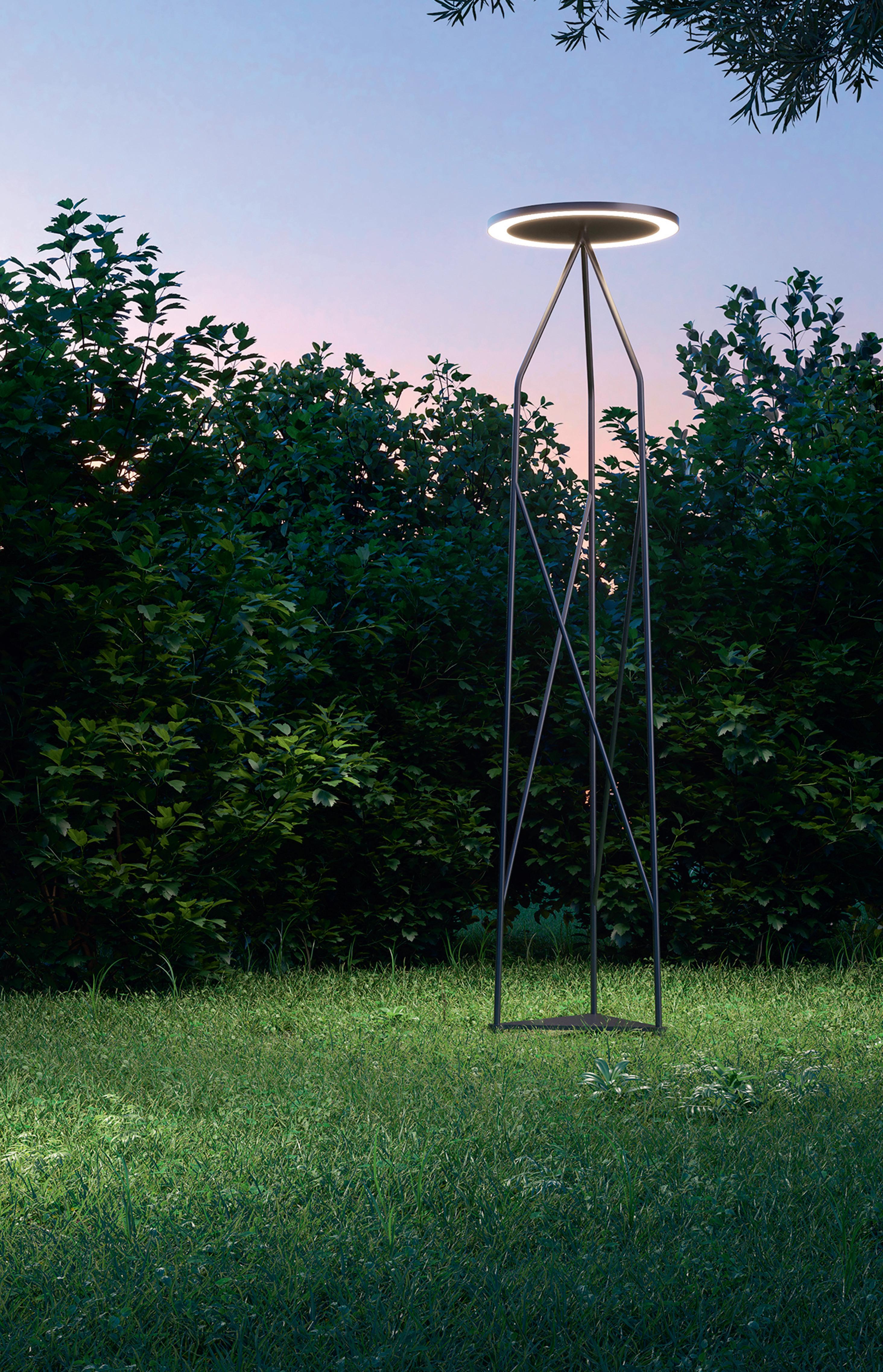 Trilix is a family of lamps for indoor and outdoor spaces featuring a lightweight structure, comprised of three elements that are intertwined to give stability and support to a flat disc with a ring of direct light which is softly diffused in the surrounding space.