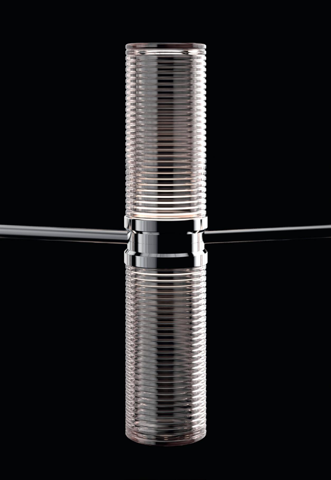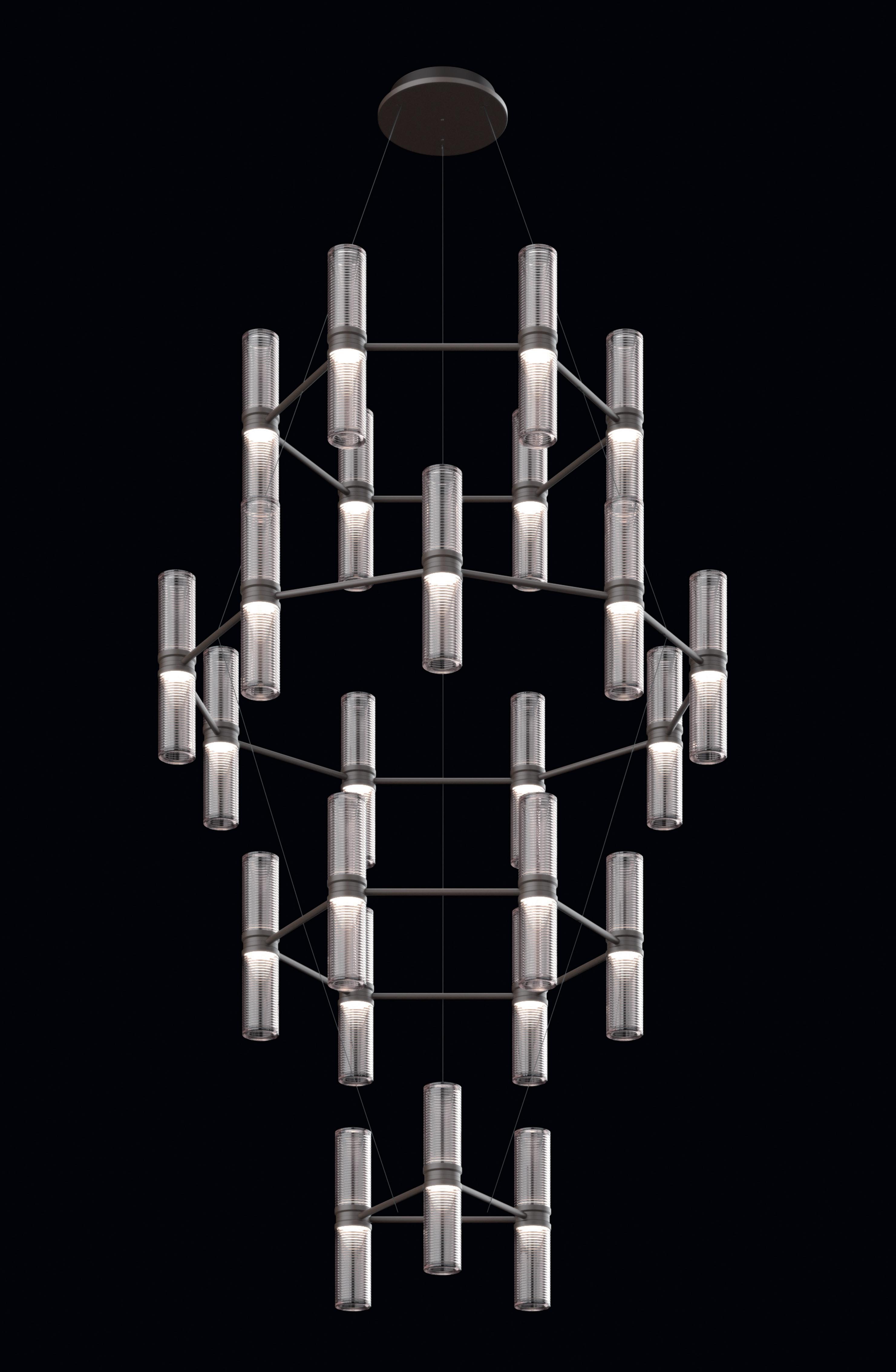 It is a contemporary interpretation of the traditional chandelier: the craftsmanship of the glass is combined with a simple shape and an optical flair to reinterpret glass processing technologies, not just through decorative pieces, but also as functional tools for controlling and distributing light.