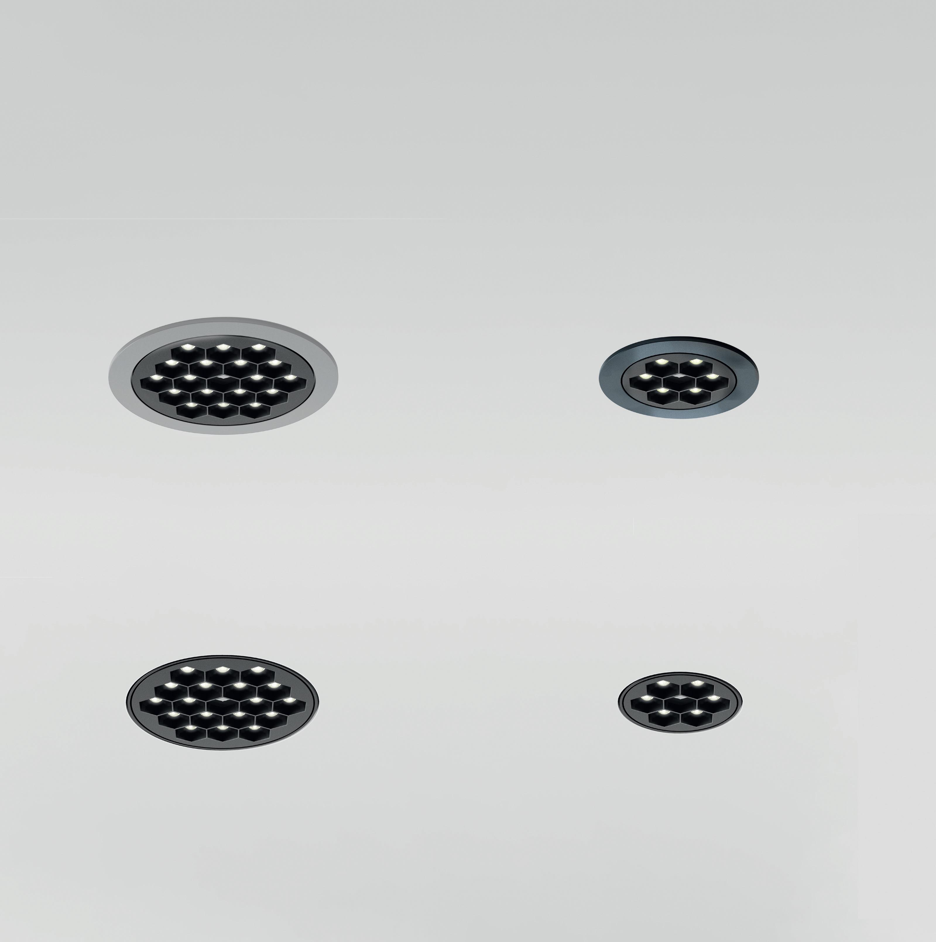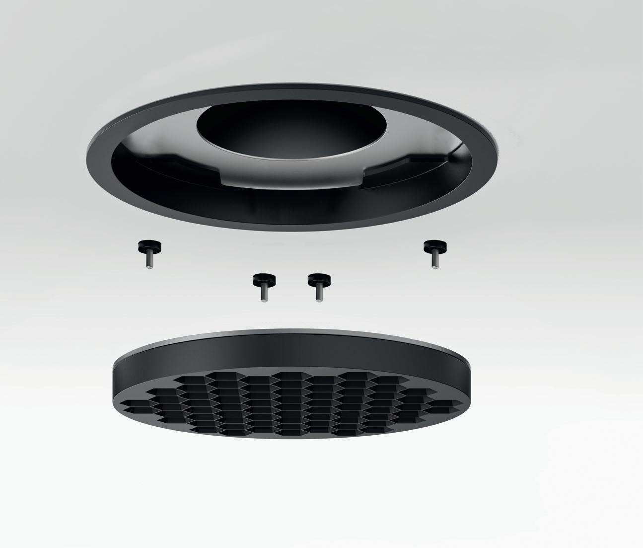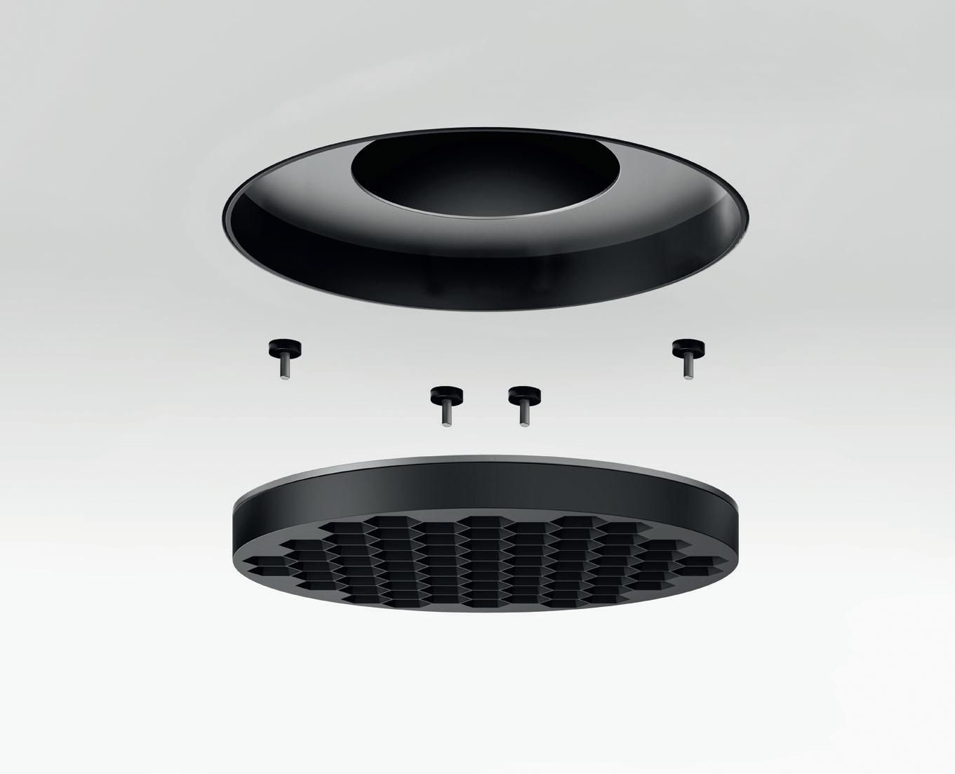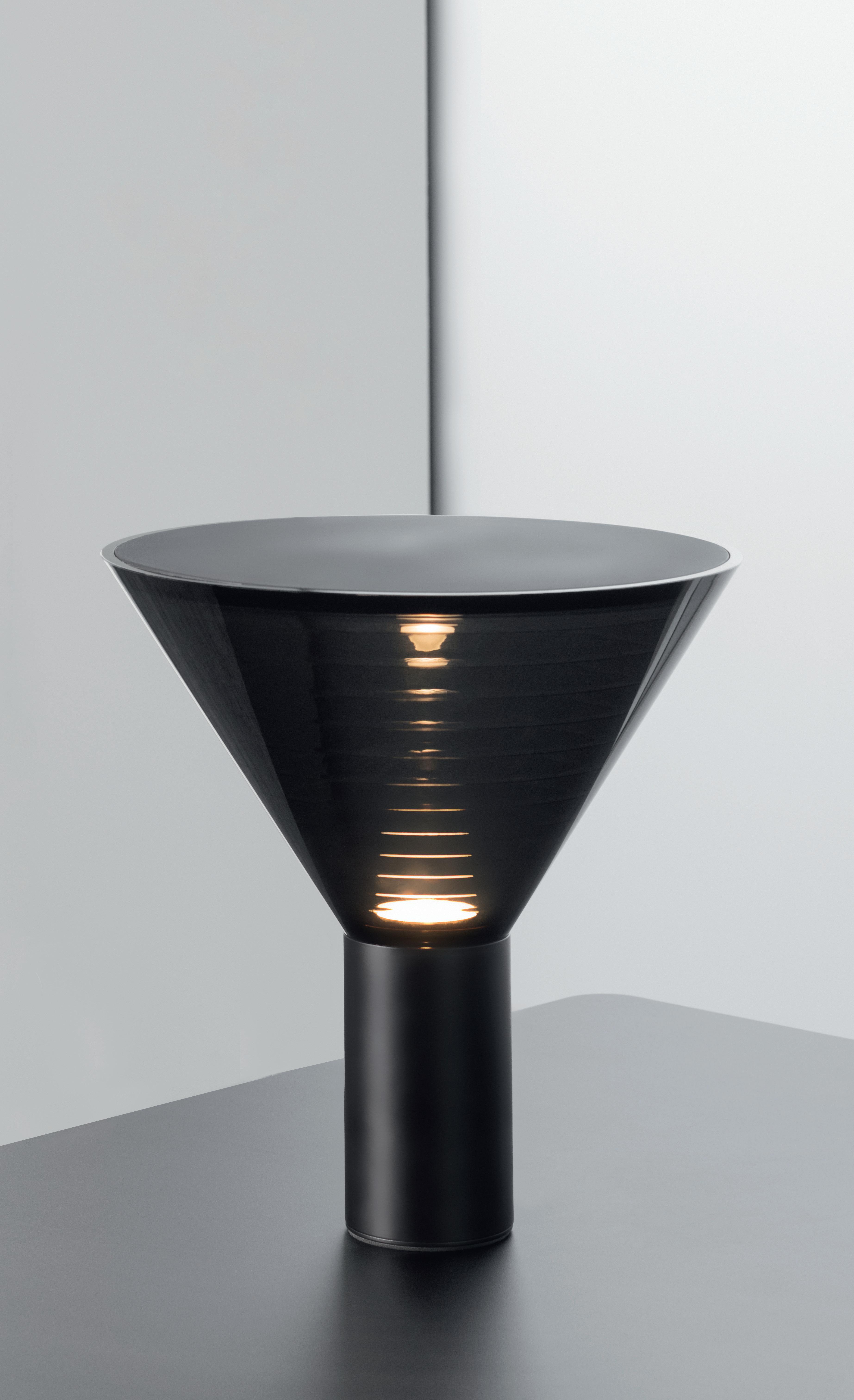 The cylindrical base houses the optic that precisely cuts the light inside the diffuser cone with a rather narrow beam and an optical geometry designed not to cause glare when viewed directly. The upper surface reflects the light inside the diffuser, whose stepped inside geometry opens the light on the horizontal surface, also creating soft, scenographic shadows.