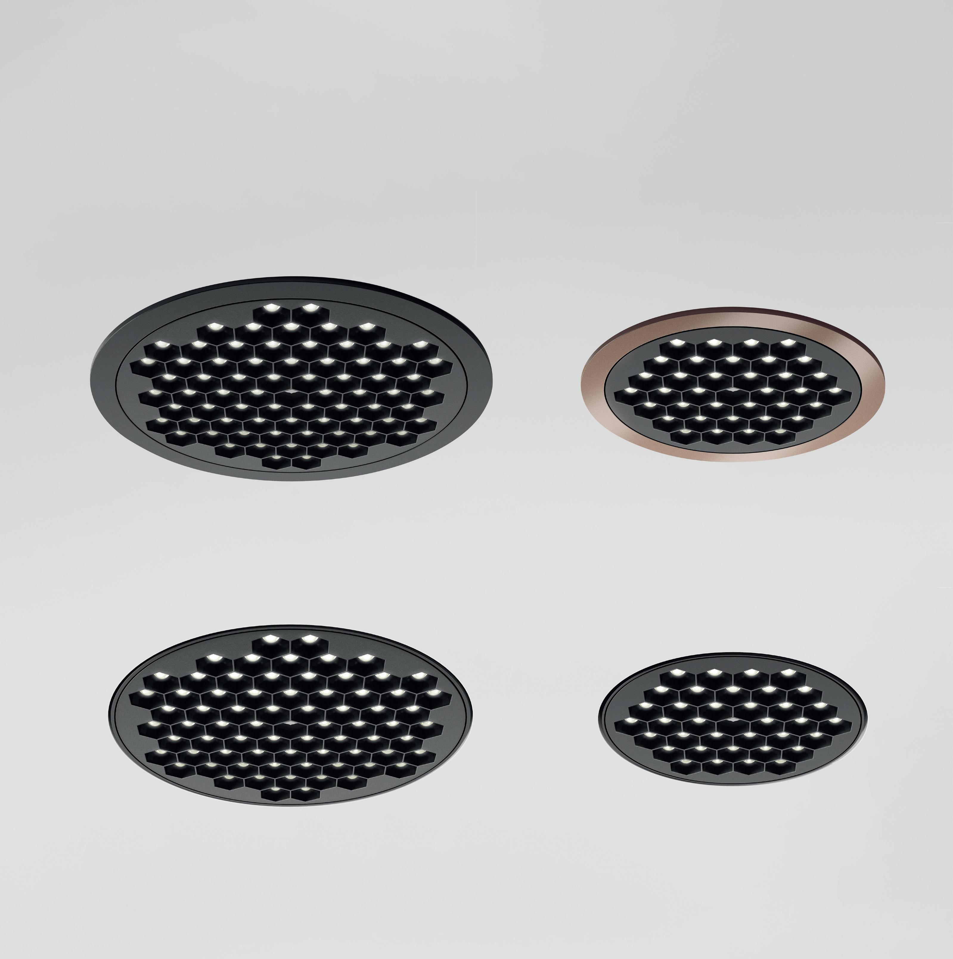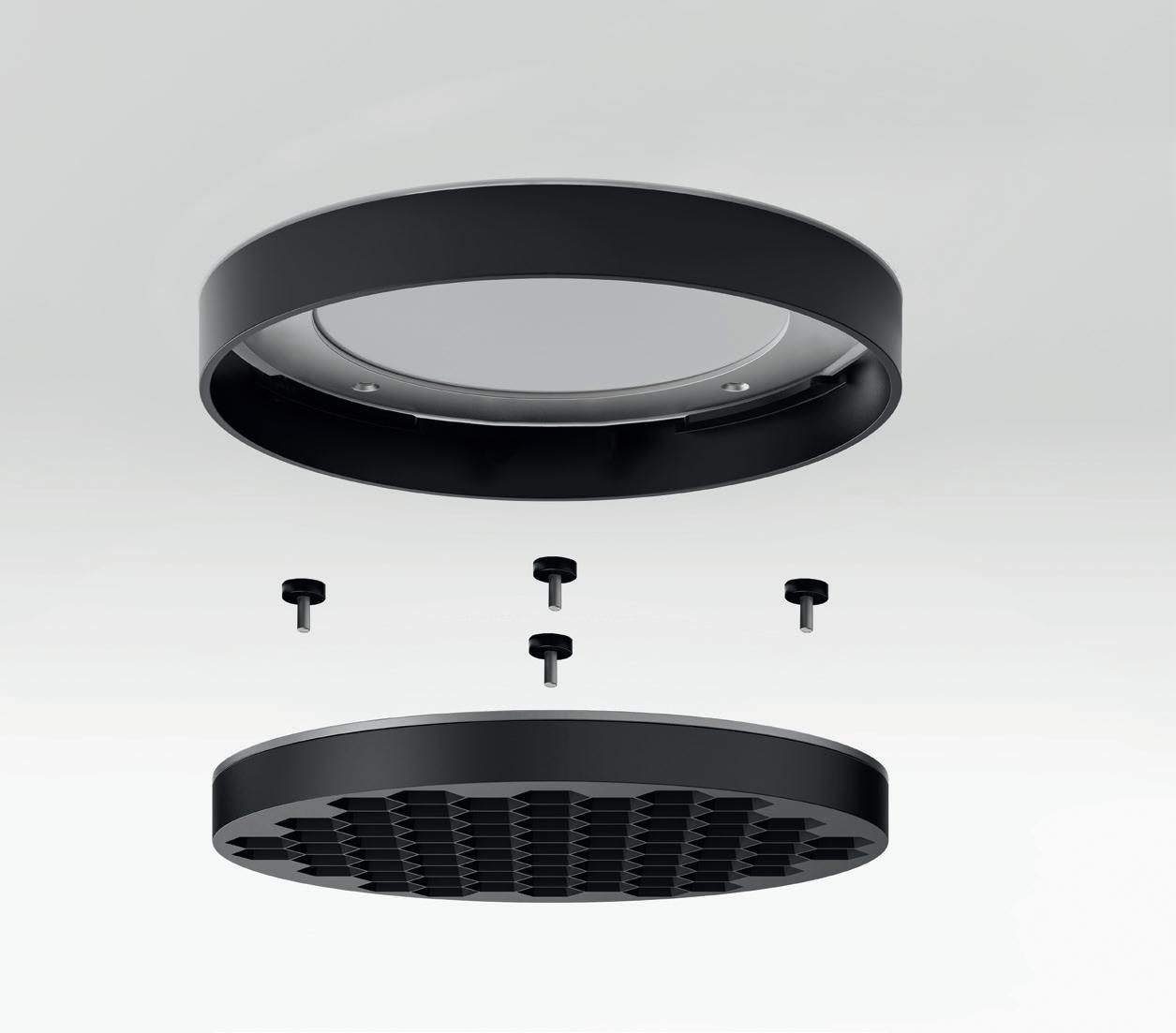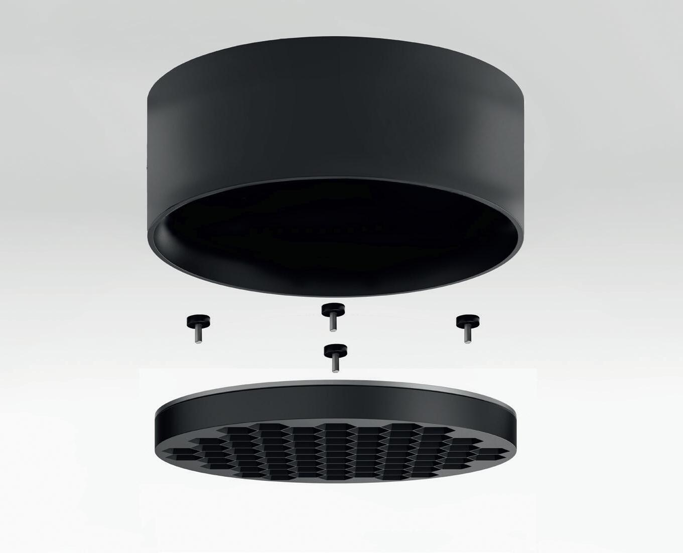 The cylindrical base houses the optic that precisely cuts the light inside the diffuser cone with a rather narrow beam and an optical geometry designed not to cause glare when viewed directly. The upper surface reflects the light inside the diffuser, whose stepped inside geometry opens the light on the horizontal surface, also creating soft, scenographic shadows.