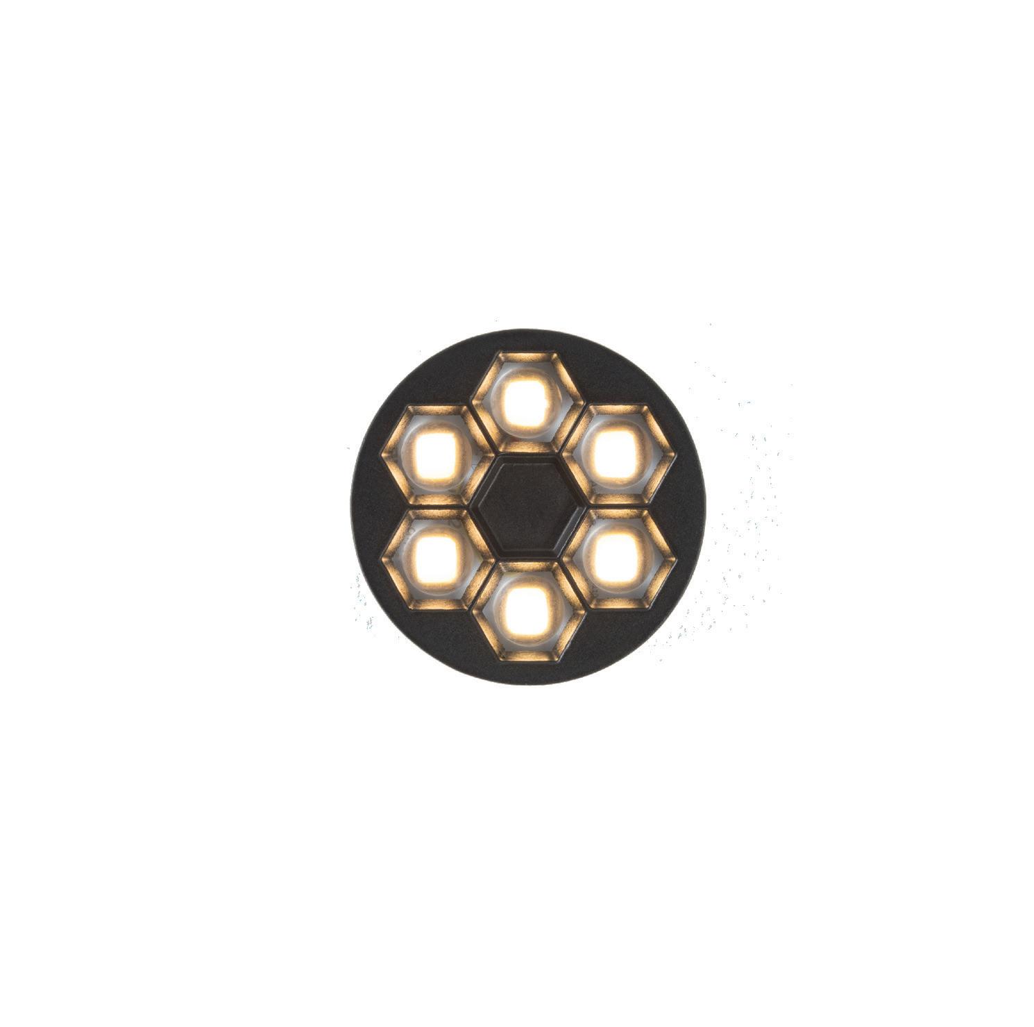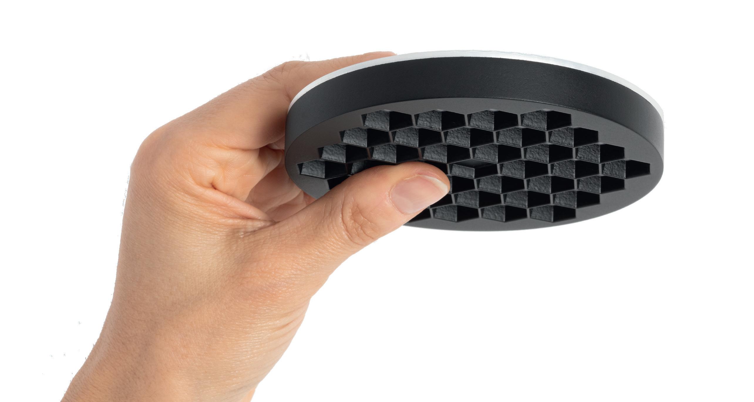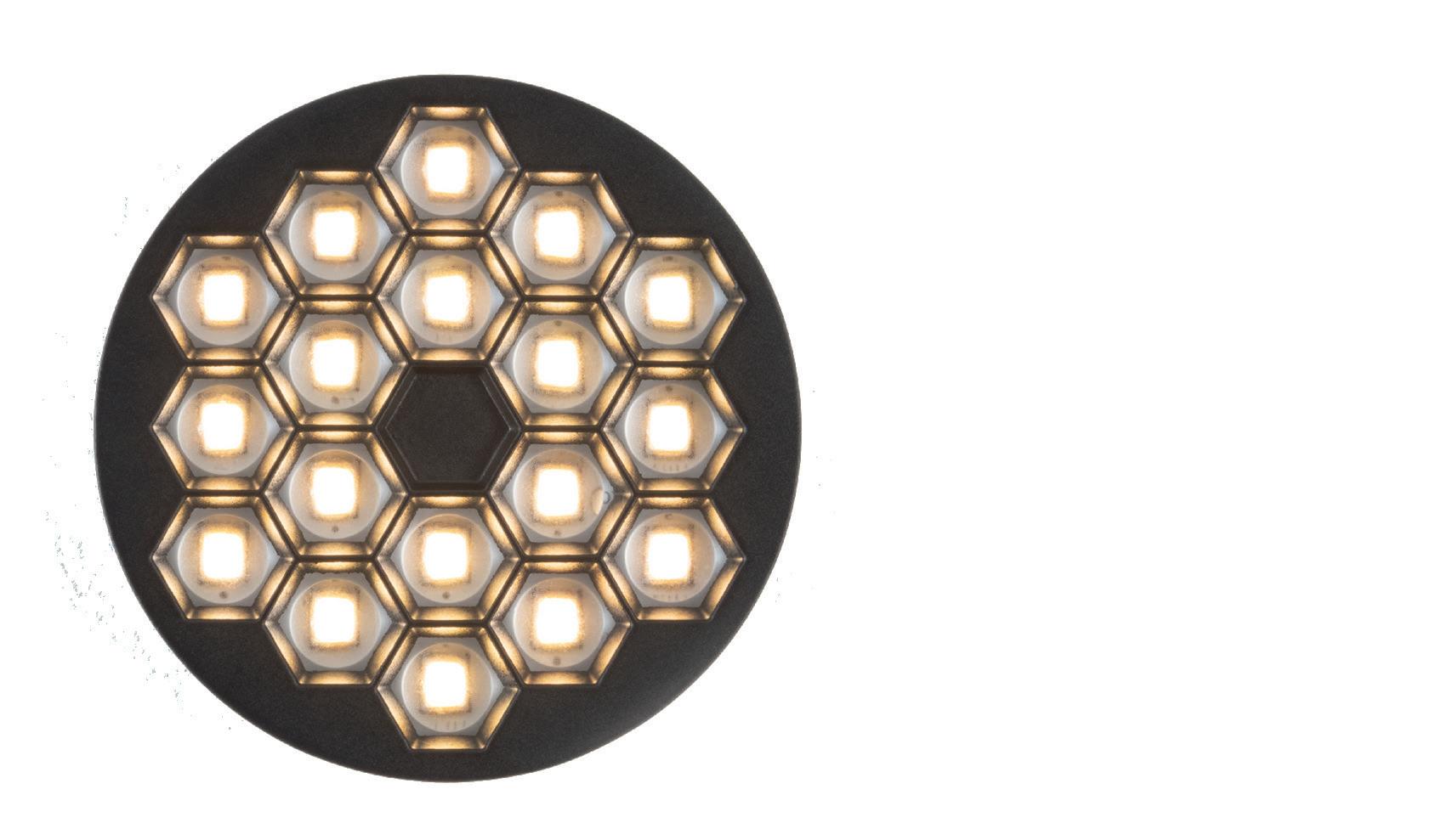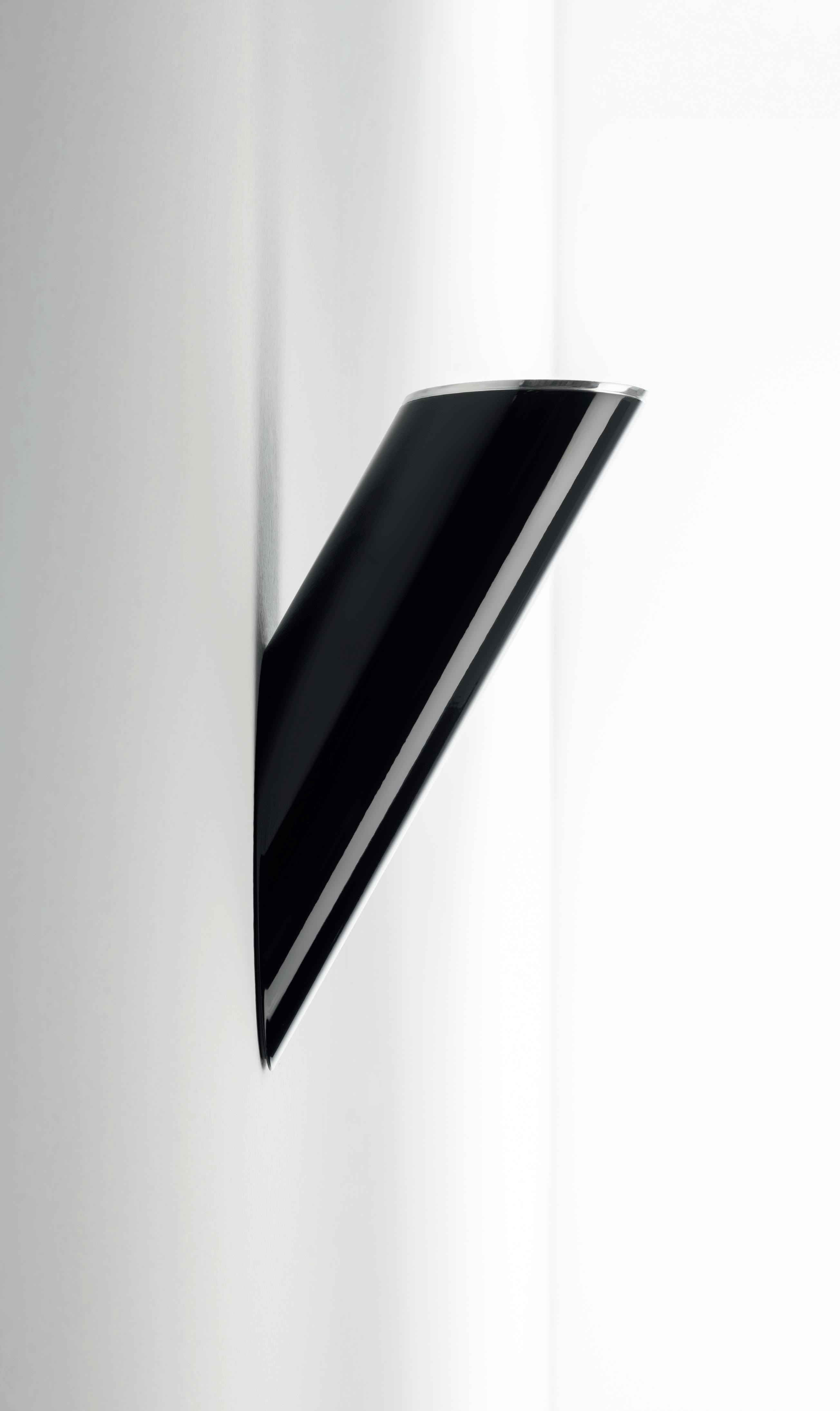 The cylindrical base houses the optic that precisely cuts the light inside the diffuser cone with a rather narrow beam and an optical geometry designed not to cause glare when viewed directly. The upper surface reflects the light inside the diffuser, whose stepped inside geometry opens the light on the horizontal surface, also creating soft, scenographic shadows.