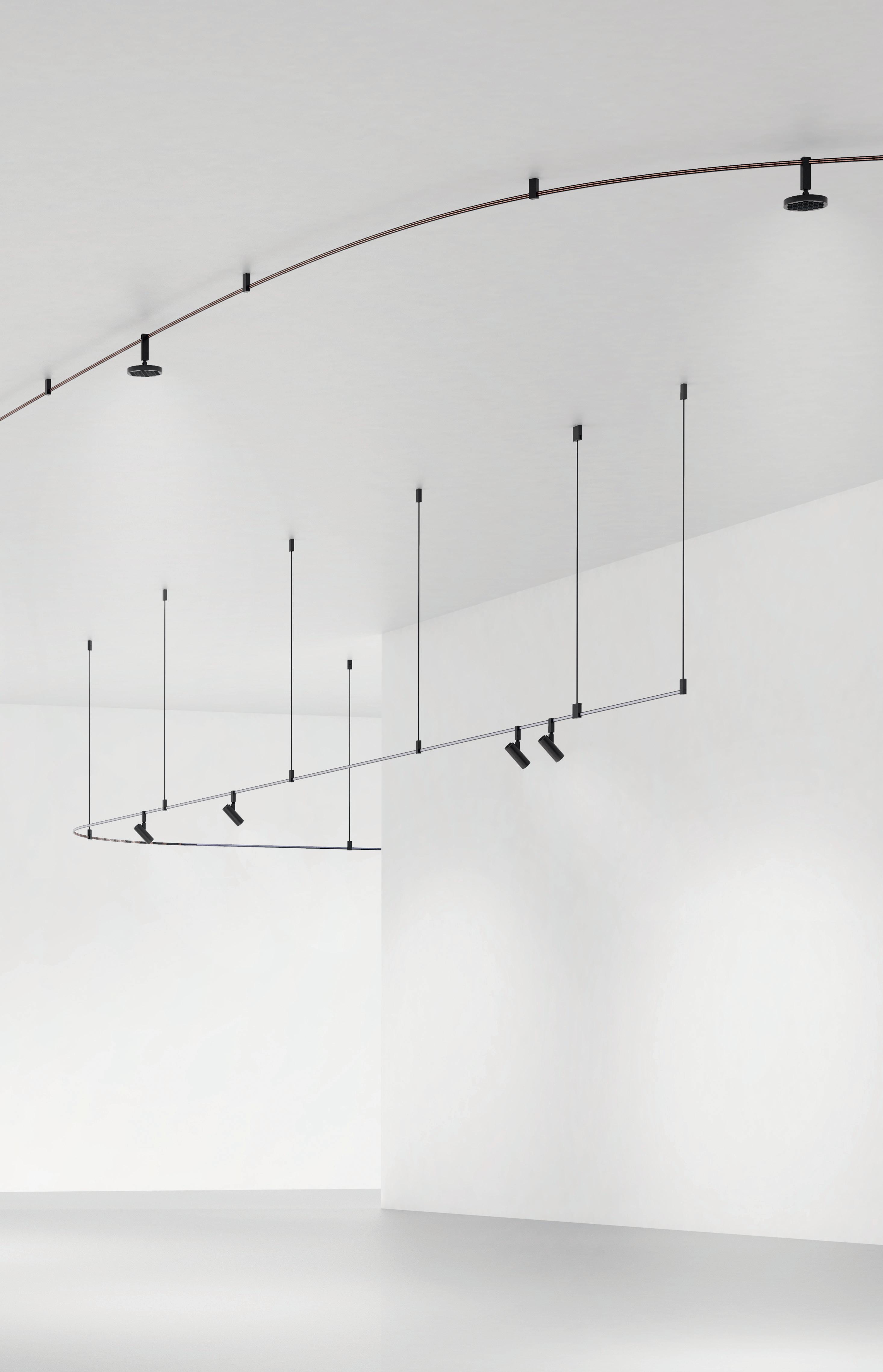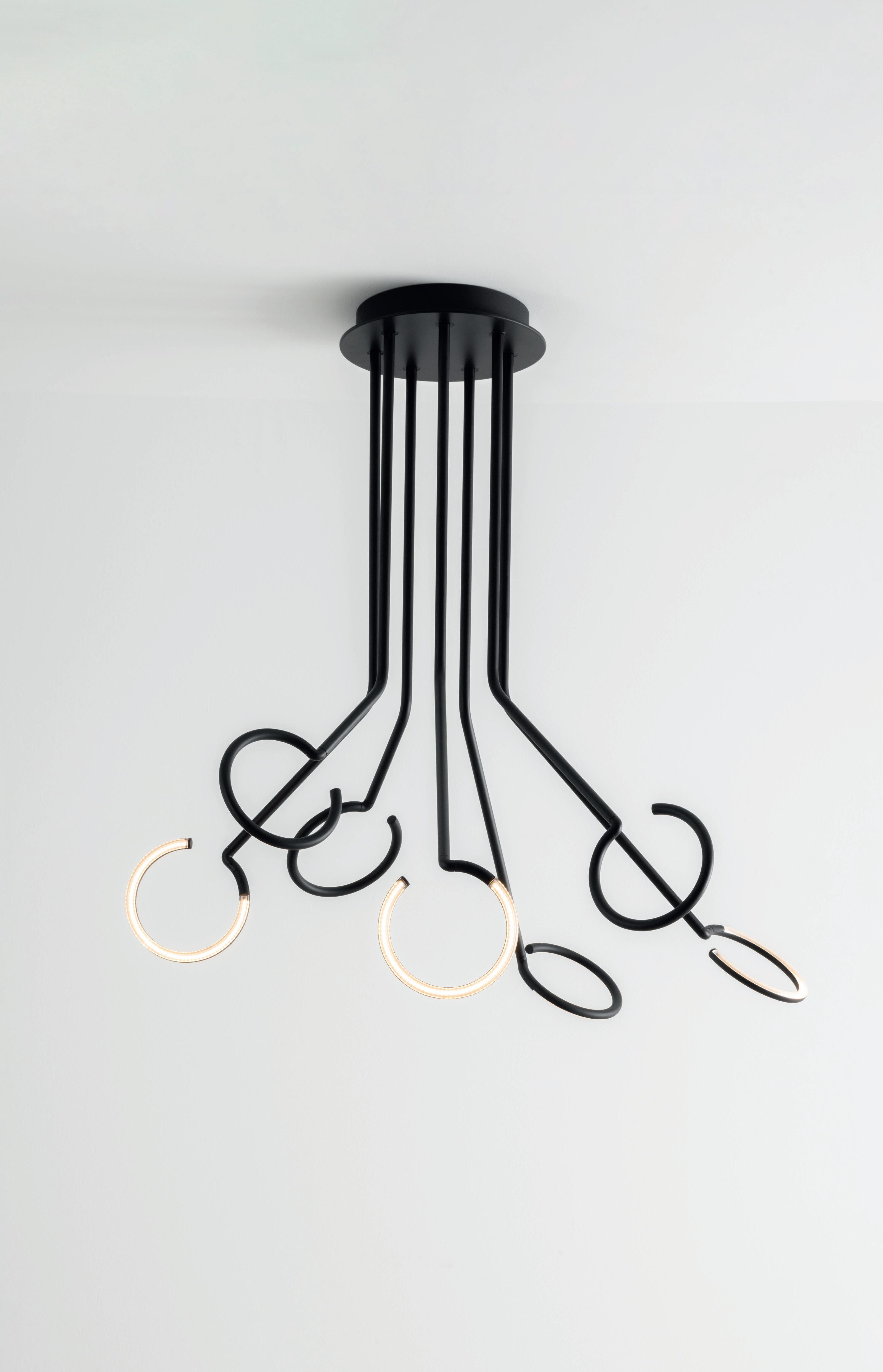 Veil suspension, presented in 2022, is the starting point for an entire family of solutions that share the same essential aesthetic of the illuminating arms. The flowing, precise curve of the arms reveals exceptional design and manufacturing expertise: the mere 25 mm diameter combines the structure with an optics that control the light, and softly diffuses it into the environment.