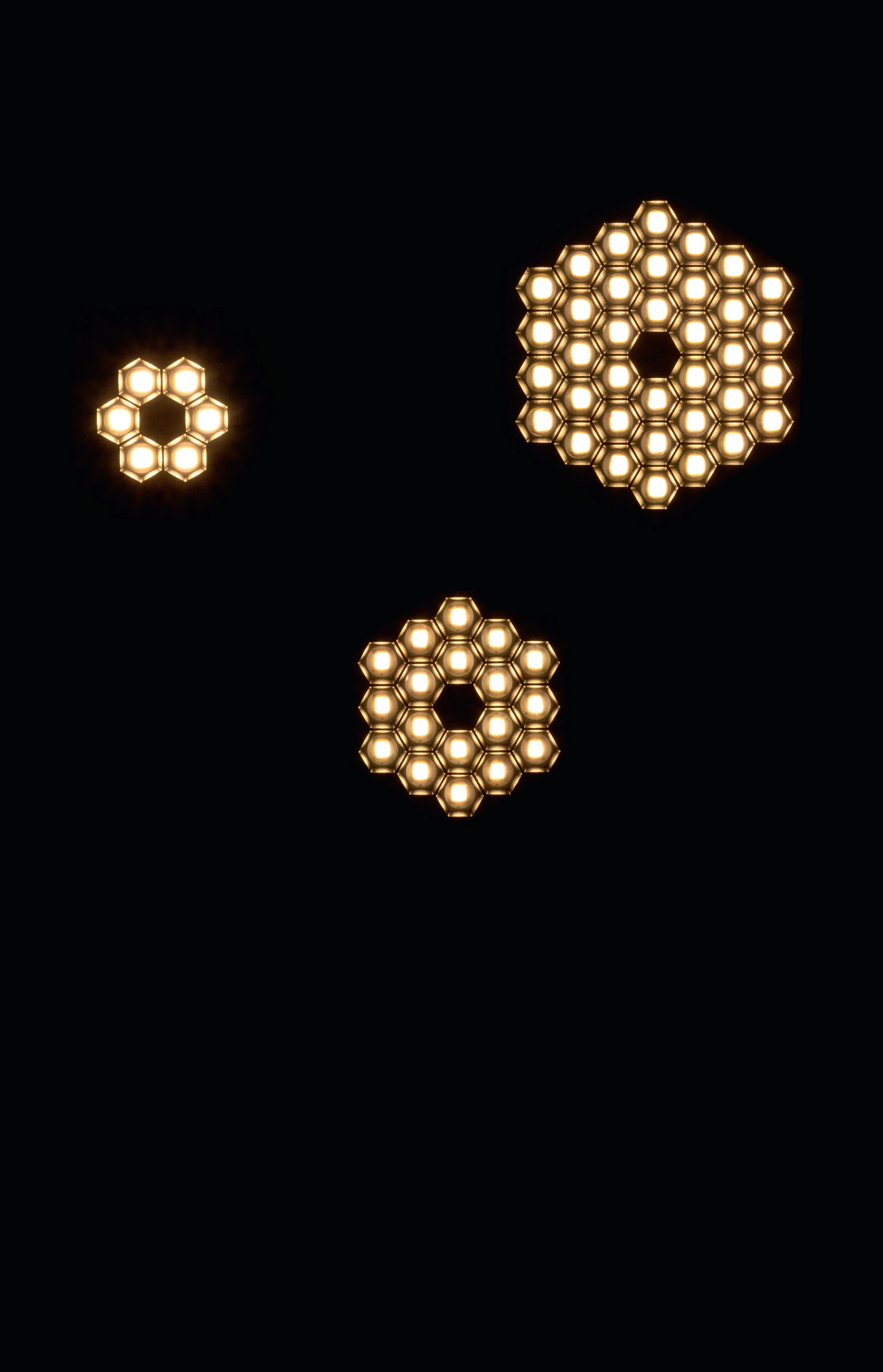 The modular element is a double cylindrical diffuser with a central body that encloses the light sources and, by means of two rings rotating on the same axis, defines the position of the neighbouring lighting bodies by positioning the connecting structural elements.