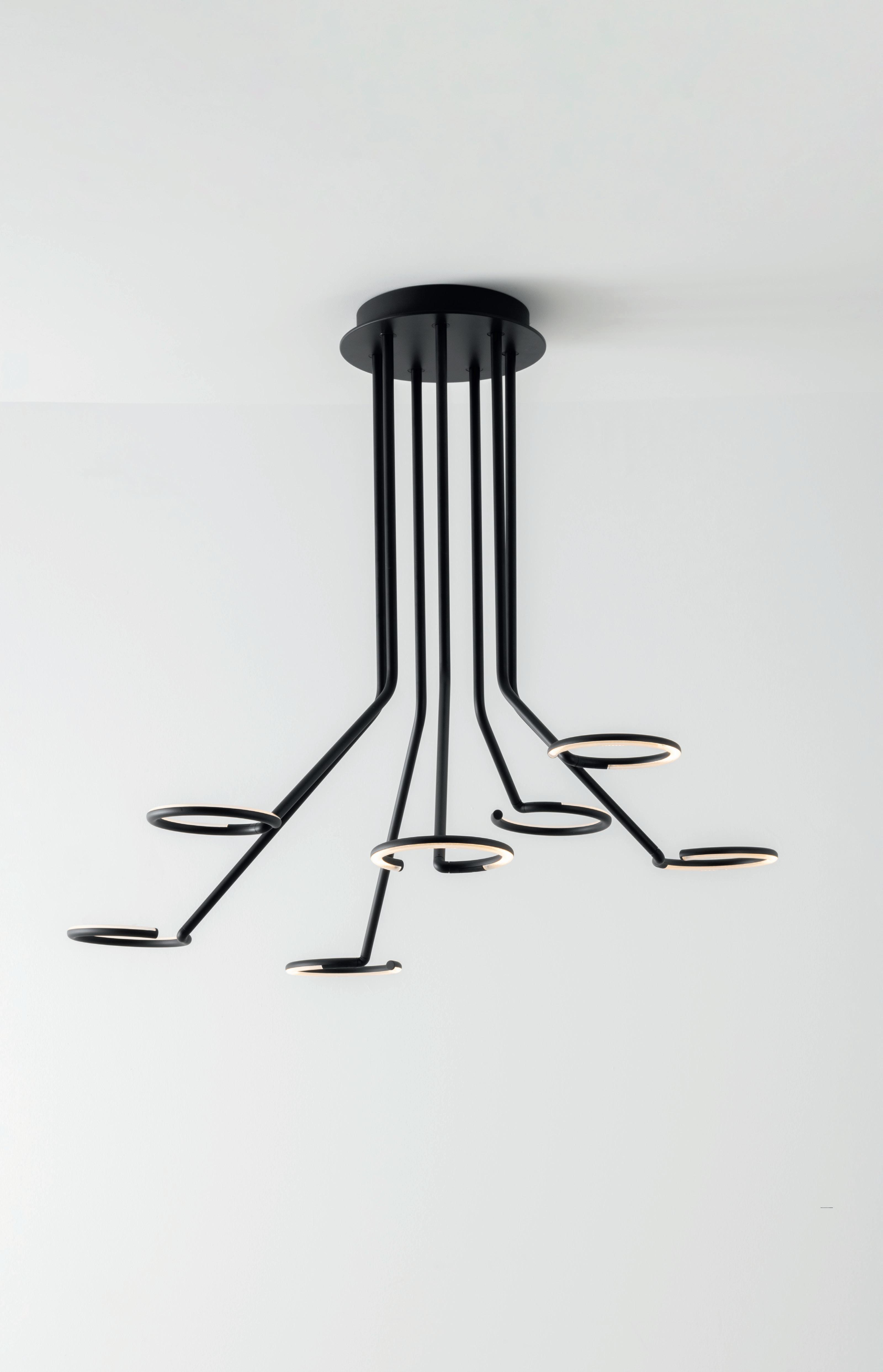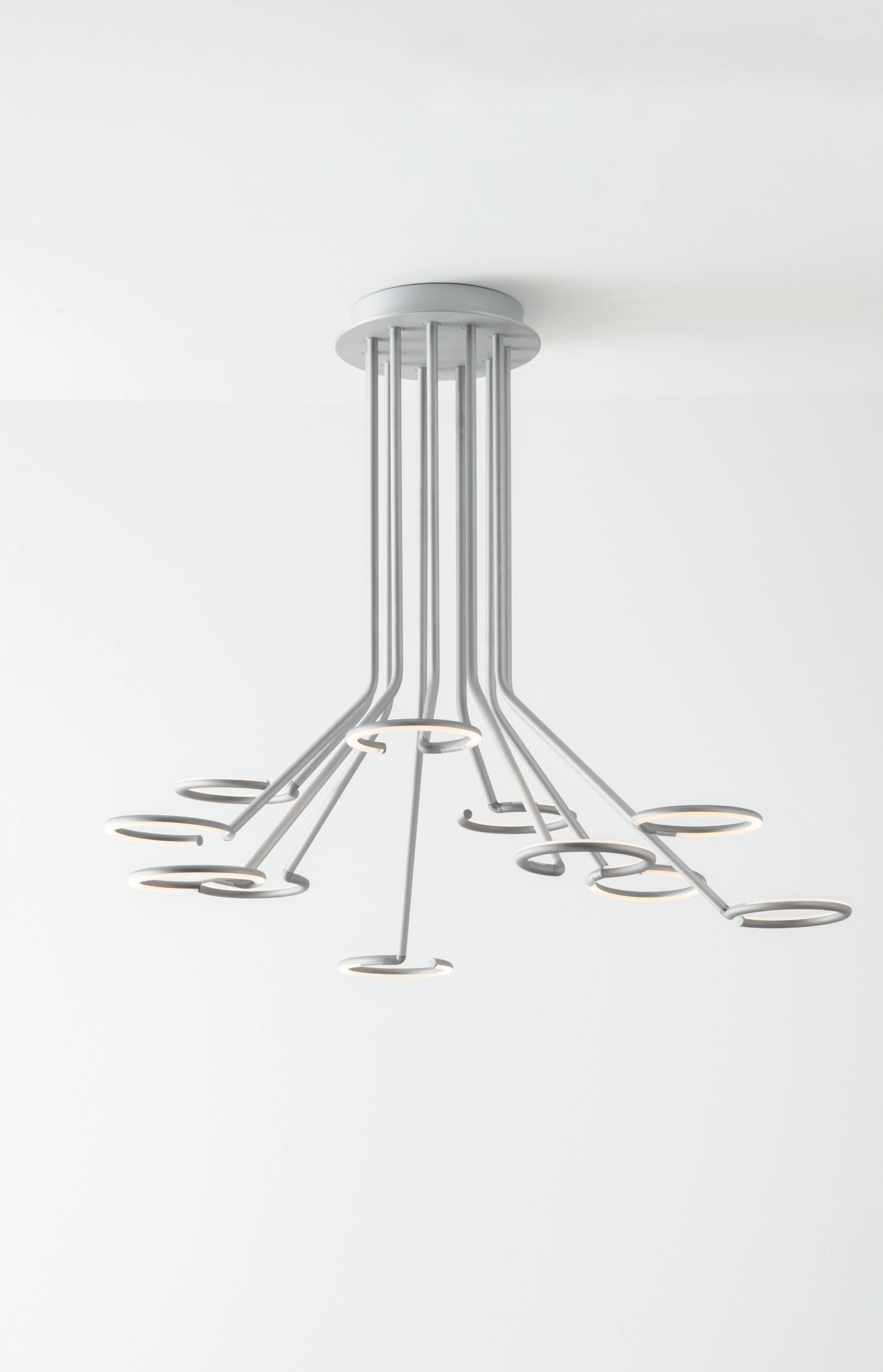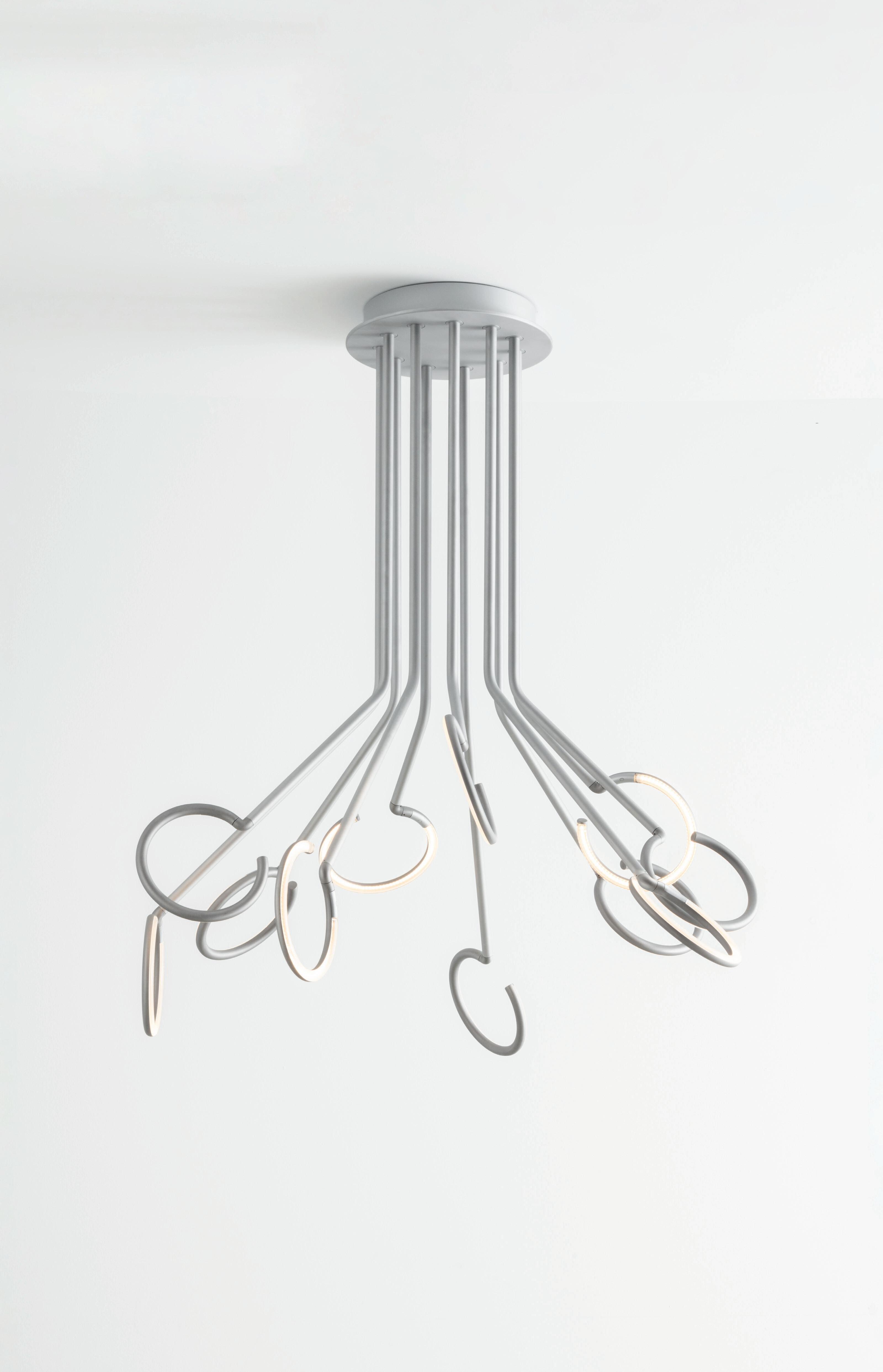 The Vine Light collection has been completed with two chandeliers. The arm and head of Vine Light table have been repeated to create two innovative solutions: seven or eleven arms generate two suspension lamps that release a new freedom of light.