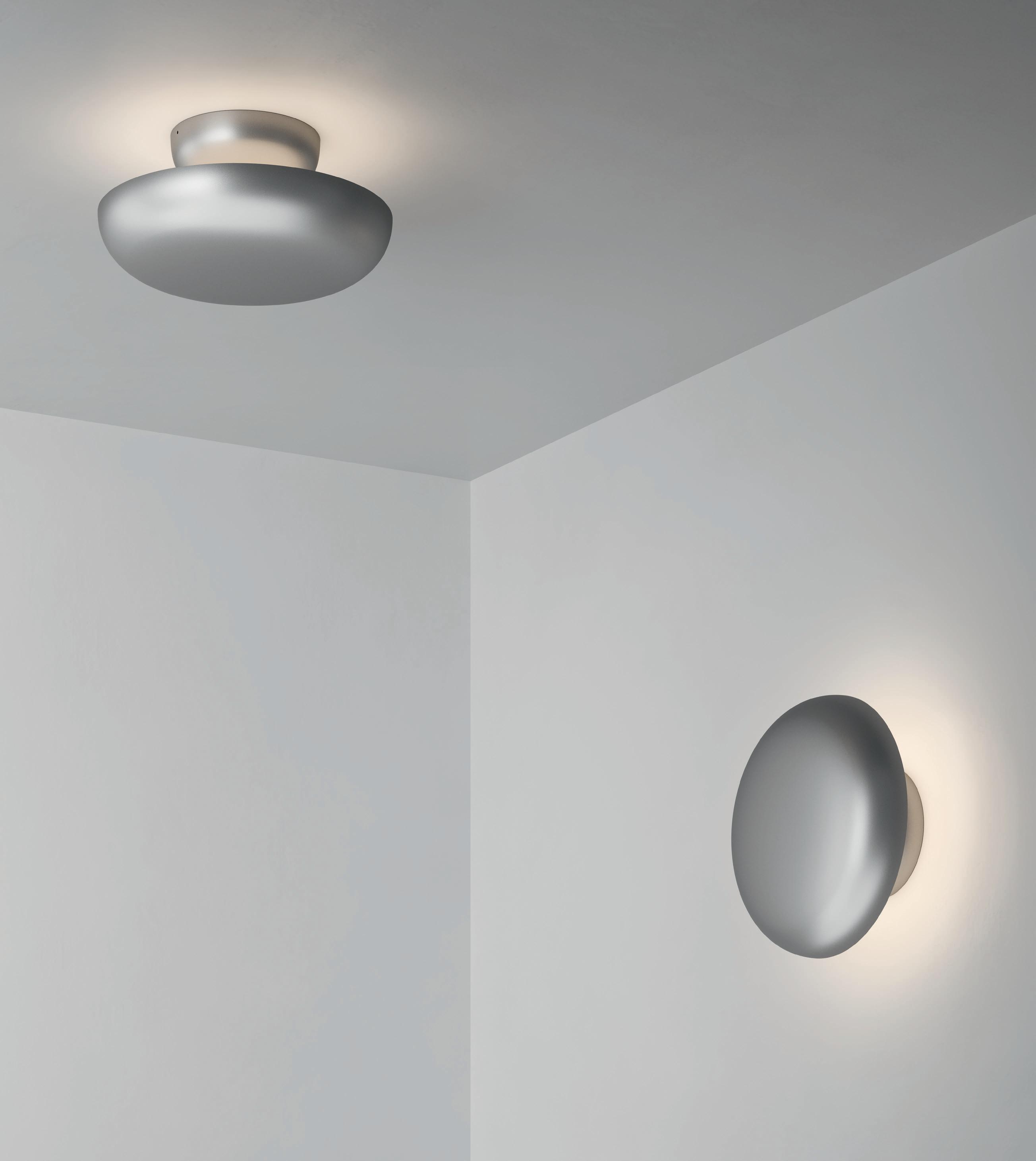 In the wall lamp version, the section is slanted to allow the cylindrical body to protrude and open up the light onto the surrounding space.