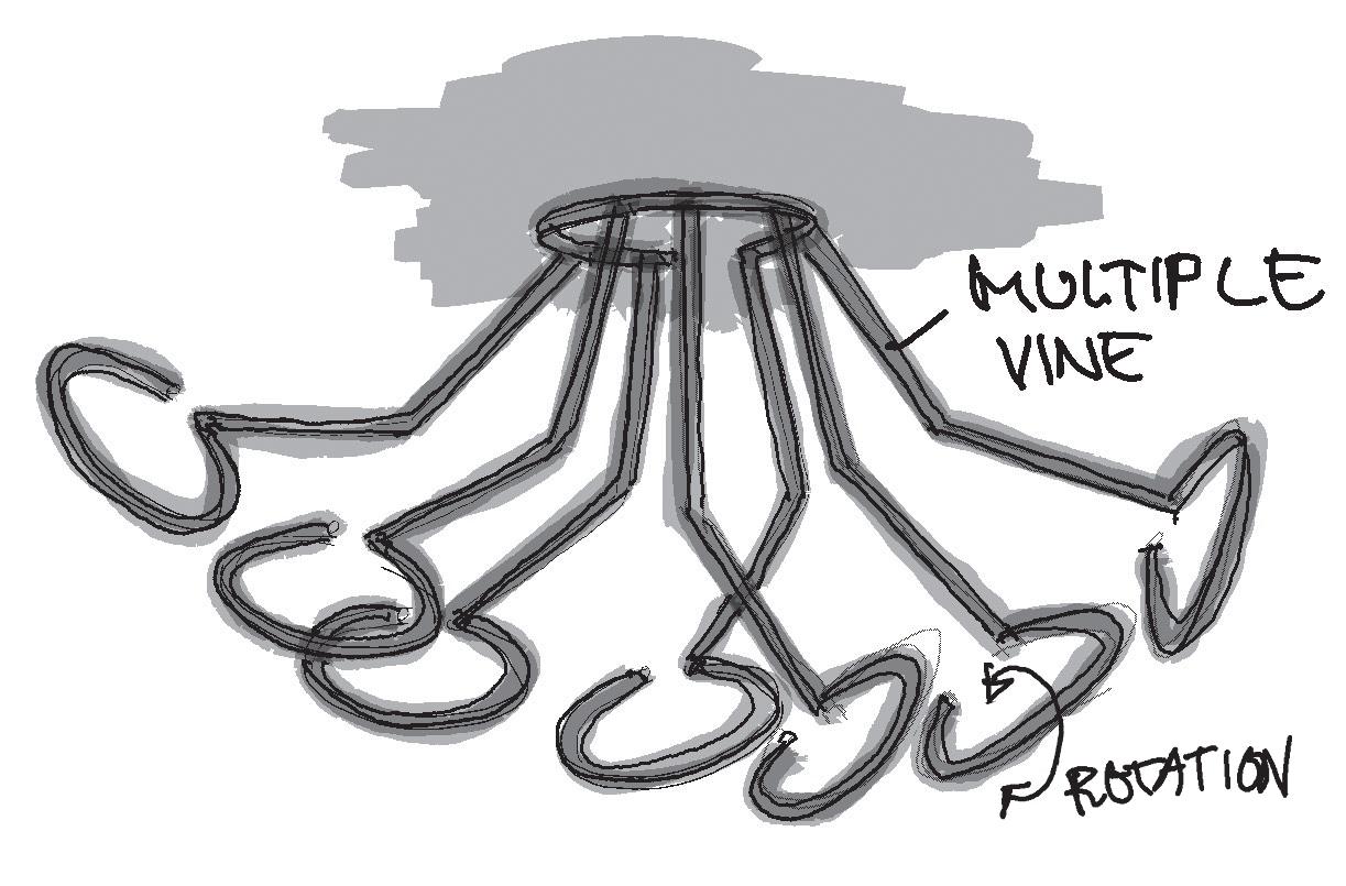 Vine Light chandelier is a suspension lamp that allows anyone to ply the light in their space simply by turning and adjusting the various heads, encouraging direct interaction to become authors of your own light.