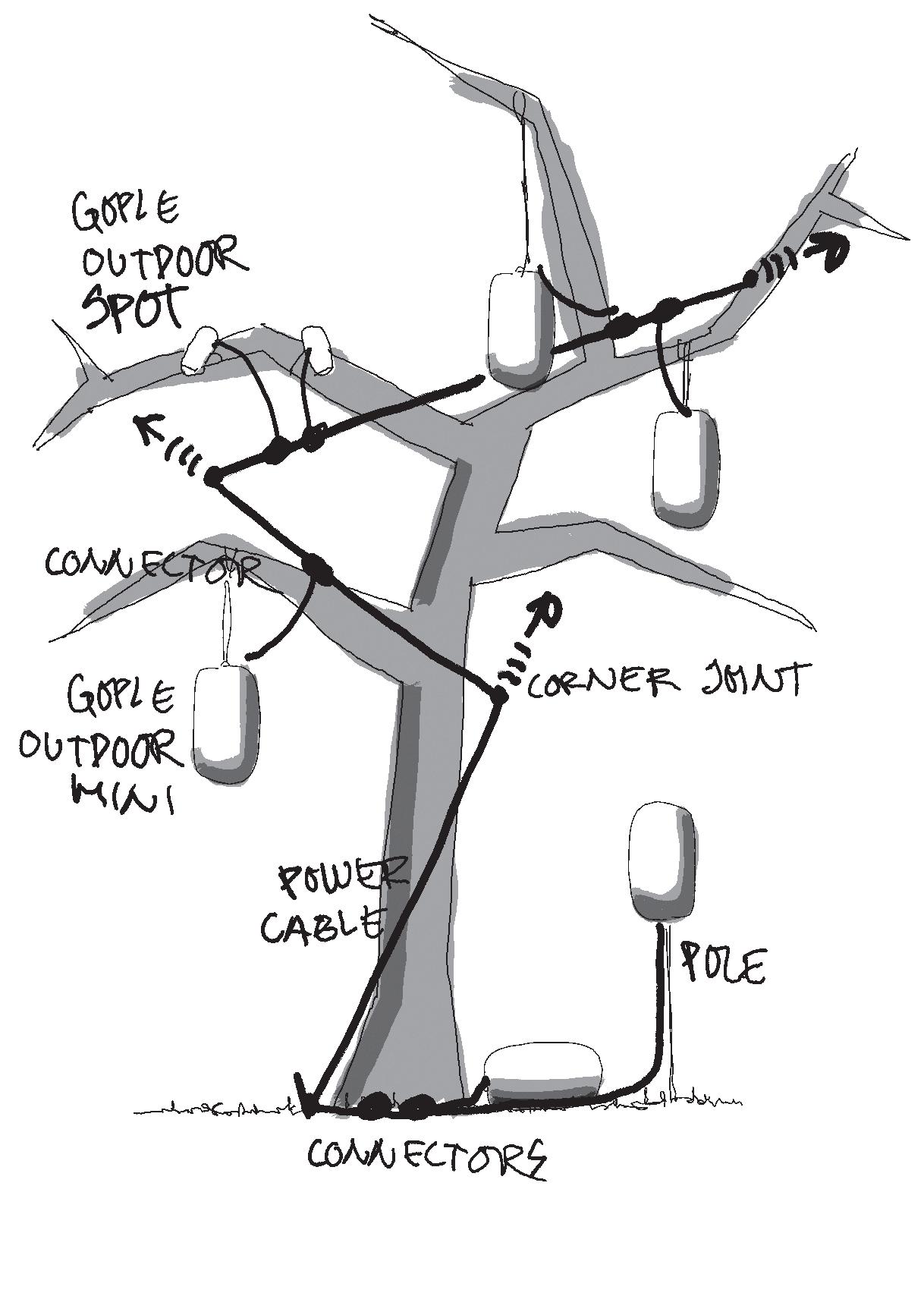Special fixing elements, brancher that split the power supply cables and cables that embrace the branches to secure the lighting elements make up an abacus of elements to allow light to grow freely on trees.