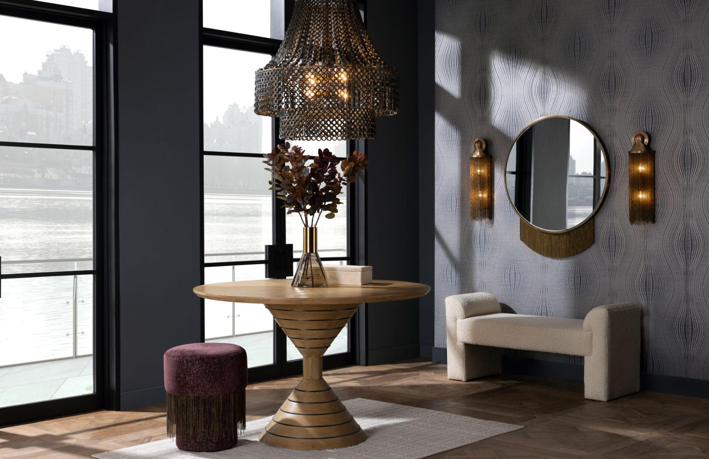 PG. 26/27 IMAGE: FOI03 TWYLA OTTOMAN, FDS03 WILKEN ENTRY TABLE, UNION VASES – SET OF 3 (MEDIUM SIZE SHOWN), ARS04 TERRAZAS BOX, DMS02 HANNIE CHANDELIER, FHU01 WINDEMERE BENCH CREAM SHERPA, DWI05 VANKO SCONCE (TWO SHOWN), WMI04 WINCHESTER MIRROR