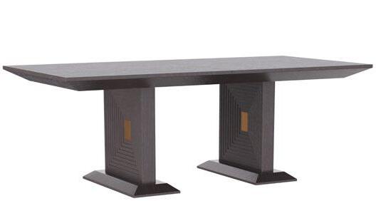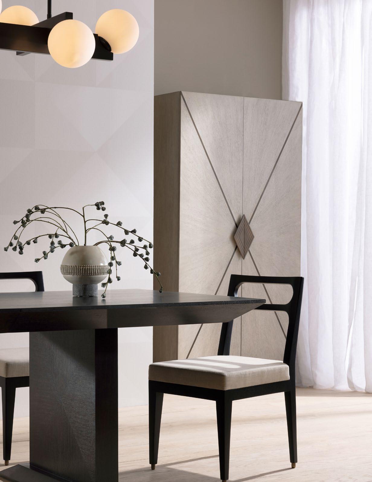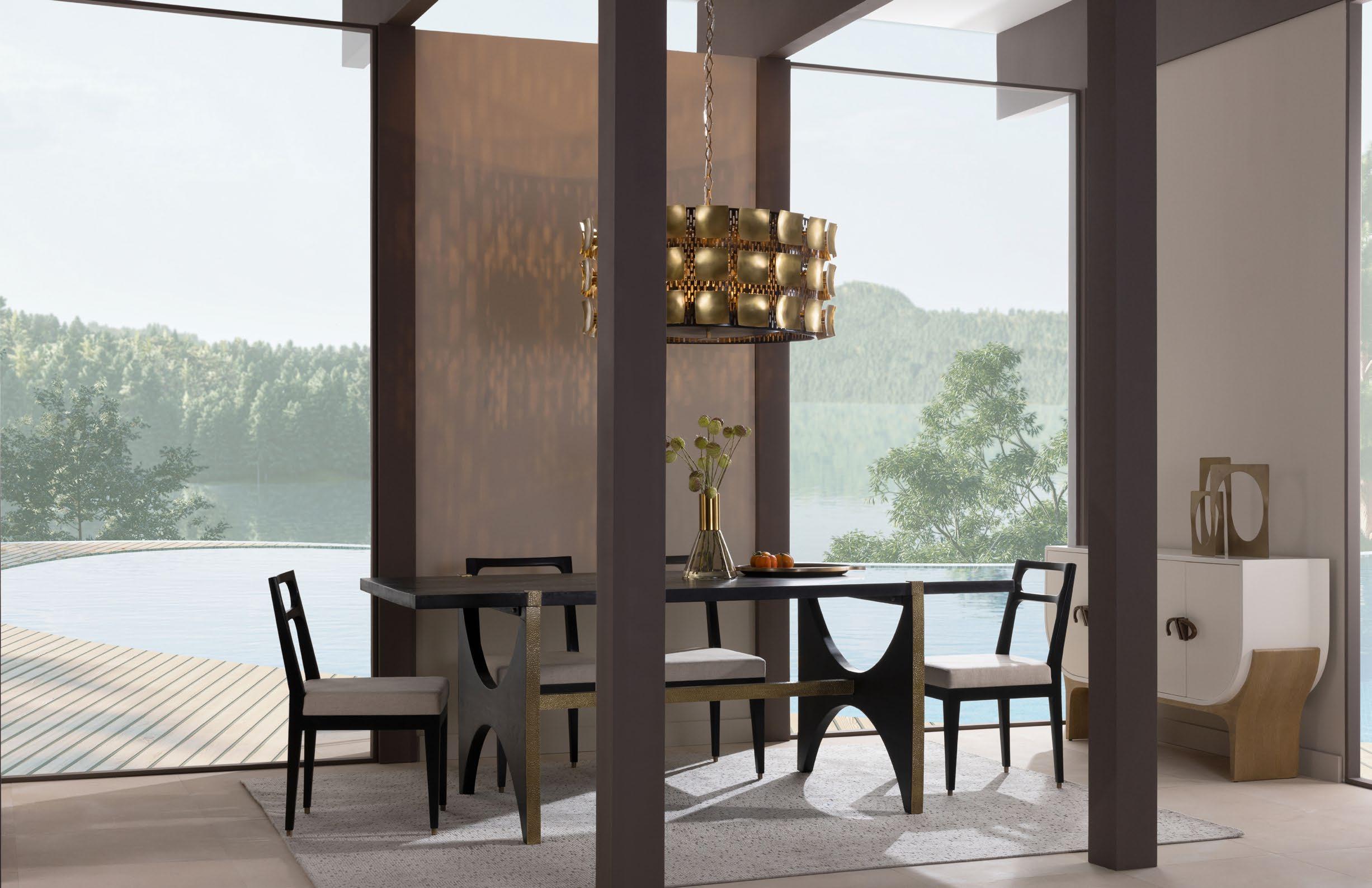 32 DEEP LUXE | S23 PG. 32, IMAGE 1: GDFEI01 MOSQUITO END TABLE, GDATI01 LUNA CENTERPIECE IMAGE 2: DSI02 VELLA CHANDELIER PG. 33 IMAGE: FNS04 TIDWELL CABINET, FDS01 TILLER DINING TABLE, AYI01 TALLULAH TRAY, 6784 UNION VASES – SET OF 3 (LARGE SIZE SHOWN), 4867 GALANTIS CENTERPIECE, DLC07 TOWNE CHANDELIER