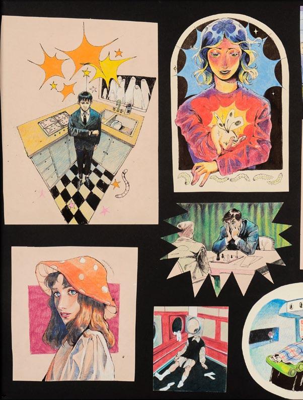 My artwork is an exploration of the experience of time through a collage of ink and colour pencil illustrations. The concept of time makes me appreciate the absurdity of everyday experiences and I hoped to capture this feeling in my work. Taking inspiration from comic-style art, I used water-based inks to create linework and rendered using coloured pencils and watercolour. I used colour more expressively than literally, choosing complementary and analogous colours to create movement, focus and interest.