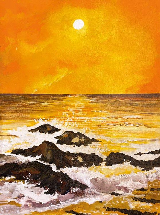 of the tides, and often covered in lichen, are rich and varied. I aim to capture the moment of impact of the rushing waves against the rocky foreshore or cliff face, and the ensuing explosion of power and energy my recent series of paintings has been specifically influenced by the erosion caused by weather or tides, and the resulting formations made over hundreds of years, carving into the landscape and shoreline. I mainly work in acrylic, and texture and colour are an essential part of all my work.”