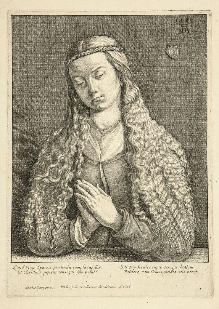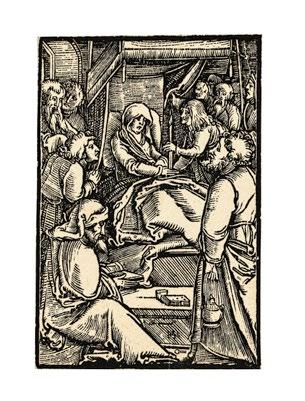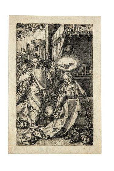 Wie so häufig, nimmt Aldegrever auch für seine Verkündigung von 1553 unmittelbar Bezug auf sein großes Vorbild Dürer, dessen entsprechende Komposition aus der Kleinen Holzschnittpassion er hier virtuos paraphrasiert, gleichsam amalgamiert mit Elementen des Antwerpener Manierismus, worauf S. Sell überzeugend hingewiesen hat: This stylistic influence is particularly notable in the decorative and artificial puckering of the drapery, which is echoed in the wrinkled clouds. As Stephen Goddard has pointed out in relation to Aldegrever’s Nativity, Carel van Mander criticized Aldegrever for his depictions of drapery, which the biographer considered “confused, with too many folds and wrinkles.” This fascination with ornamental detail is prominent throughout the engraving, imparting a metallic hardness to all the surfaces. The attention to surface pattern recalls Aldegrever’s role as an engraver of ornamental prints, which were often used as models by craftsmen and decorative artists. Also characteristic of Aldegrever’s work are the figure types, with their knobby, expressive hands and somewhat cramped composition, with the figures pushed close together in the foreground, enhancing the decorative surface effect.
