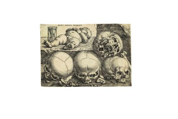 Das italienische Motiv eines Puttos mit Totenkopf ist hier von Beham, bei dem die Kenntnis italienischer Vorbilder vorausgesetzt werden kann, zu einer Situation eines Karners assoziierenden Komposition mit totem Kind und Totenschäden umgestaltet. Damit wurde eine aktuelle, prägnante und vielrezipierte Bildformel für den im Spätmittelalter allgegenwärtigen Gedanken der Vanitas, der Vorstellung von der Vergänglichkeit und Kürze des Lebens und der Allgegenwart des Todes, geprägt. Das vorliegende Blatt ist Behams komplexeste Bildschöpfung dieser Art, die durch den die Verkürzung gegebenen liegenden Knaben und die in unterschiedlichen Ansichten gezeigten Totenschädel auf jeweils verschiedenen Ebenen eine zusätzliche Spannung erhält. Spätere Abdrucke zeigen – als dritten Plattenzustand – das Fehlen der rechten oberen Ecke der Druckplatte, womit der im Thema angelegte und mit dem Vanitas Gedanken verbundene Aspekt des Ruinösen noch unterstrichen wird. In einer 1614 datierten seitenverkehrten Kopie dieser erfolgreichen, vielrezipierten Bildschöpfung von Lucas Kilian (1579 1637) ist auch dieses Detail wieder aufgenommen worden. (C. Wiebel)