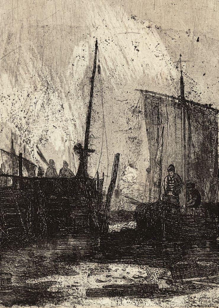 The clouds partially brightened again through polishing, specifically above the shrub along the left-hand side edge, as well as above the signature on the right. The smoke is intensified. (State B.b.III = Winterberg 58,I)
