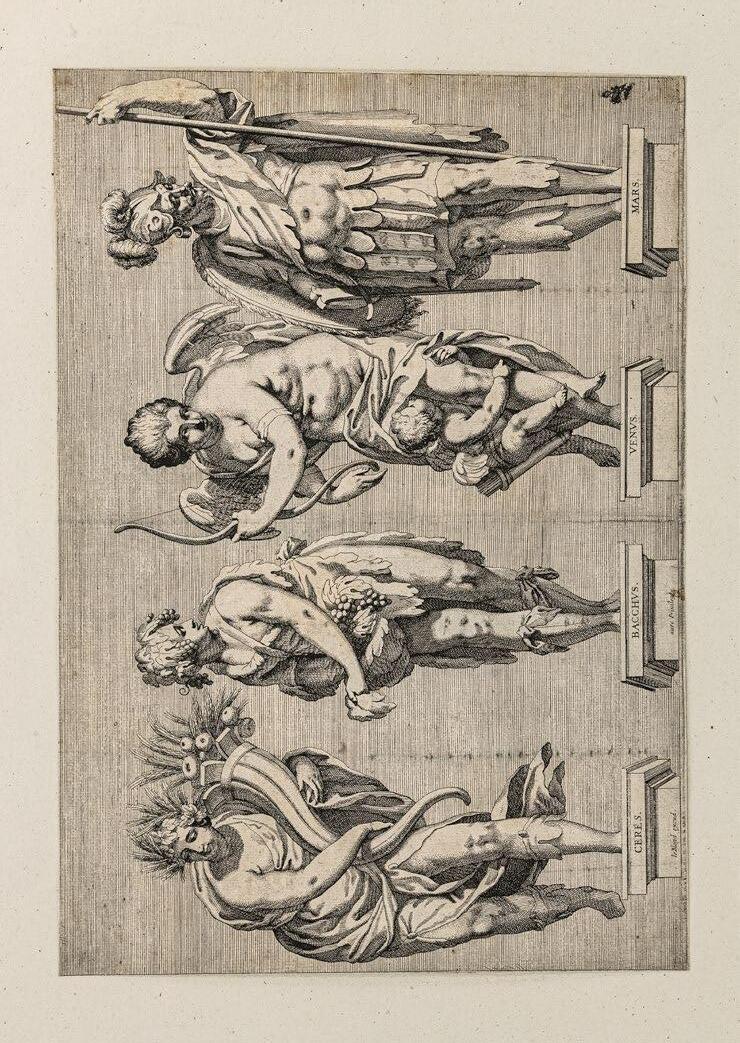 Mit vier durchaus monumentalen, zugleich aber in ihren individuellen Bewegungsmustern überaus graziösen Skulpturen römischer Gottheiten will uns Jean LeBlond I., in dessen Verlag das nicht weiter bezeichnete Blatt erschien, hier bekannt machen. Die trotz ihrer betont kräftigen Leibesmitte gelängten, raffiniert gedrehten Gestalten von Ceres, Bacchus, Venus und Mars scheinen fast zu schweben, gleichsam abheben zu wollen von ihren beschrifteten Postamenten. Sie kommen damit einem Stilideal nahe, das J. Bellange am Herzoglich-Lothringischen Hof in Nancy zu Beginn des 17. Jahrhundert kultiviert und durch seine Radierungen verbreitet hatte. Es mag sein, daß selbst der anonym bleibende Radierer unseres Blattes an dessen feinsinnige Radiertechnik, die Strichlagen und subtil modellierende Pünktchen raffiniert kombinierte, anzuknüpfen bestrebt war, als er die vier manieristischen Götterstandbilder vor einheitlich horizontal schraffiertem Hintergrund platzierte – so wie Bellange seine Apostel wenige Jahre zuvor.
