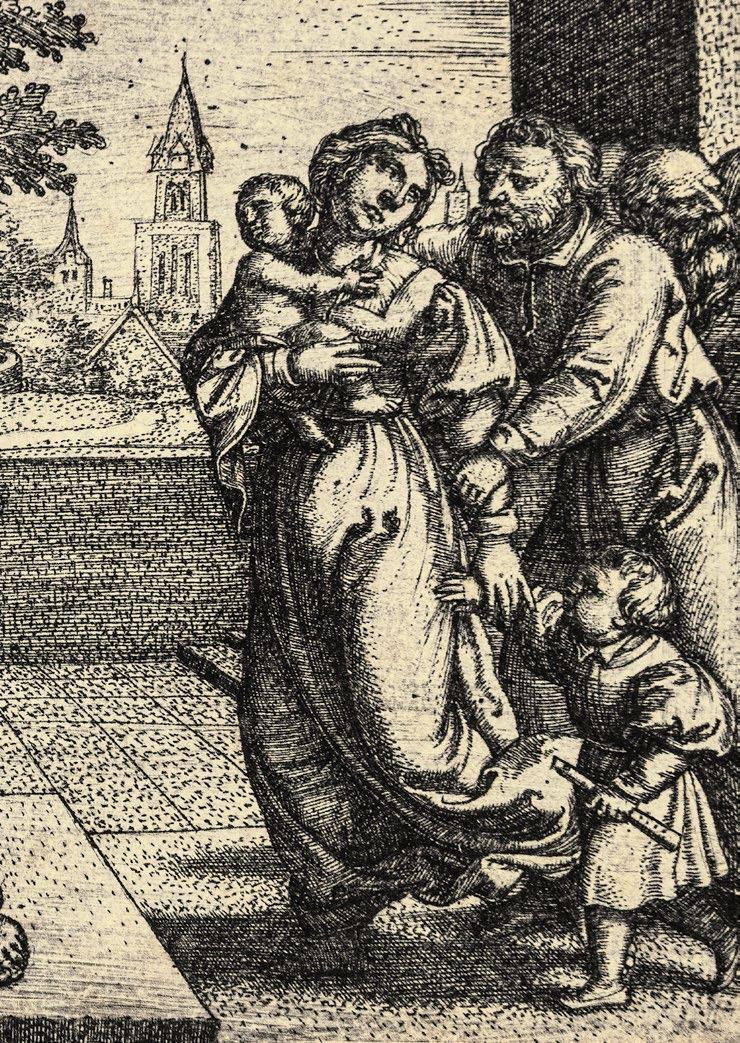 In his Annunciation of 1553, Aldegrever refers – as is often the case – to his great model Dürer, whose counterpart from the Small Woodcut Passion he paraphrases with virtuosity, at the same time amalgamating it with elements of Antwerp Mannerism, as S. Sell has convincingly shown: This stylistic influence is particularly notable in the decorative and artificial puckering of the drapery, which is echoed in the wrinkled clouds. As Stephen Goddard has pointed out in relation to Aldegrever’s Nativity, Carel van Mander criticized Aldegrever for his depictions of drapery, which the biographer considered “confused, with too many folds and wrinkles.” This fascination with ornamental detail is prominent throughout the engraving, imparting a metallic hardness to all the surfaces. The attention to surface pattern recalls Aldegrever’s role as an engraver of ornamental prints, which were often used as models by craftsmen and decorative artists. Also characteristic of Aldegrever’s work are the figure types, with their knobby, expressive hands and somewhat cramped composition, with the figures pushed close together in the foreground, enhancing the decorative surface effect.