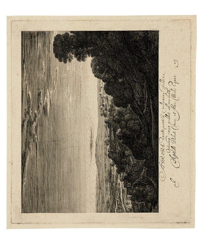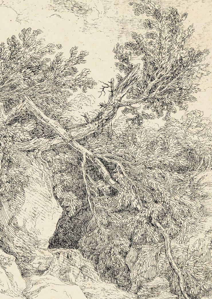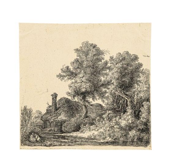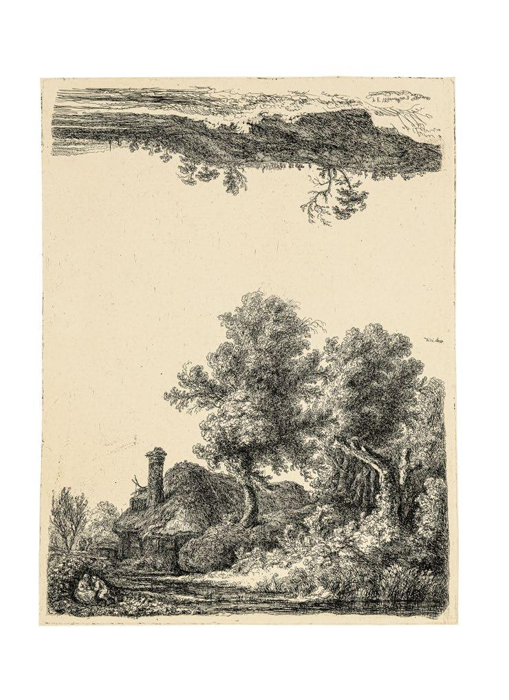 On the lower half of the vertical copperplate, The Cottage beneath the Large Trees was etched without sky. Inscribed along the right-hand edge with “Weirotter.” Prior to the uppermost scene. (state A.I).